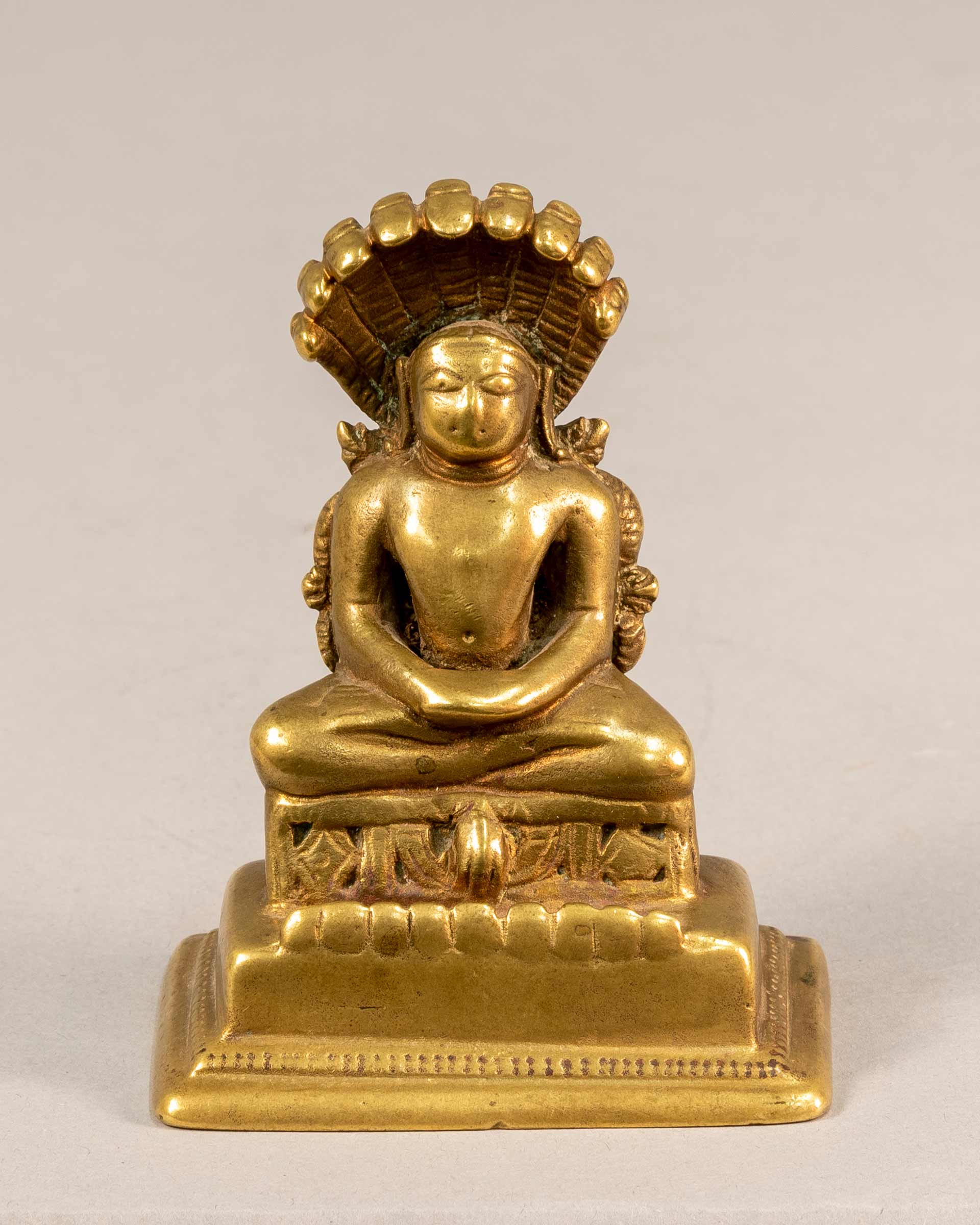 Jain Deity Sculpture In Jainism, the Tirthankaras, or enlightened beings, are often depicted with a multi-headed naga above their heads, symbolizing protection and spiritual power. India, Gujarat Brass Late 19th century or earlier Gift of Robert C. and Donna M. Spina Helmholz 2020.02.0007