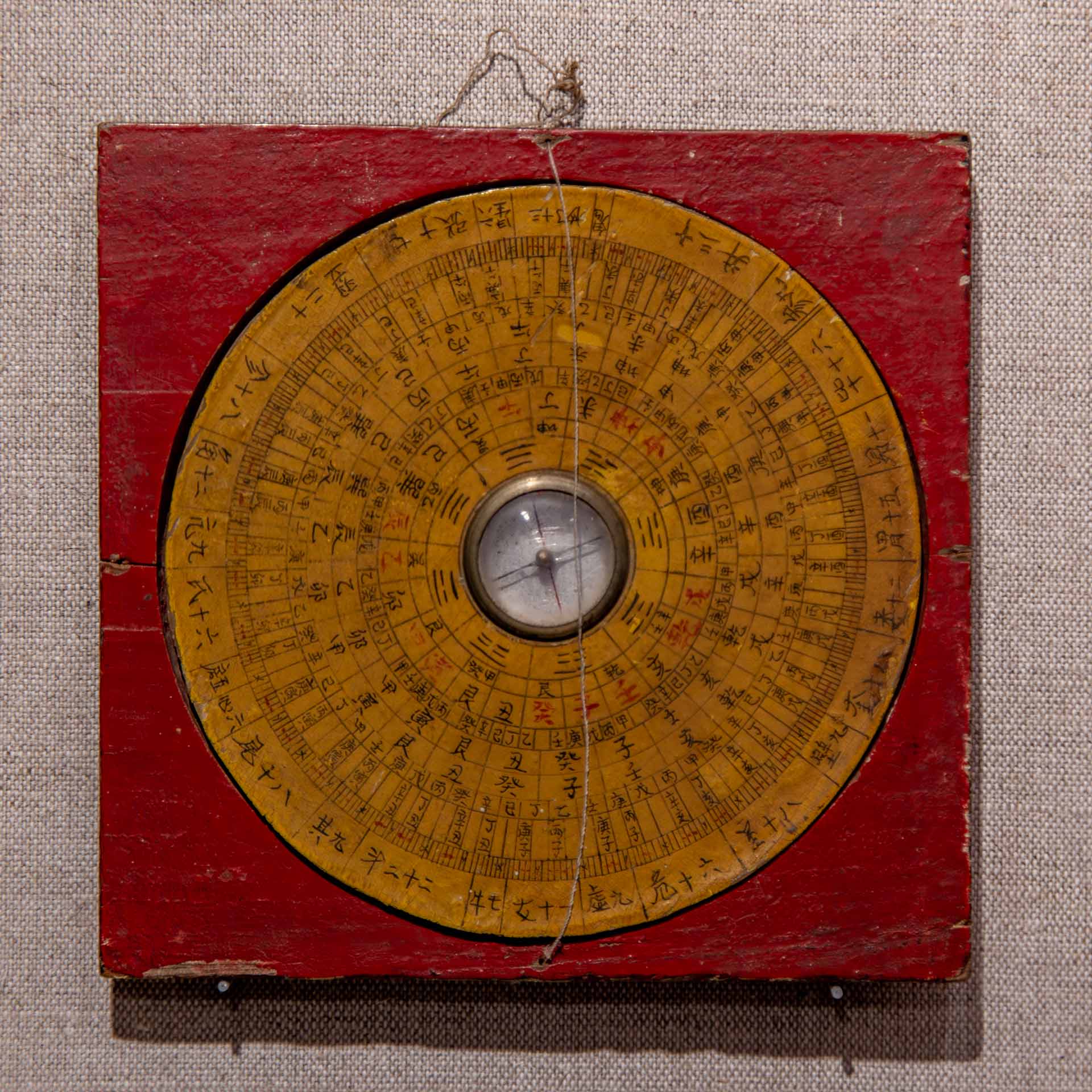 The wooden square base represents the Earth, while the round plate represents the heavens. This is a geometric pattern that frequently appears across Chinese symbology and design. In the center of the device is a South-facing compass. On historical Chinese compasses and luopan, south is positioned at the top.