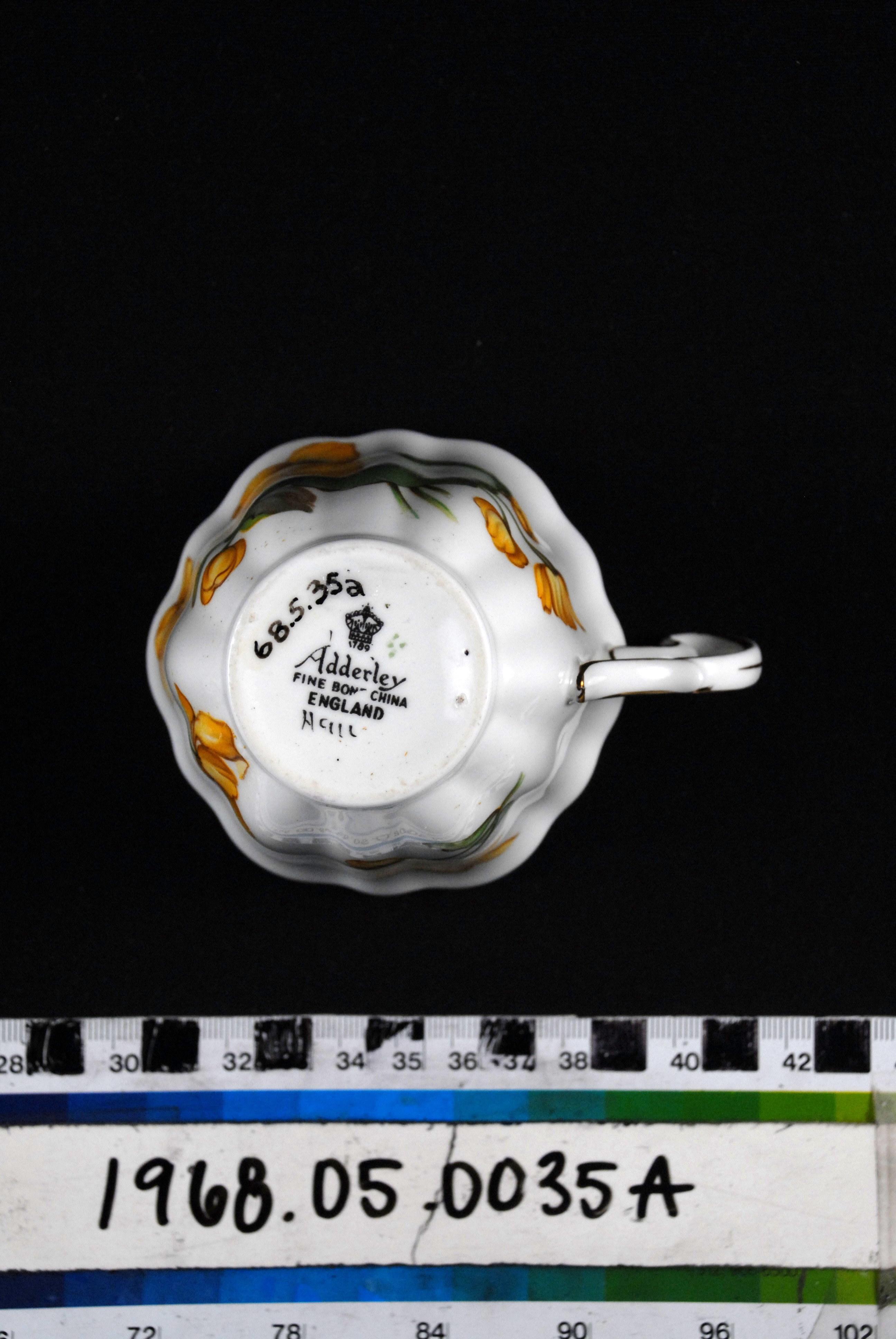 | Artist/Maker | Manufacturer's stamp on base: Logo depicts a crown with 1789 at base. “Adderly, Fine Bone China, England“ Artist's mark on base: Four green dots in the shape of a diamond. |