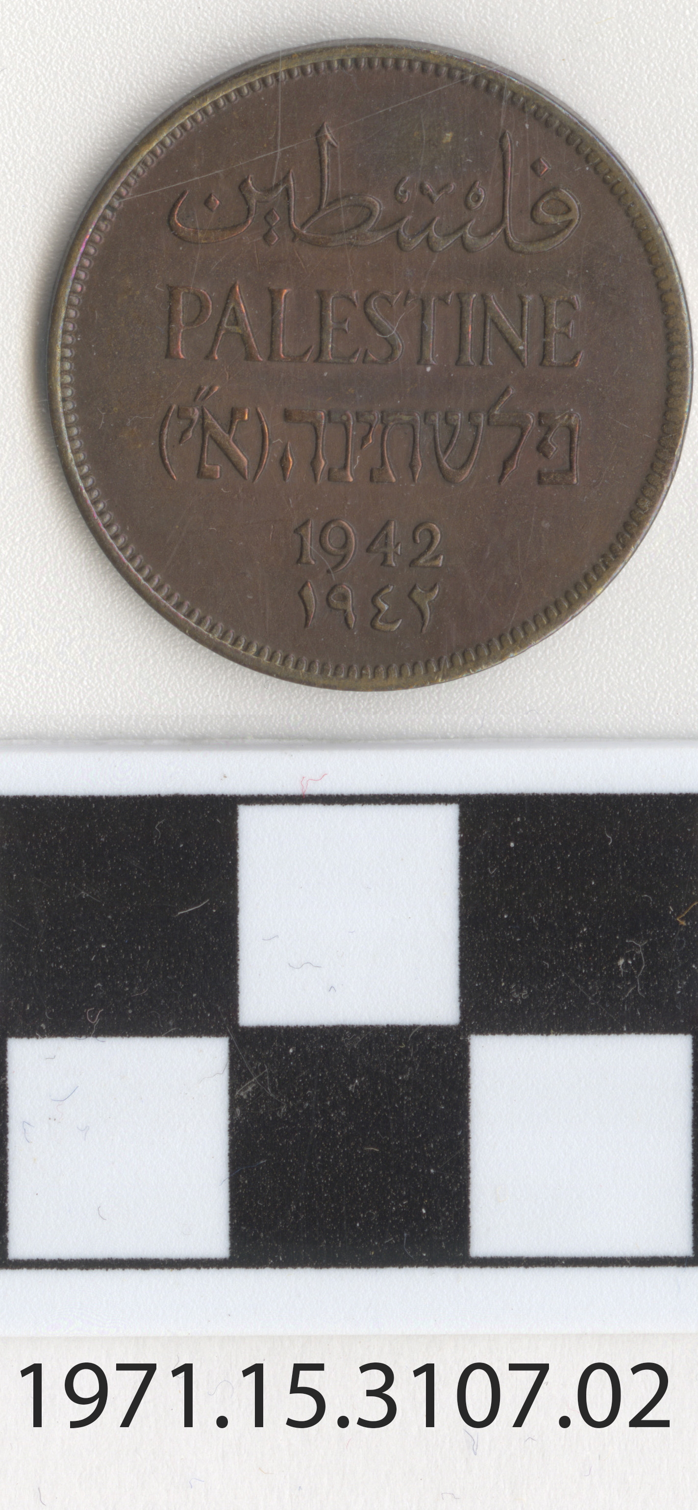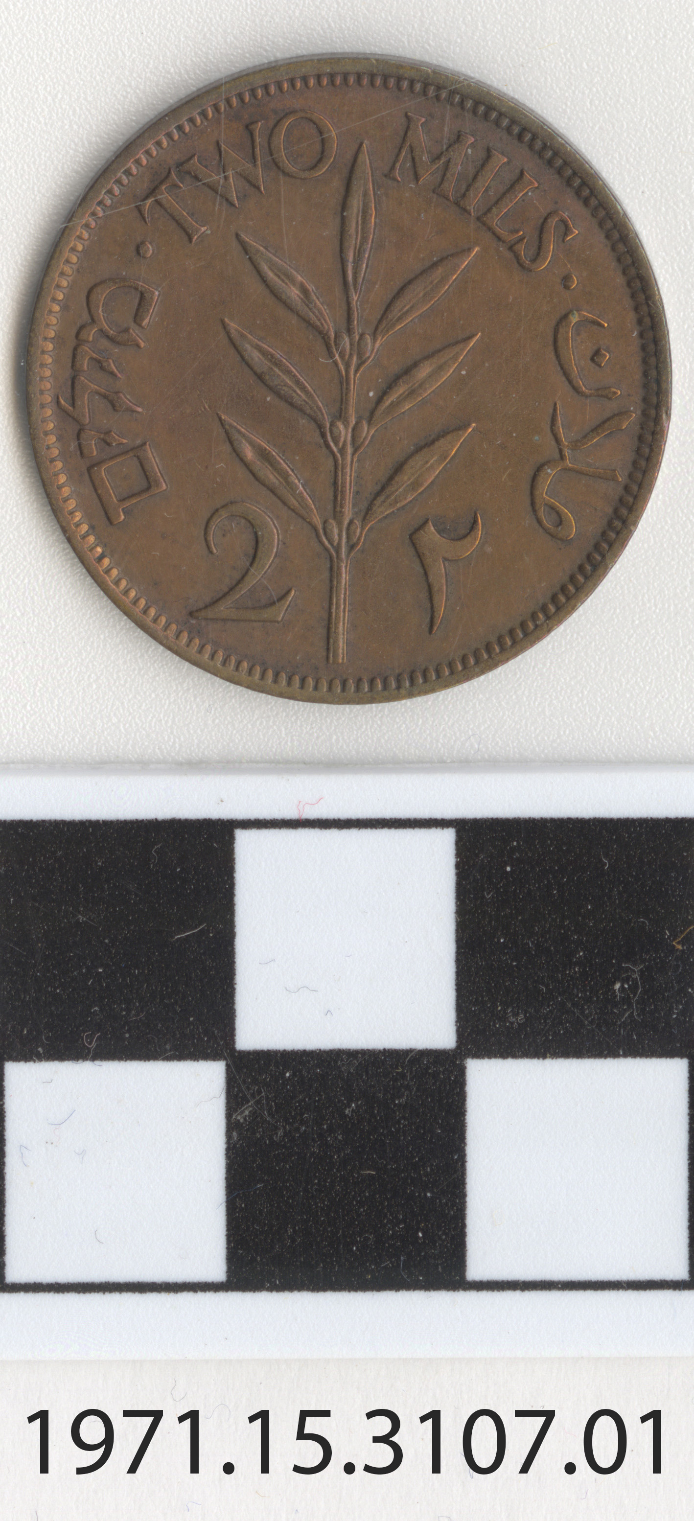 | Artifact Identification | Coin: Palestine, 2 Mils (1971.15.3107) |