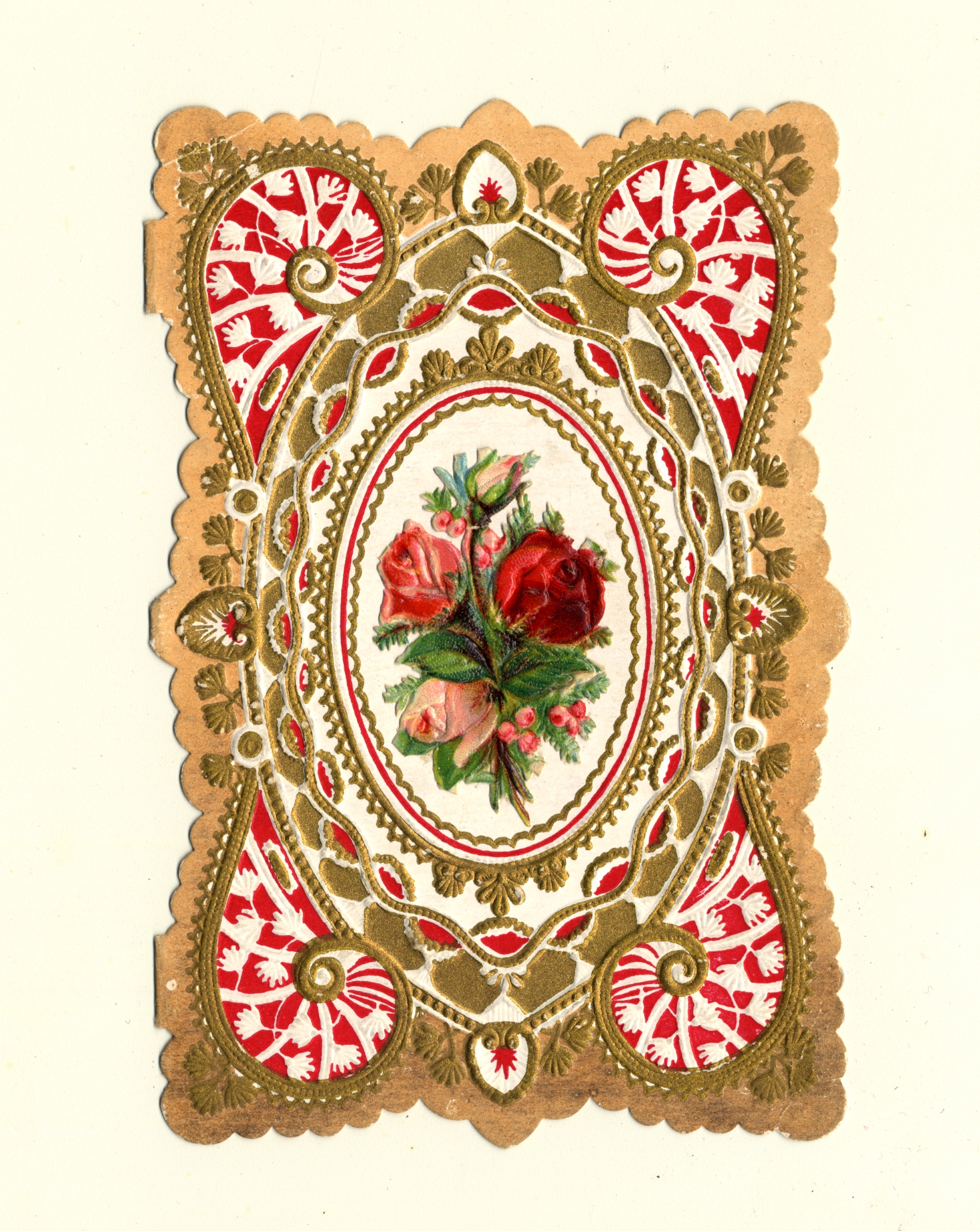 | Description | The “sentimental” Valentines of the 19th-century earned their name by frequently featuring Christian symbols, children, animals, and other saccharine images and themes. What made Valentines popular as greeting cards was their ability to convey strong emotions. Therefore, the designs of these Valentine types were meant to captivate an audience that found more wholesome love messages appealing. This card demonstrates the sentimental theme by featuring an ornate border with red roses in the center, a scene that is designed to encourage warm and affectionate feelings. |