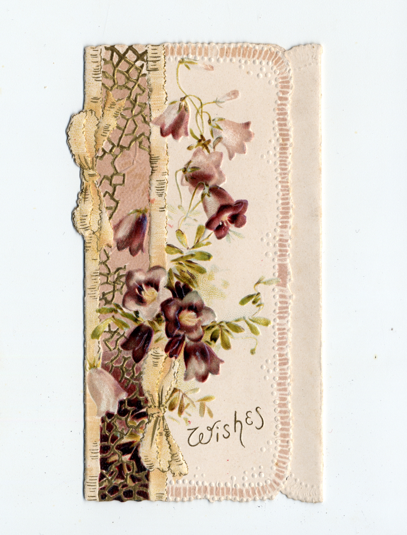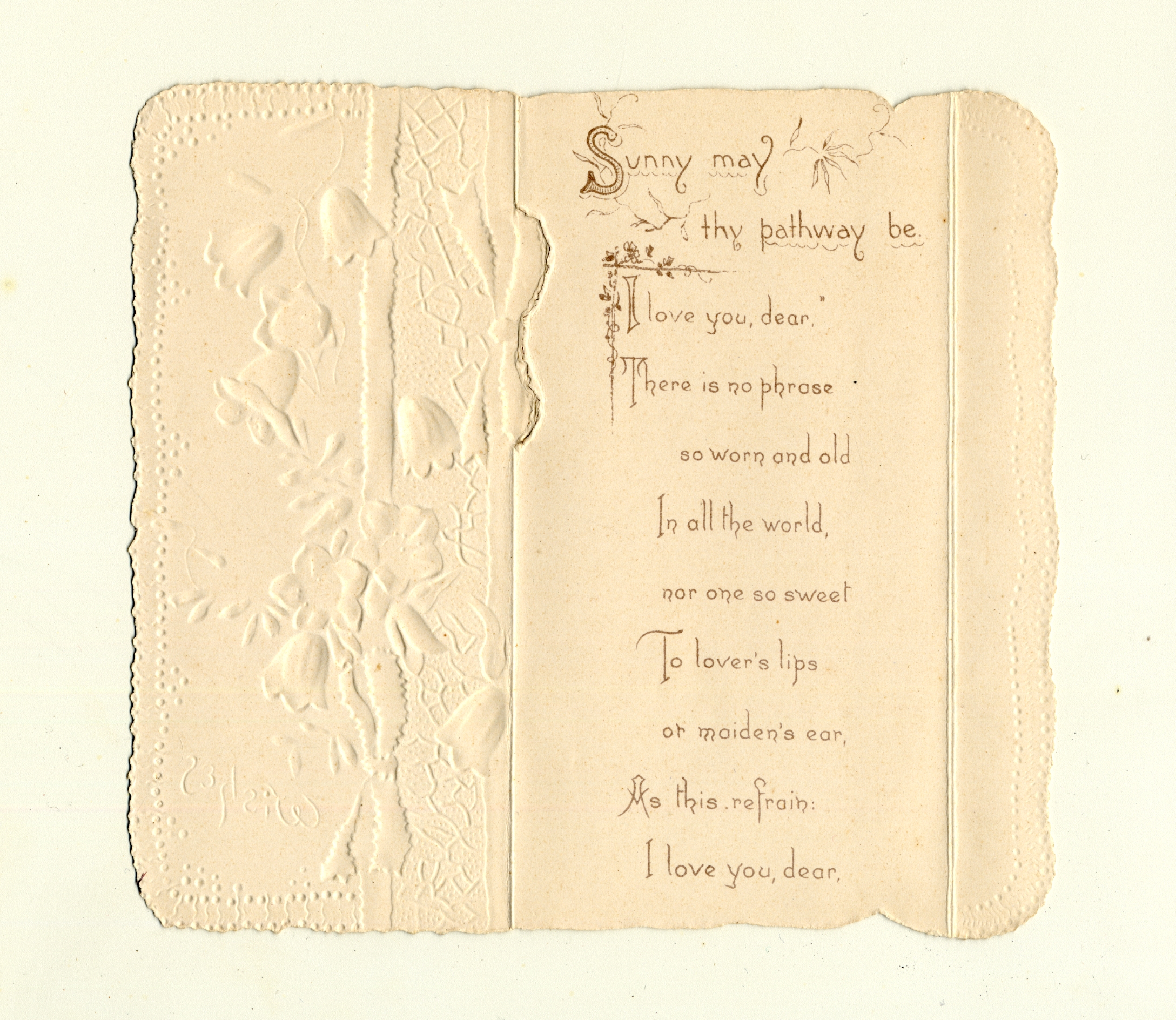 | Description | The “sentimental” Valentines of the 19th-century earned their name by frequently featuring Christian symbols, children, animals, and other saccharine images and themes. What made Valentines popular as greeting cards was their ability to convey strong emotions. Therefore, the designs of these Valentine types were meant to captivate an audience that found more wholesome love messages appealing. This card demonstrates the sentimental theme by including a floral design to accompany a love message. Such an image is meant to encourage warm and affectionate feelings. |