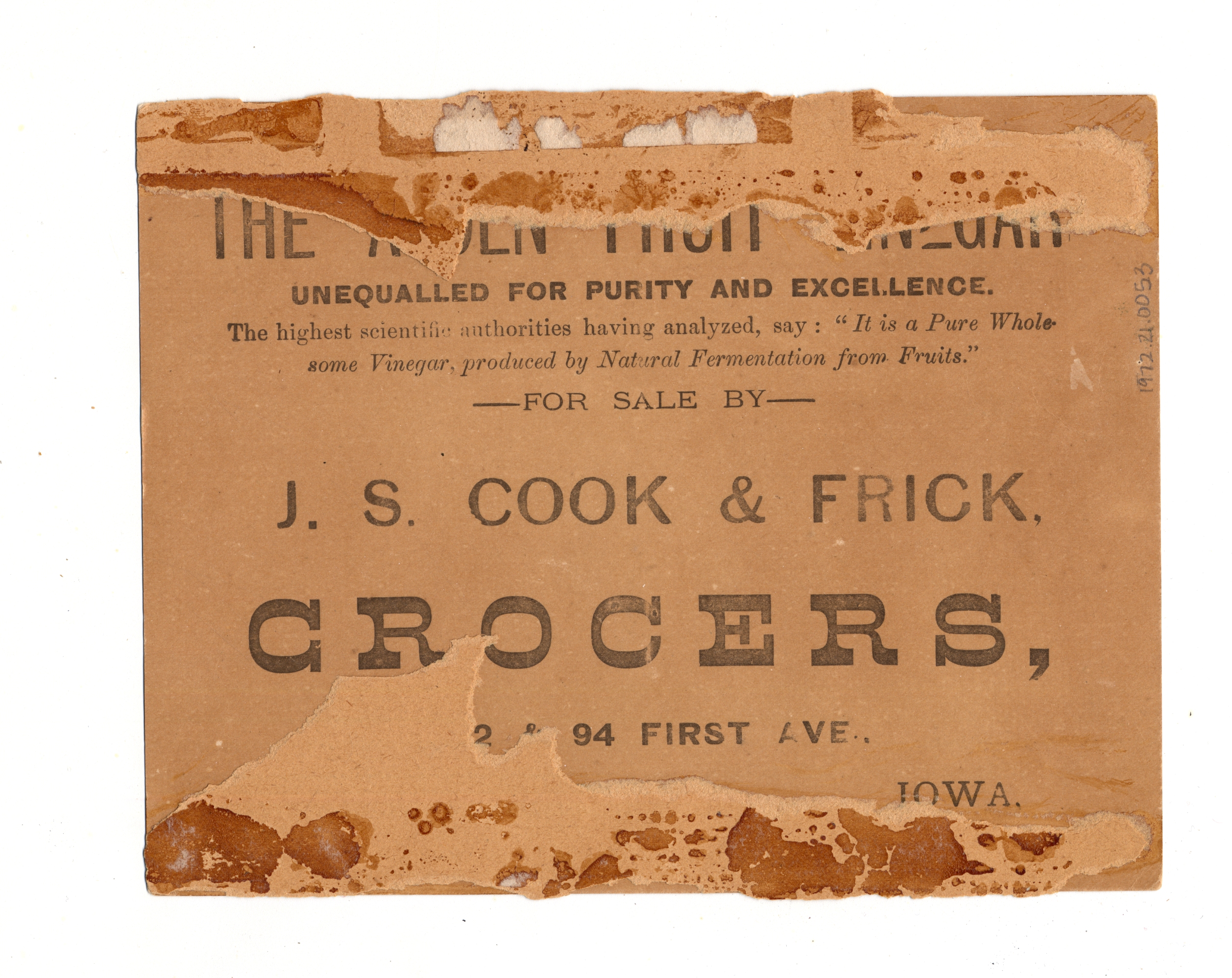Artifact Identification | Business Advertisement Card: Alden's Fruit Vinegar (1972.21.0053) |