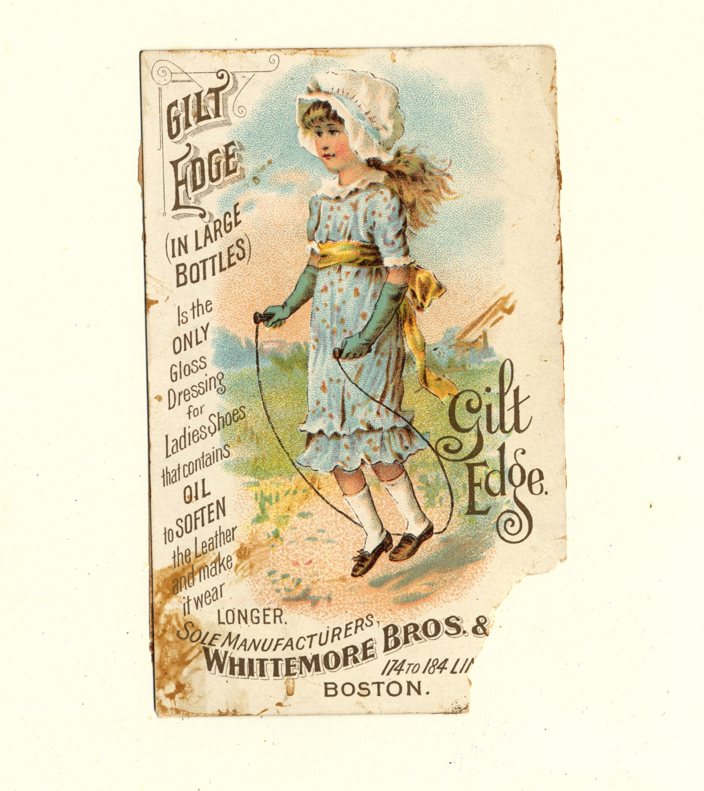 | Description | Advertising cards that featured children and young adults engaging in consumer lifestyles were appealing to young audiences. For young American girls, a demographic that often lived in constraining social environments, these cards were particularly endearing and relatable, especially when they featured girls of the same age group. The girls on the card participating in happy and even adventurous consumer activities were symbolic of what opportunities were available for young women in a new American industrialized era. In this card advertising gloss dressing for women's shoes, a girl can be seen skipping rope outdoors, the implication being that any girl would be in a happier and more comfortable state overall after using the advertised product. |