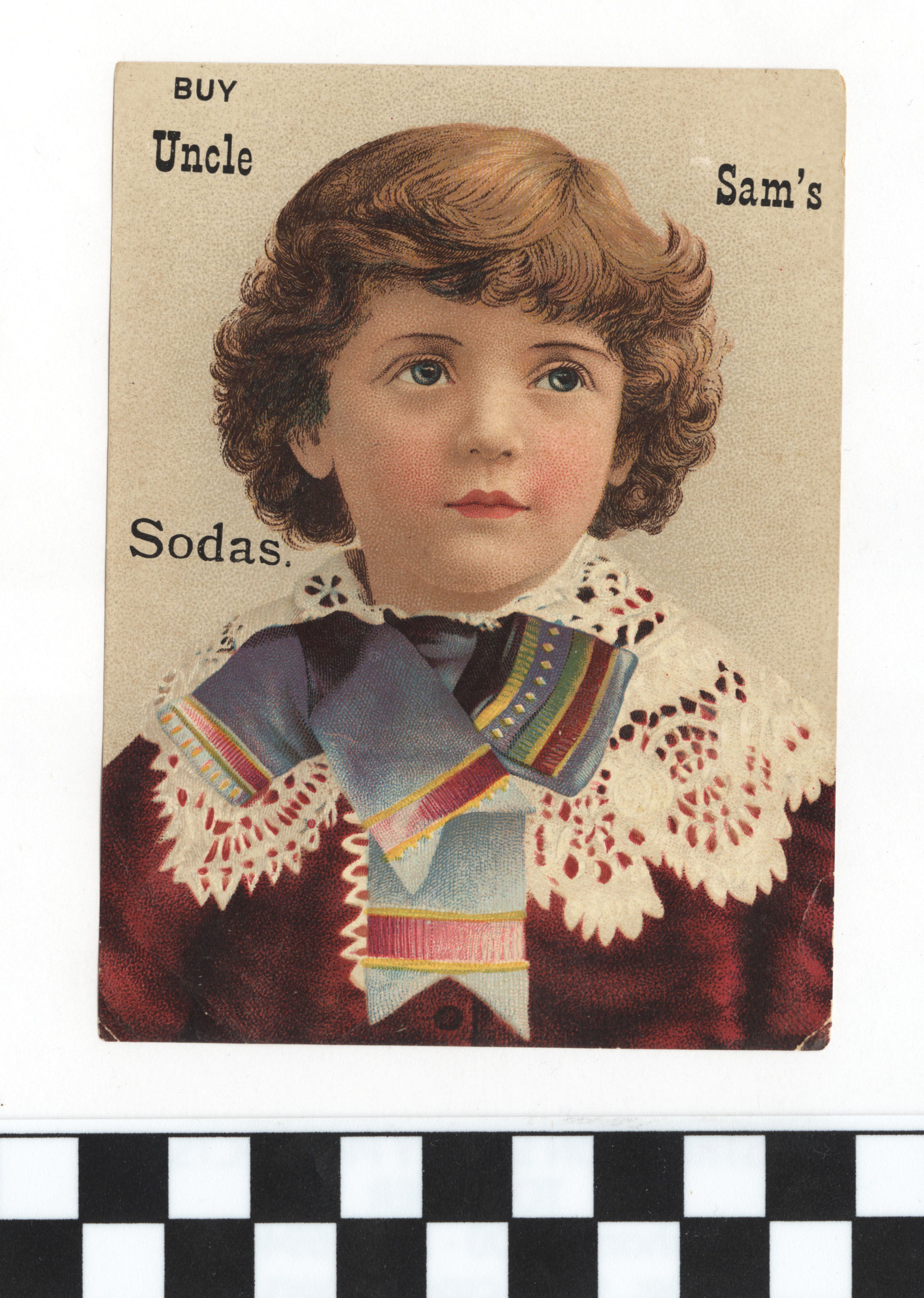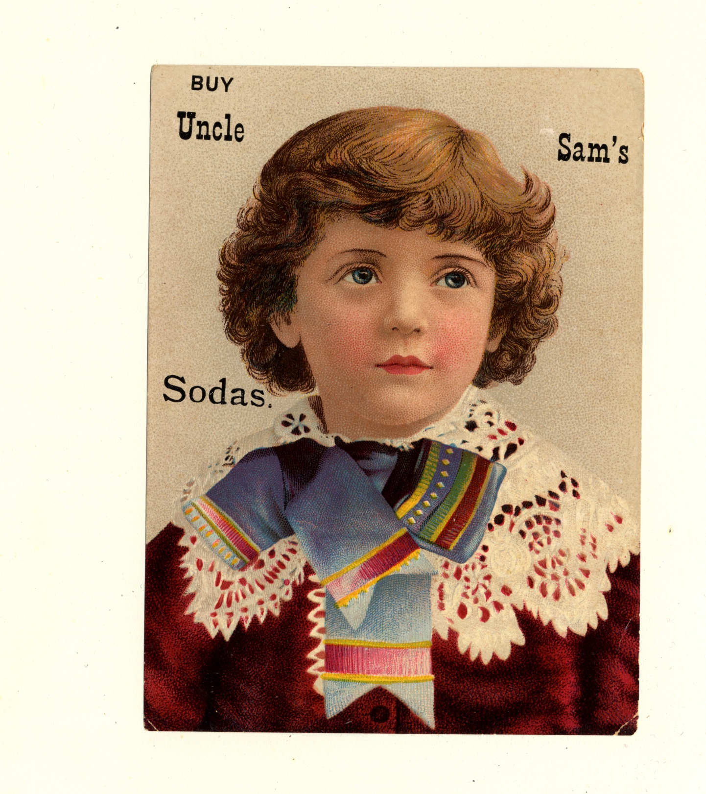 | Description | Children were terrific advertising tools in American trade cards, with producers often using charming images of young people to increase consumer sentiments and facilitate a positive reputation for their brands. Also, these children were often depicted as engaging in consumer lifestyles, a trend that their peers found inspiring. Additionally, some advertisers used sympathy for children–often depicting them as downtrodden or impoverished–to advertise the negative issues of industrialized society. This card for Uncle Sam’s Sodas demonstrates this trend by presenting an elaborately dressed child to help facilitate favorable attention from consumers. |