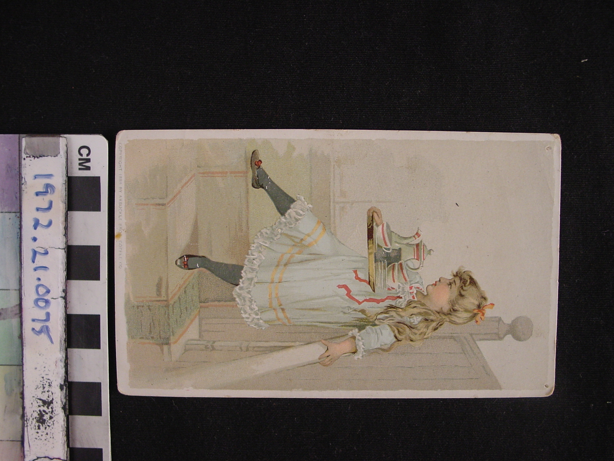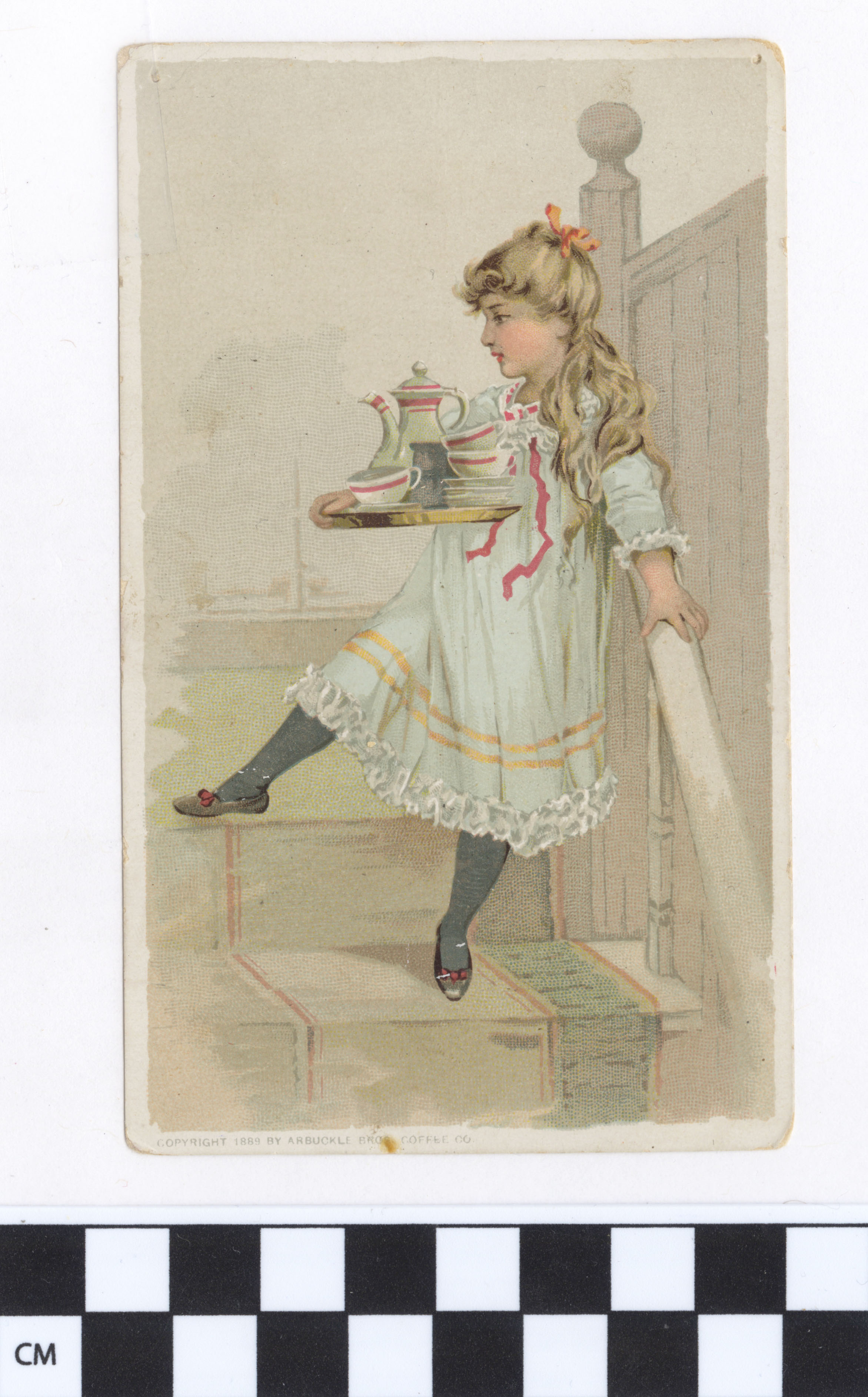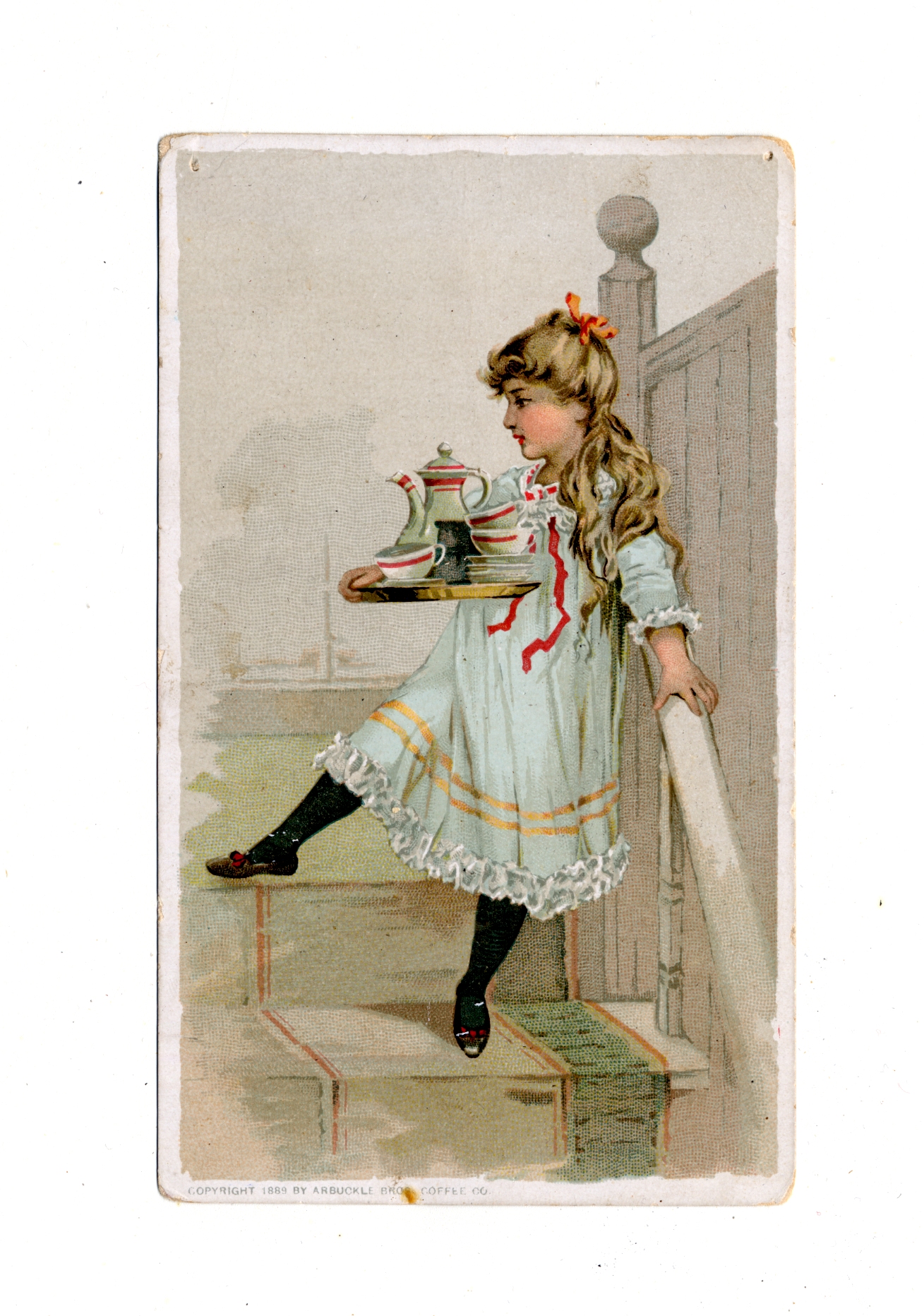 | Description | Advertising cards that featured children and young adults engaging in consumer lifestyles were appealing to young audiences. For young American girls, a demographic that often lived in constraining social environments, these cards were particularly endearing and relatable, especially when they featured girls of the same age group. The girls on the card participating in happy and even adventurous consumer activities were symbolic of what opportunities were available for young women in a new American industrialized era. In this card for Ariosa Coffee, a girl is seen in a domestic setting while also in elaborate dress, indicating that the food product advertised should be associated with a finer quality of life. |