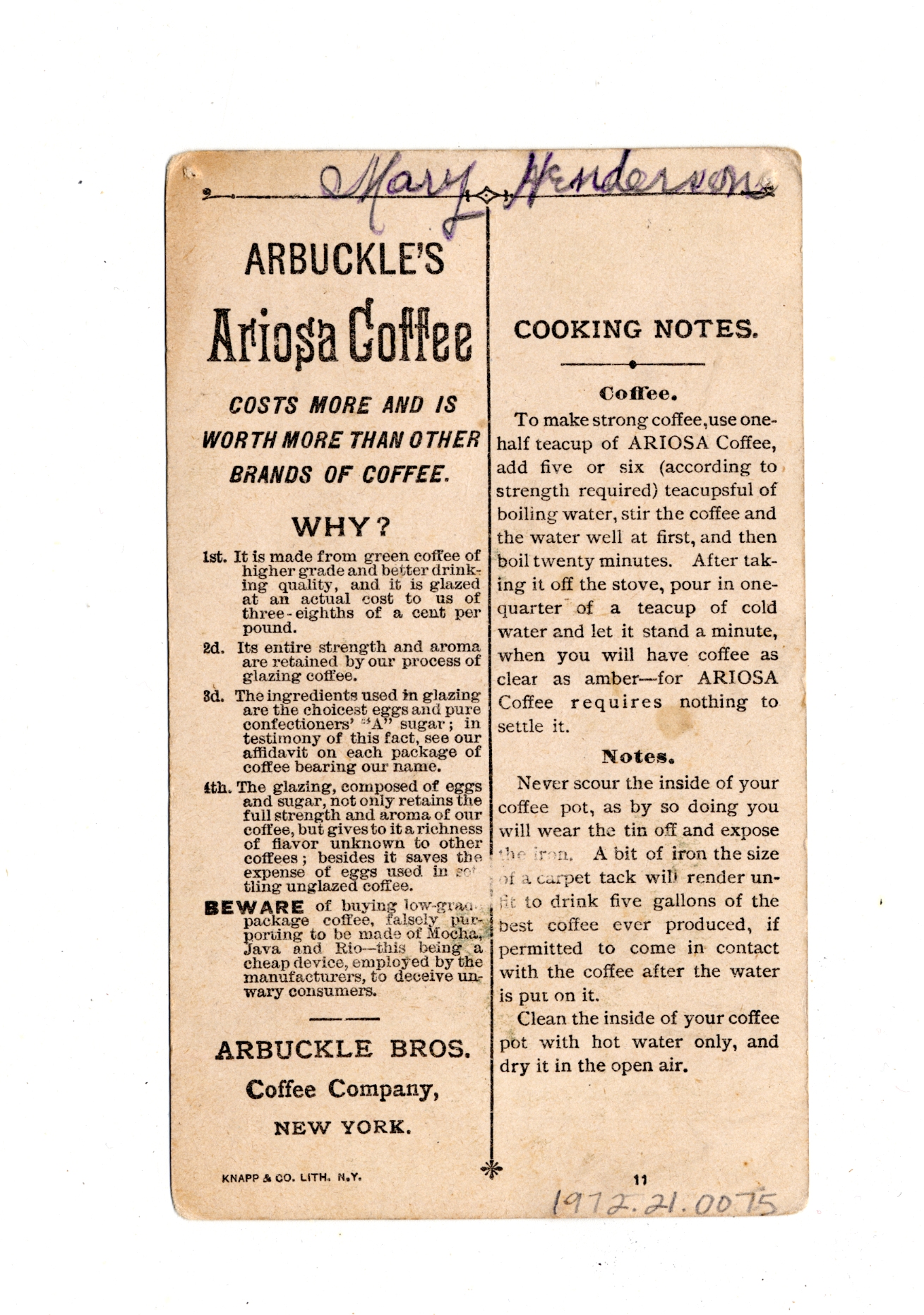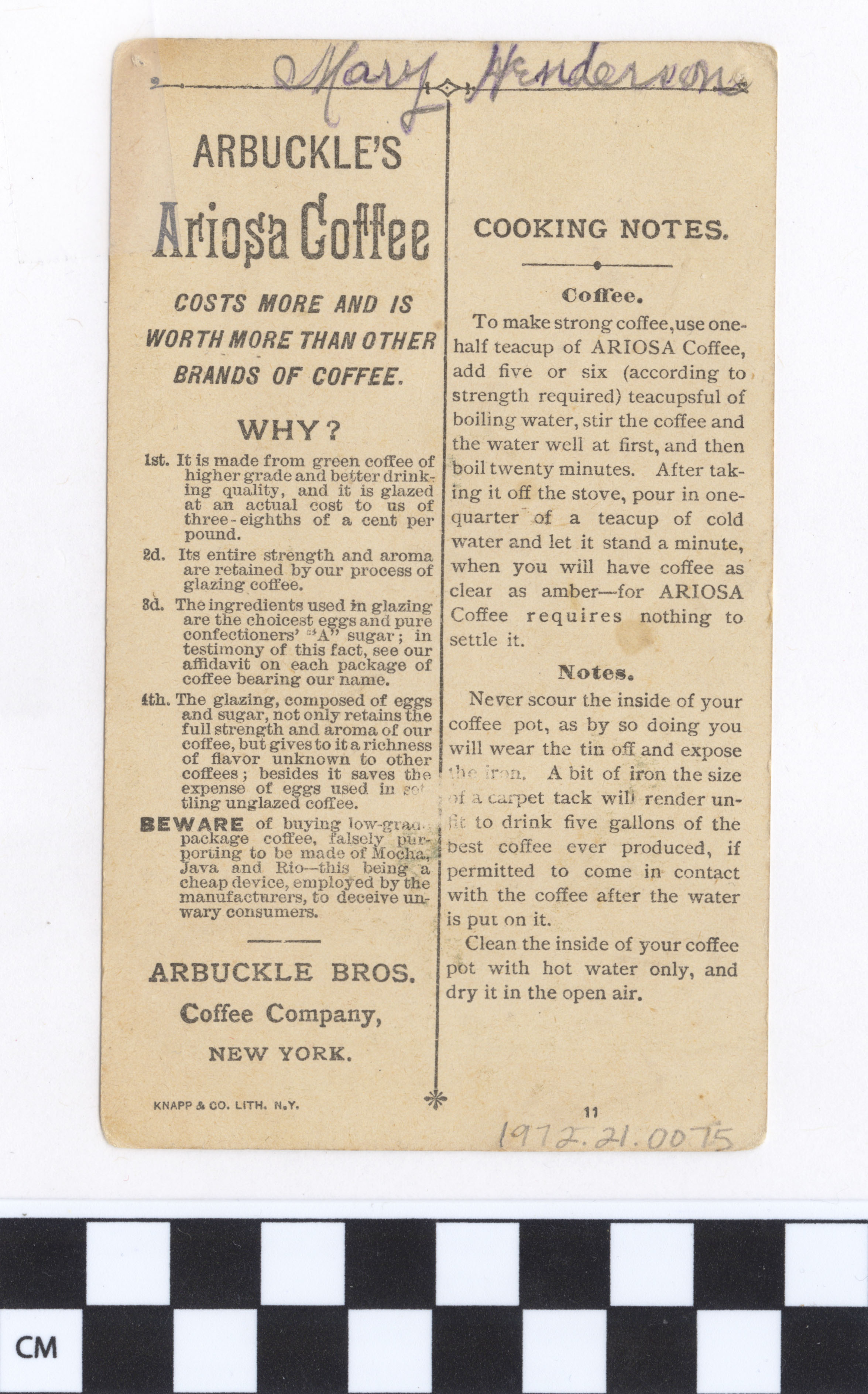 | Artifact Identification | Business Advertisement Card: Ariosa Coffee (1972.21.0075) |