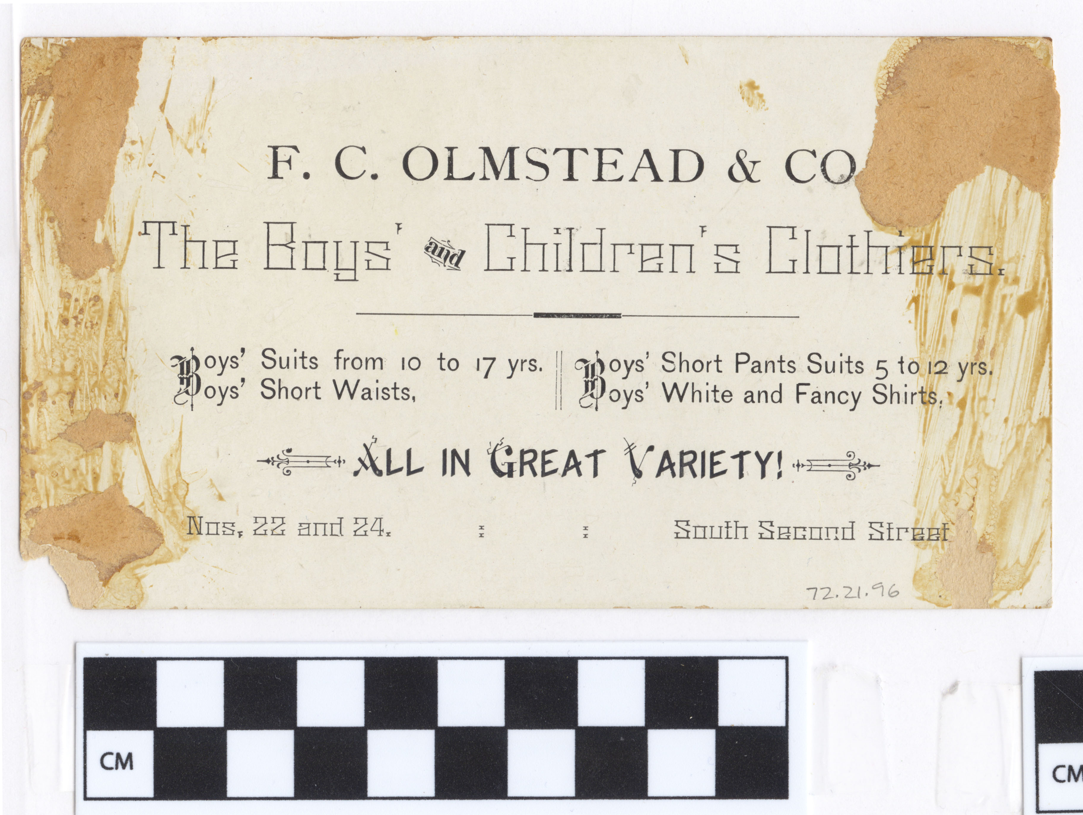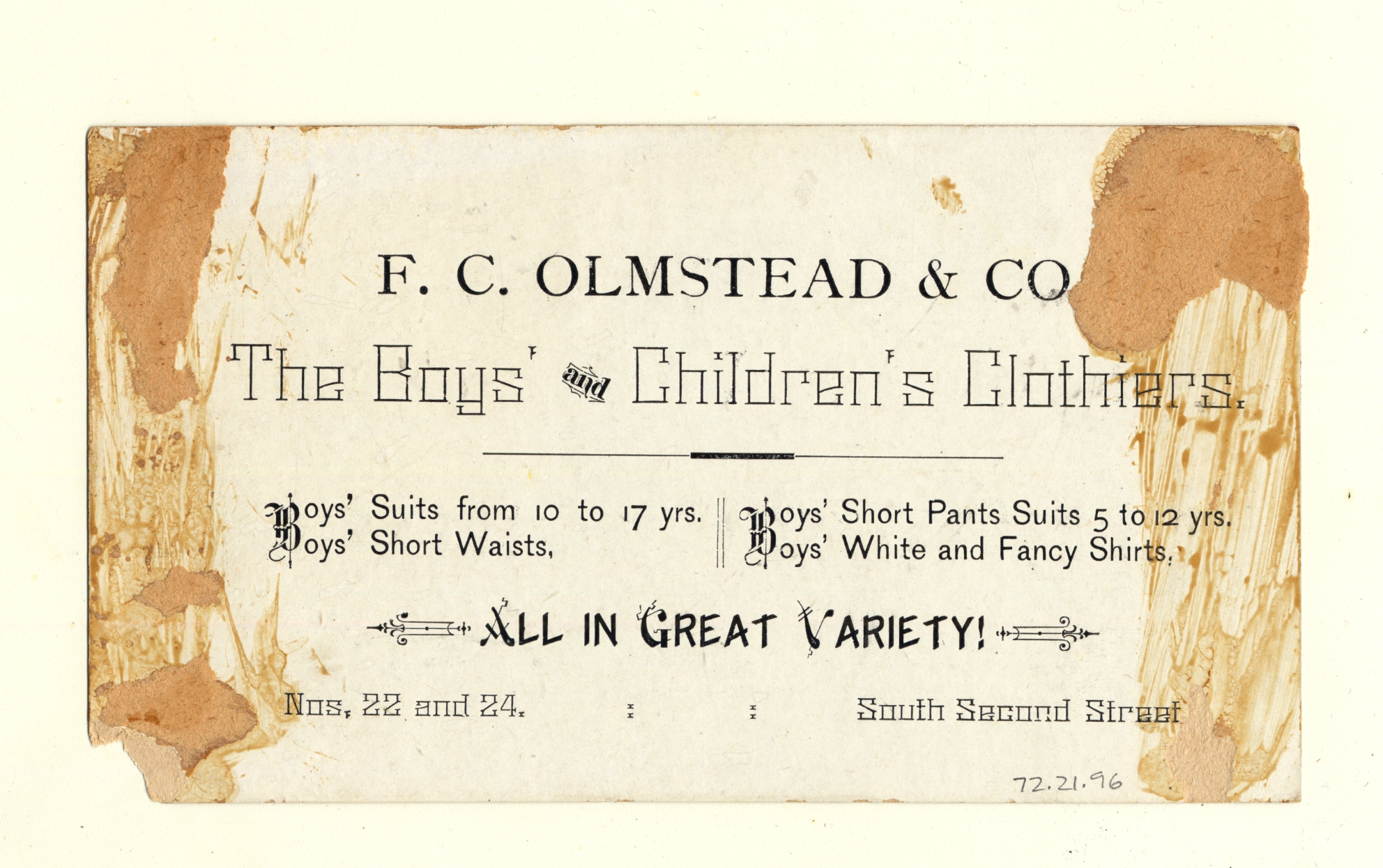 | Artifact Identification | Business Advertisement Card: F.C. Olmstead & Co. (1972.21.0096) |
