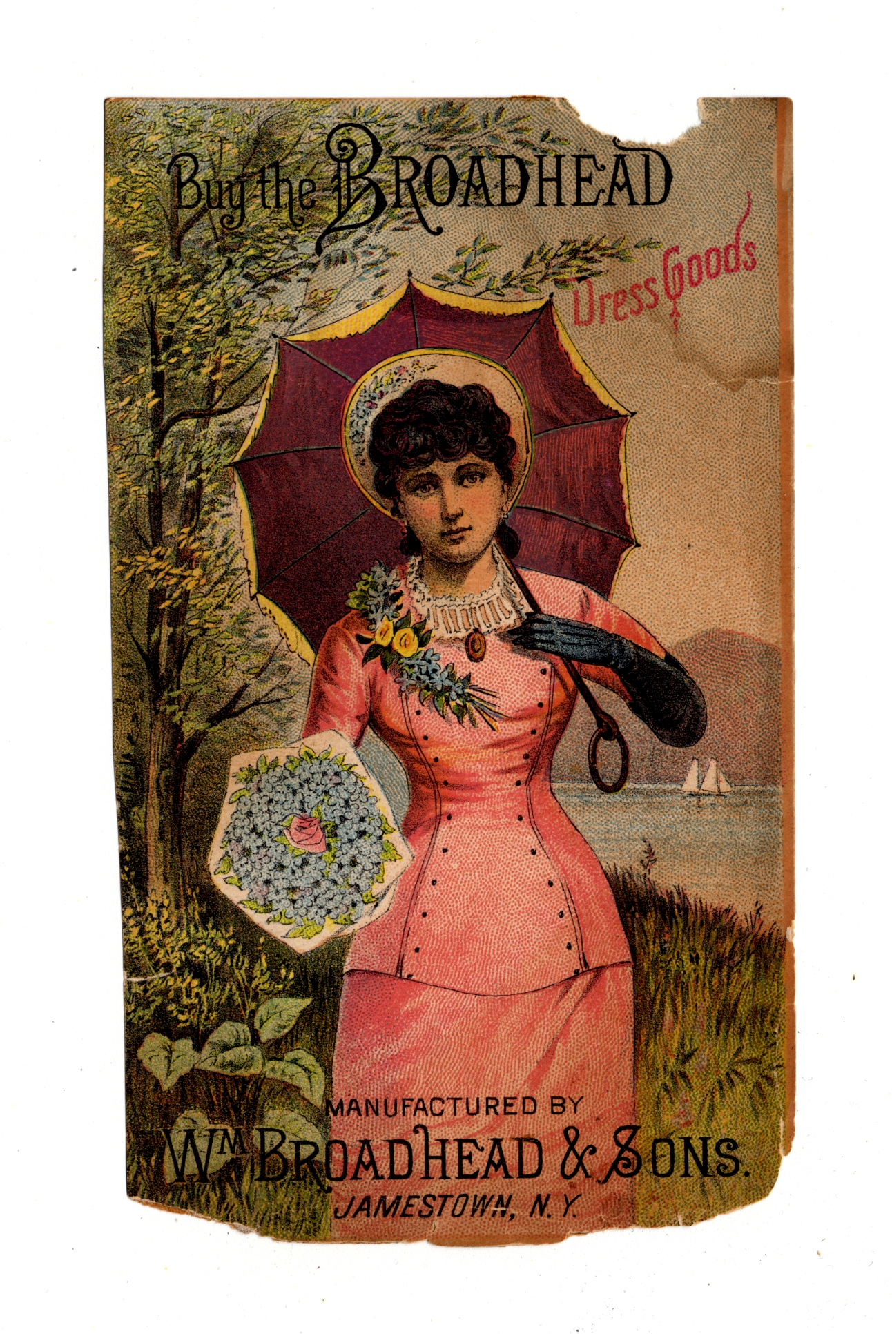 | Description | Advertising cards that featured children and young adults engaging in consumer lifestyles were appealing to young audiences. For young American girls, a demographic that often lived in constraining social environments, these cards were particularly endearing and relatable, especially when they featured girls of the same age group. The girls on the card participating in happy and even adventurous consumer activities were symbolic of what opportunities were available for young women in a new American industrialized era. This card for Broadhead Dress Goods features an elaborately dressed woman holding a bouquet of flowers and a parasol, insinuating that a girl’s clothing and quality of life will improve with the advertised products. |
