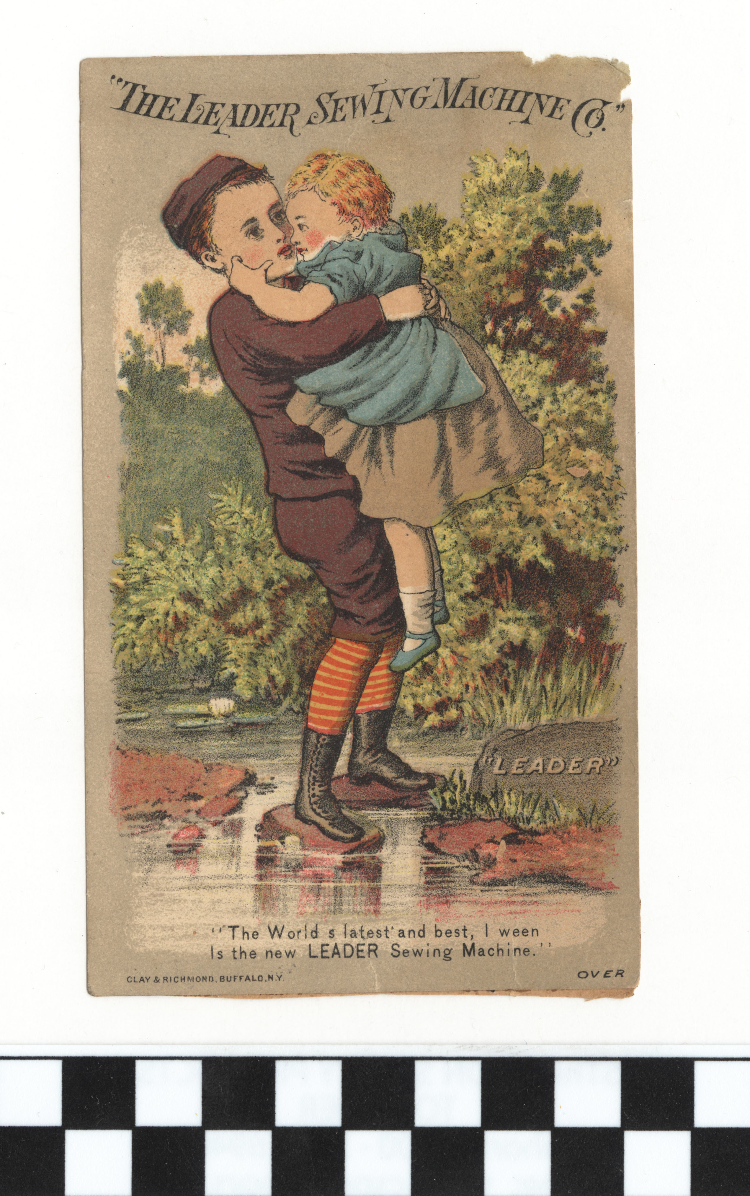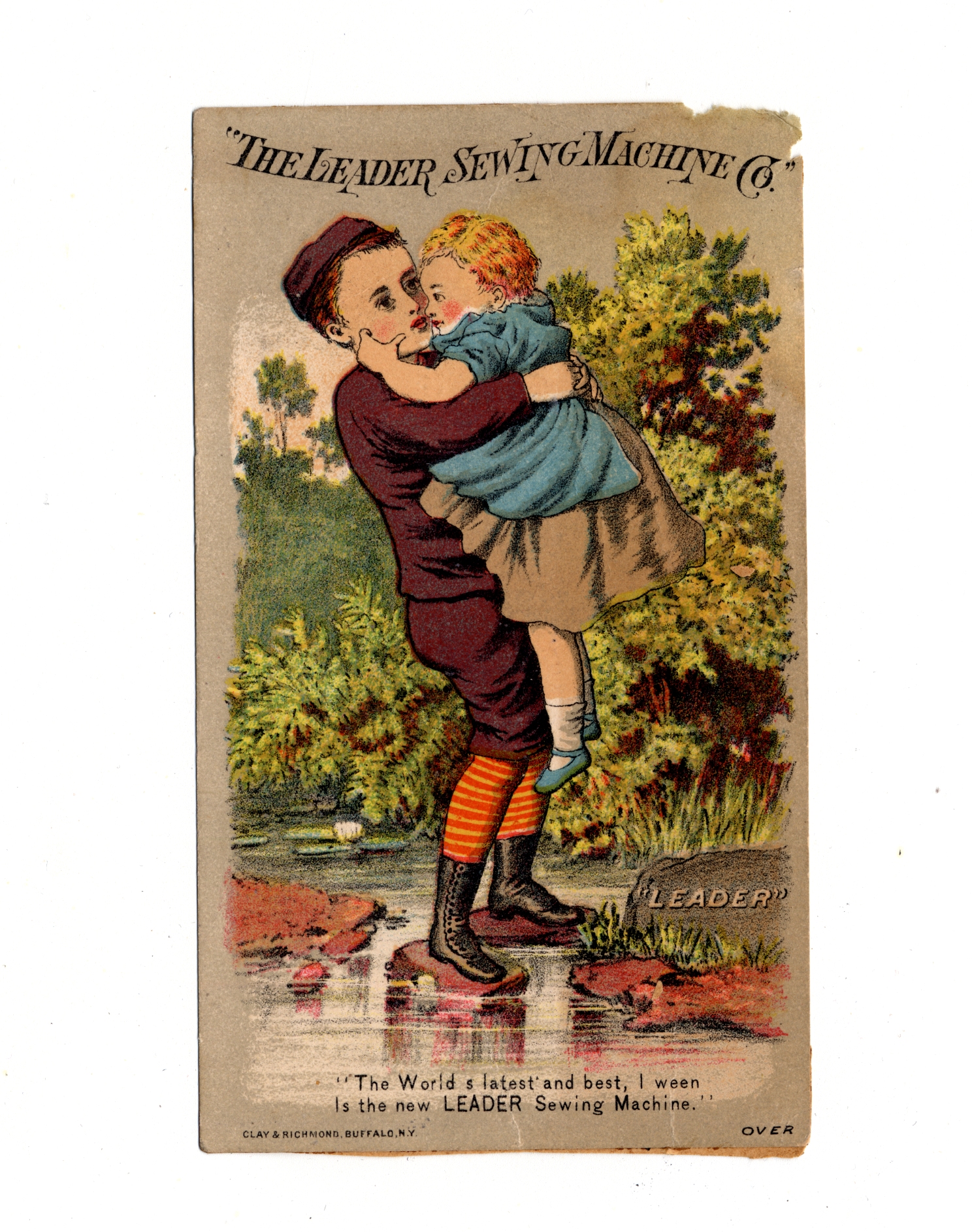 | Description | Children were terrific advertising tools in American trade cards, with producers often using charming images of young people to increase consumer sentiments and facilitate a positive reputation for their brands. Also, these children were often depicted as engaging in consumer lifestyles, a trend that their peers found inspiring. Additionally, some advertisers used sympathy for children–often depicting them as downtrodden or impoverished–to advertise the negative issues of industrialized society. This card for Leader Sewing Machine Co. includes a boy holding a smaller girl in his arms while standing on rocks in a river, a wholesome image intended to help facilitate favorable attention from consumers. |