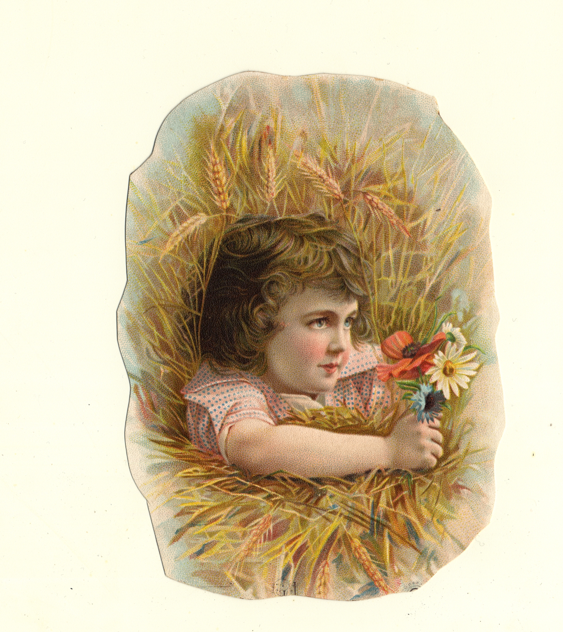 | Description | Advertising cards that featured children and young adults engaging in consumer lifestyles were appealing to young audiences. For young American girls, a demographic that often lived in constraining social environments, these cards were particularly endearing and relatable, especially when they featured girls of the same age group. The girls on the card participating in happy and even adventurous consumer activities were symbolic of what opportunities were available for young women in a new American industrialized era. This card for Milwaukee Harvester Company features a girl holding a bouquet of flowers while surrounded by wheat stalks, insinuating that farming tasks as well as a girl’s quality of life can improve with the advertised product. |