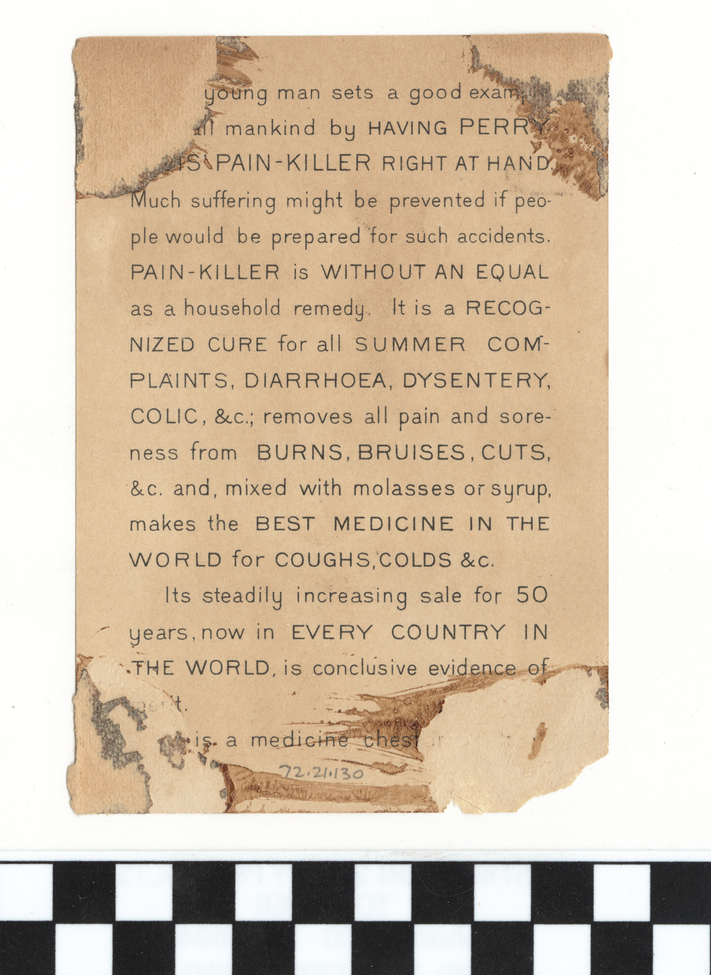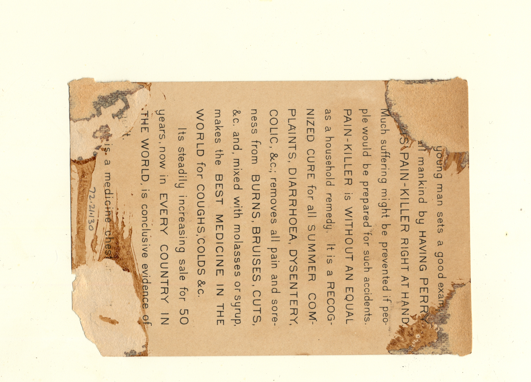 Many American advertising cards in the nineteenth century displayed a variety of visual and rhetorical themes to foster the attention of potential consumers. The appealing elements these cards displayed convinced the public that these easily disposable ephemera pieces were worthy of preservation. In this card for Pain Killer, two advertising tropes which can be observed are the inclusion of children and the imagery medical advertisers used to make their remedial products seem more trustworthy.