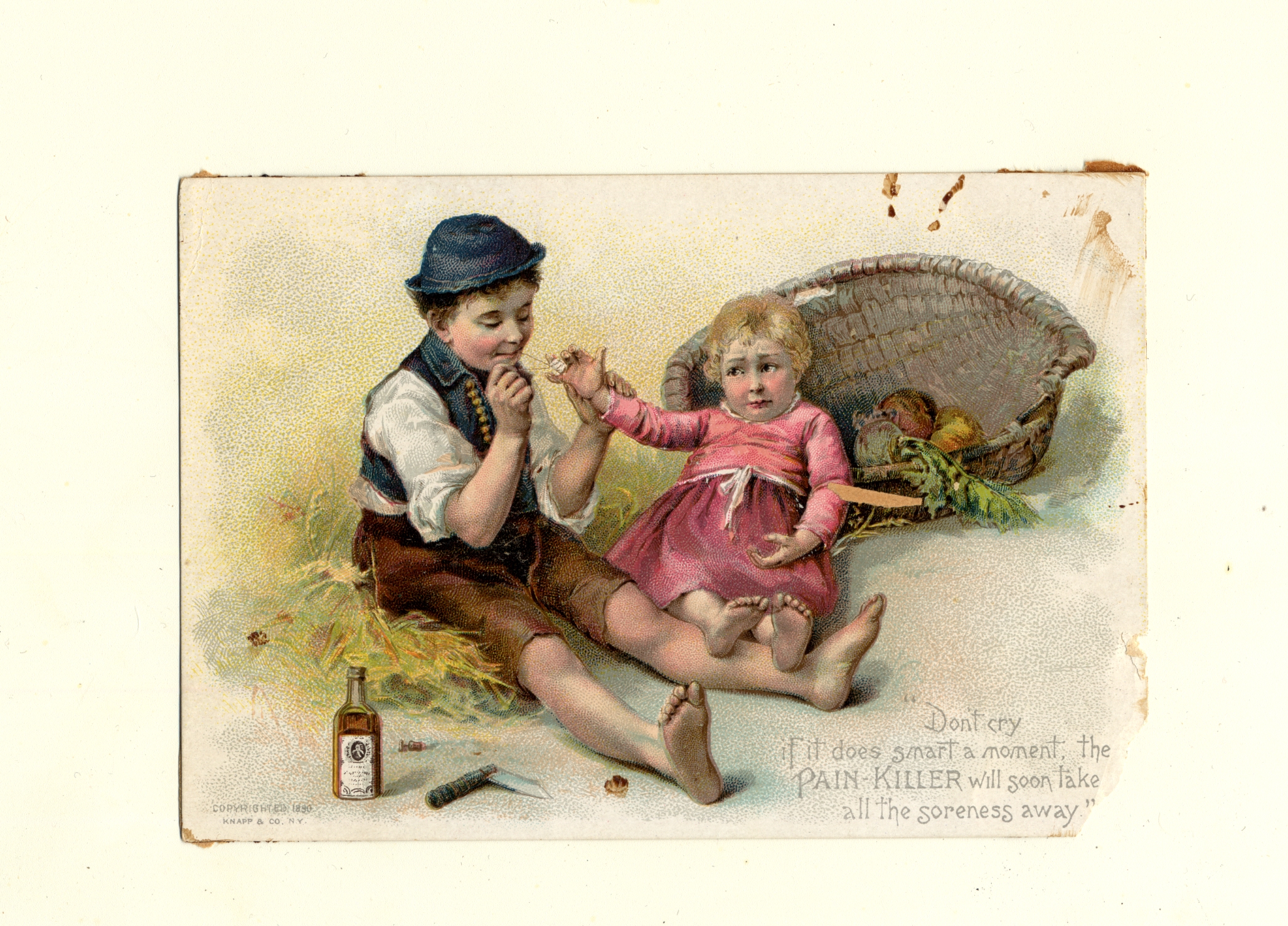 Children were terrific advertising tools in American trade cards, with producers often using charming images of young people to increase consumer sentiments and facilitate a positive reputation for their brands. Also, these children were often depicted as engaging in consumer lifestyles, a trend that their peers found inspiring. Additionally, some advertisers used sympathy for children–often depicting them as downtrodden or impoverished–to advertise the negative issues of industrialized society. This card demonstrates this trend by including an image of a boy treating the finger of a crying girl. This wholesome scene is intended to help facilitate favorable attention from consumers.