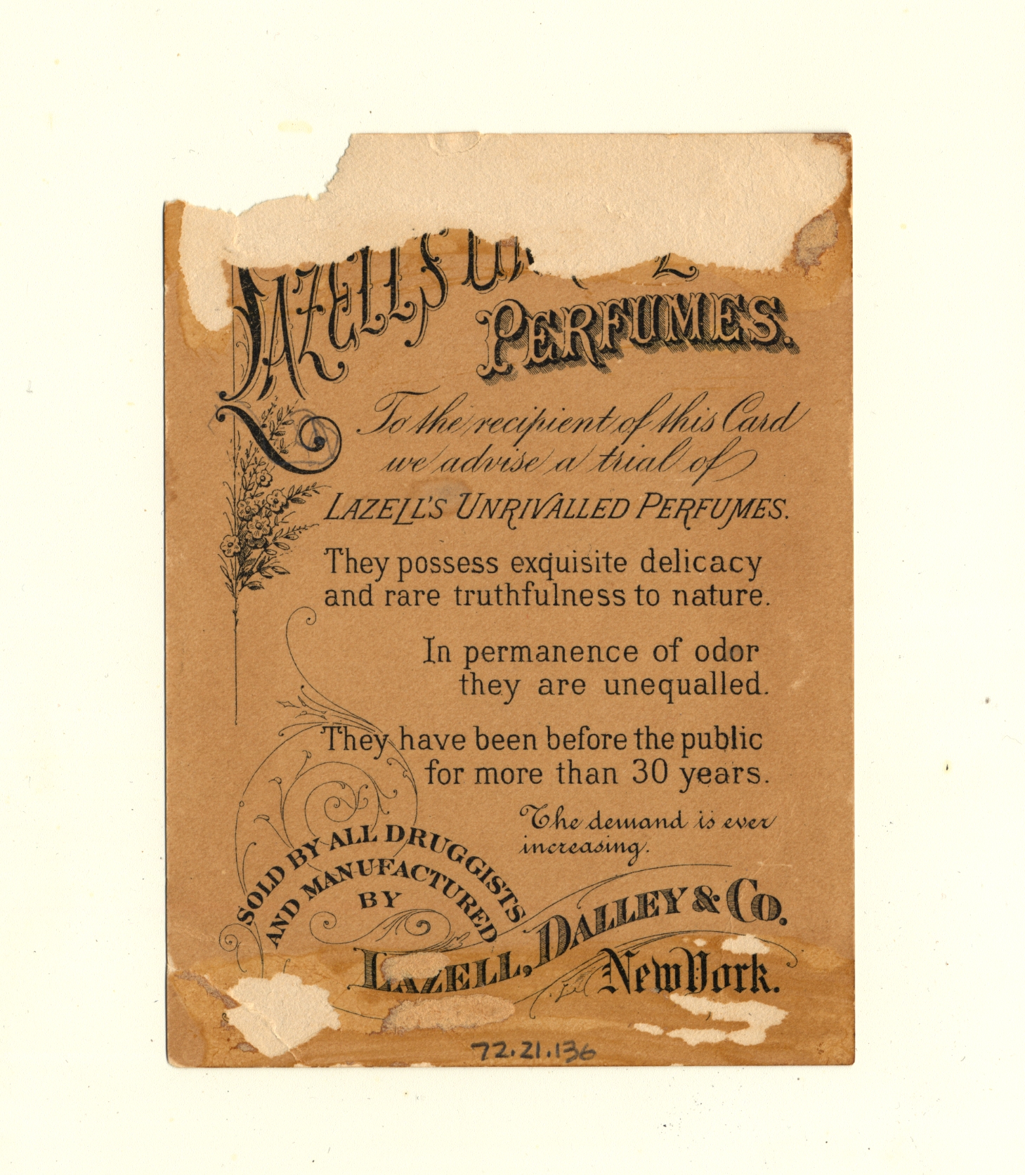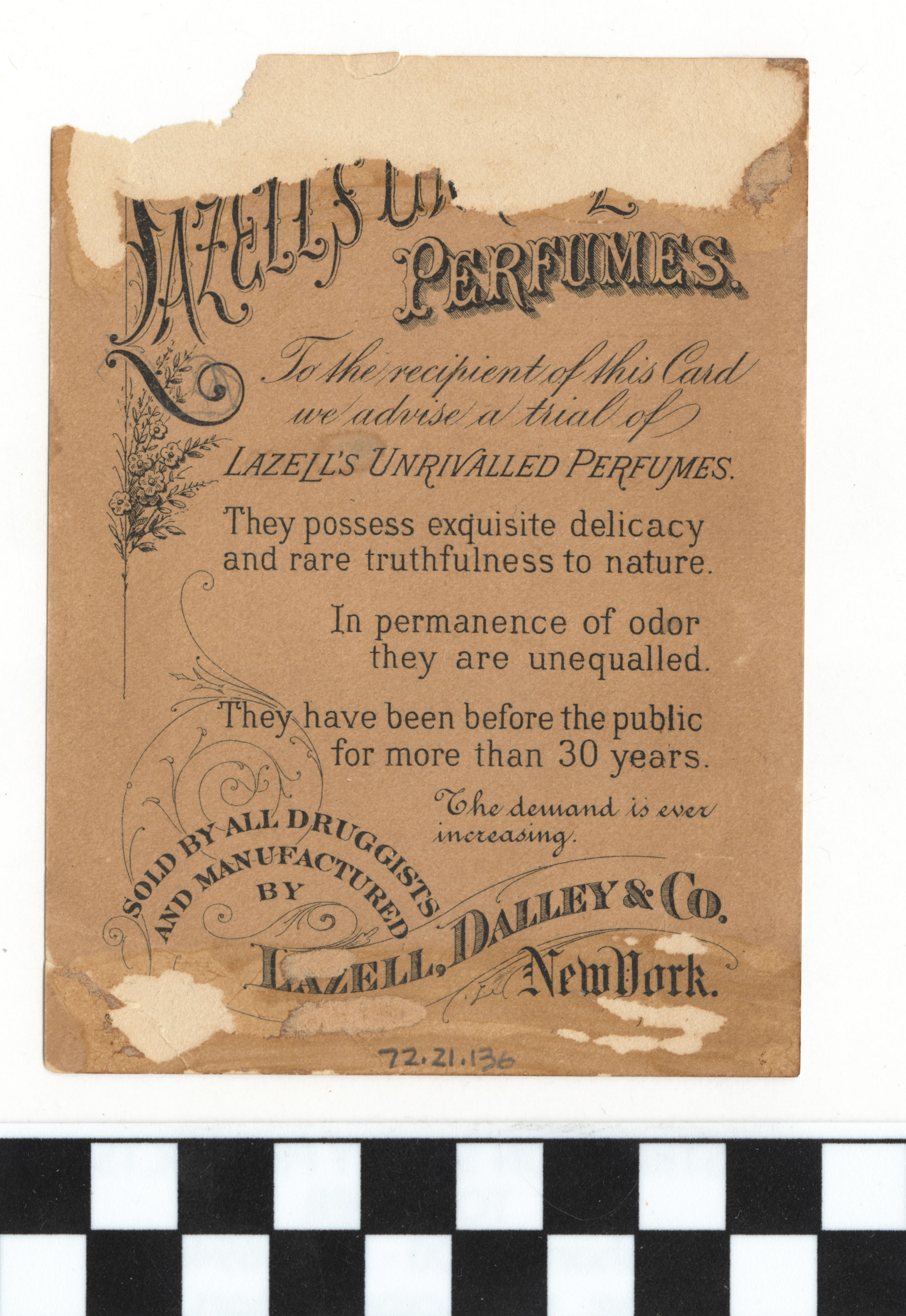 | Artifact Identification | Business Advertisement Card: "Lazell's Unrivalled Perfumes" (1972.21.0136) |