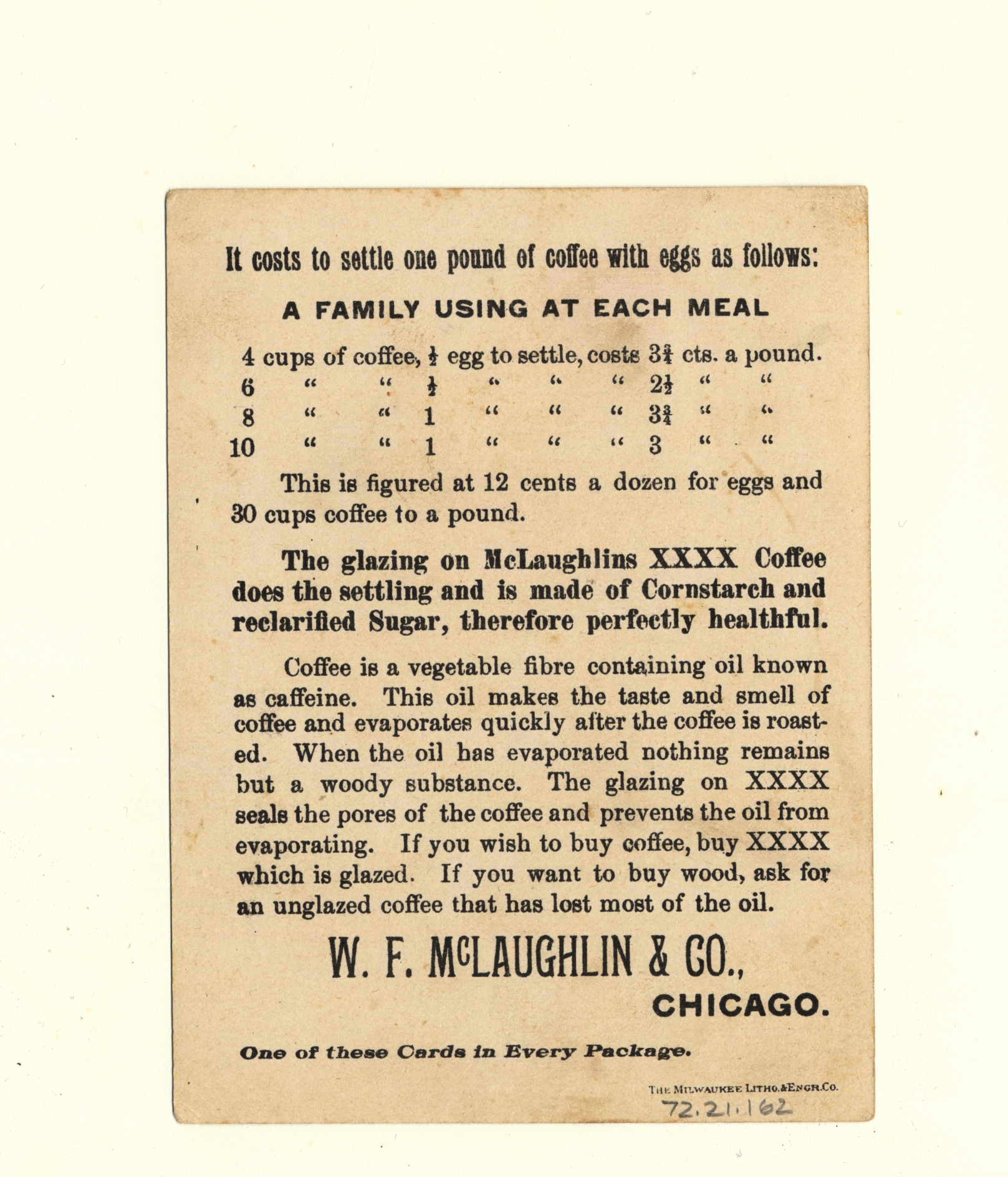 | Artifact Identification | Business Advertisement Card: McLaughlin's XXXX Coffee (1972.21.0162) |