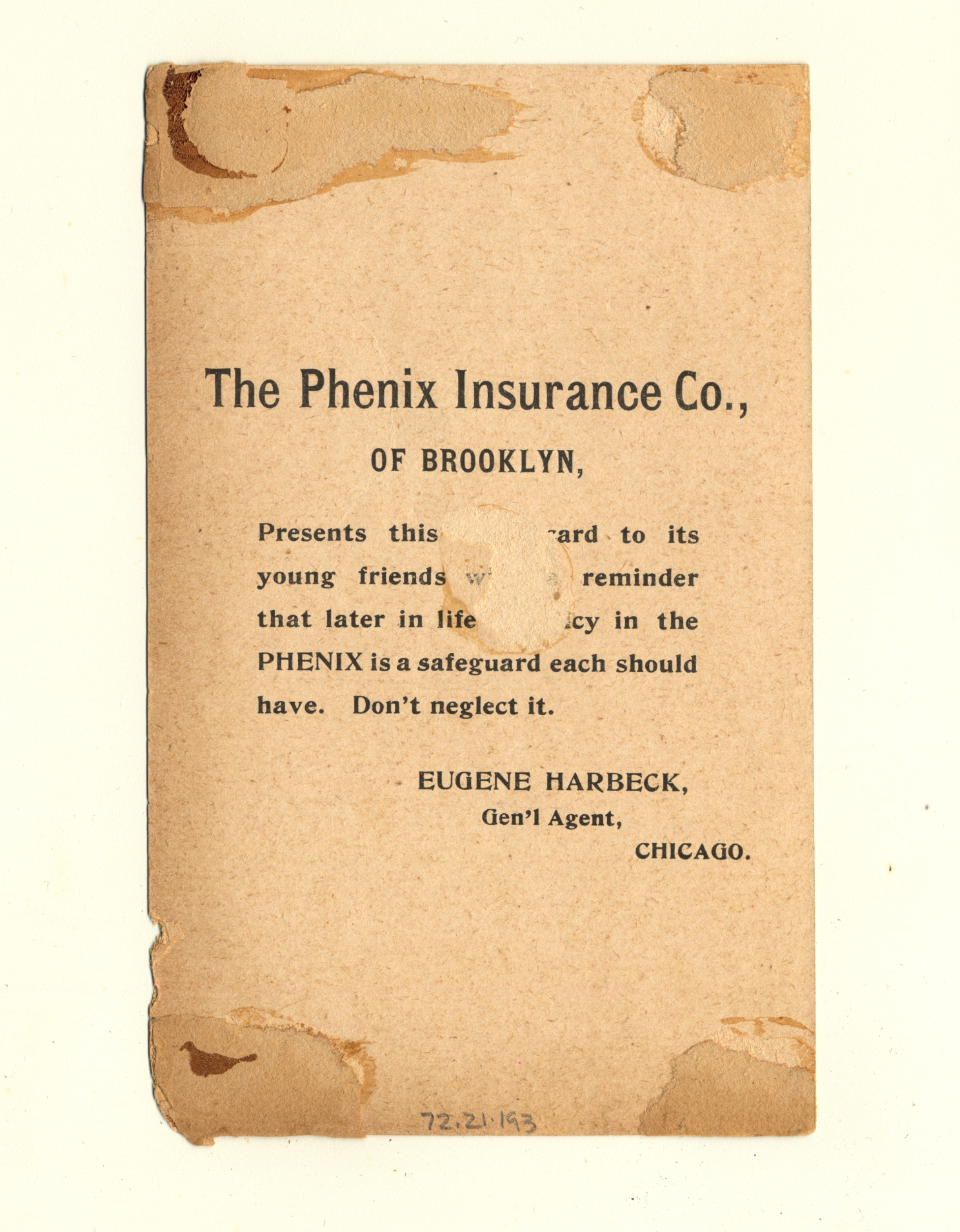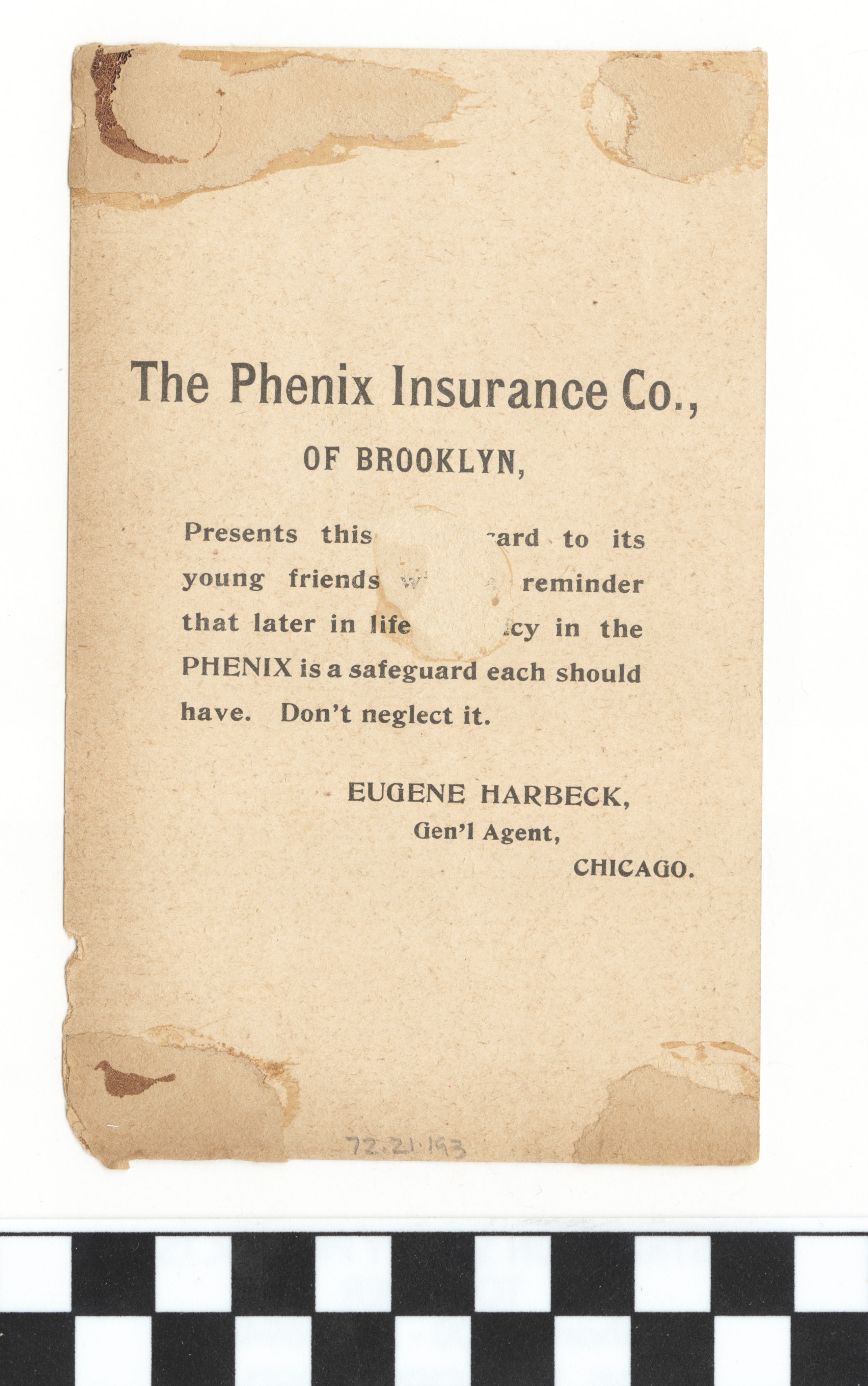 | Artifact Identification | Business Advertisement Card: Phenix Insurance Co. (1972.21.0193) |