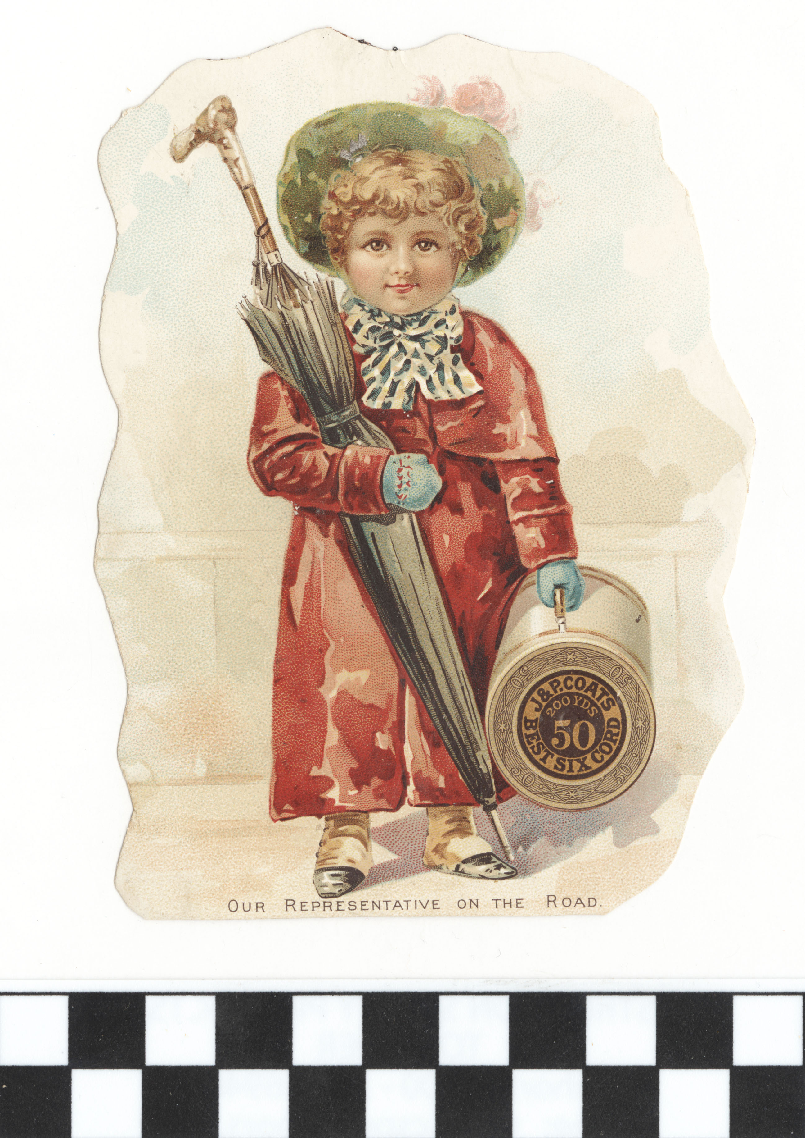 | Description | Advertising cards that featured children and young adults engaging in consumer lifestyles were appealing to young audiences. For young American girls, a demographic that often lived in constraining social environments, these cards were particularly endearing and relatable, especially when they featured girls of the same age group. The girls on the card participating in happy and even adventurous consumer activities were symbolic of what opportunities were available for young women in a new American industrialized era. This card for Coats Thread Co. includes a girl in stylish dress holding an umbrella as well as spool of thread, suggesting that the advertised item is necessary in a girl’s daily life. |