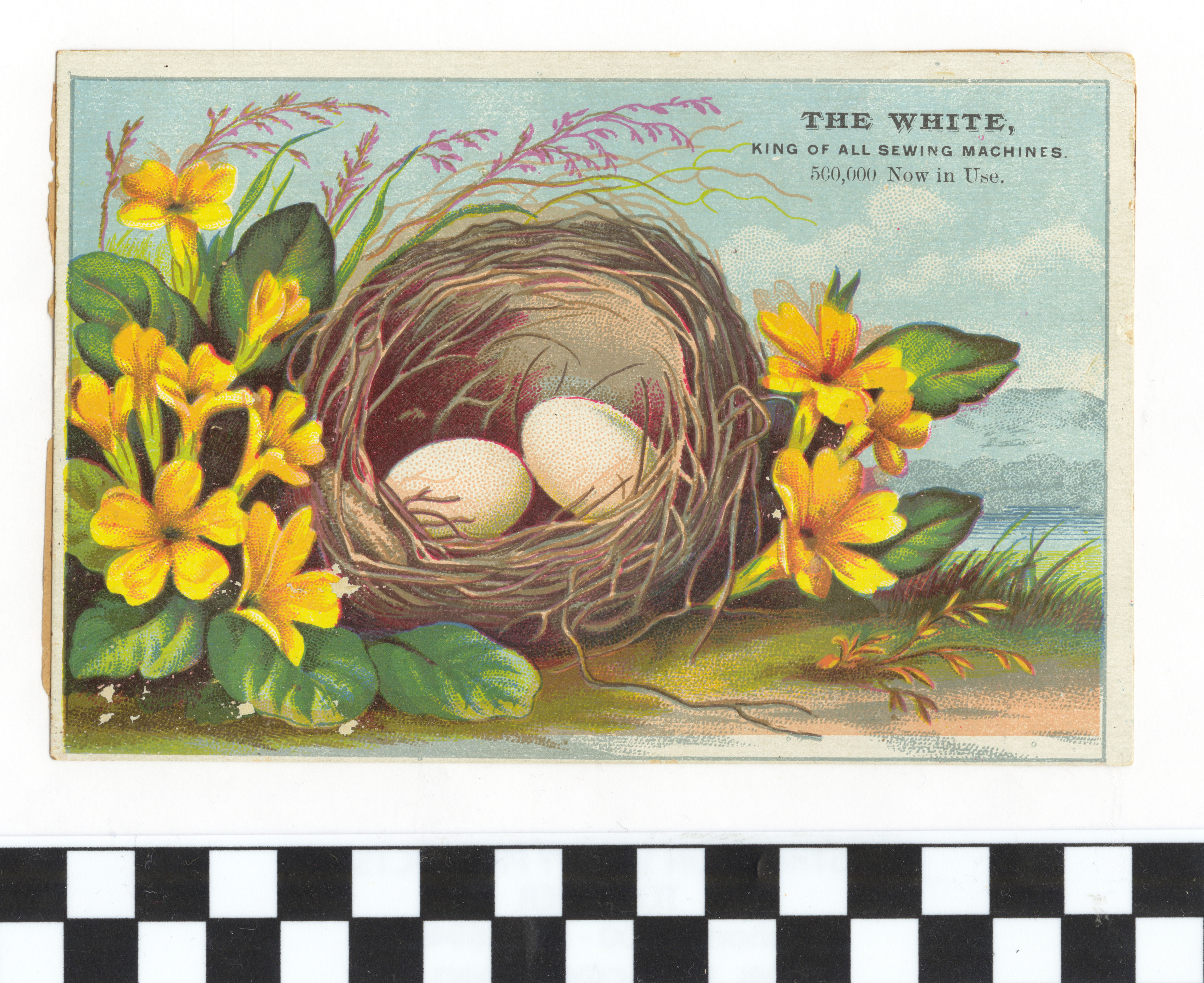 | Description | One of the ways trade card advertisers could compensate for the flat, mundane nature of their paper products was by implementing natural imagery. If a feeling of “naturalness” and “genuineness” was conveyed to the consumer successfully, then the advertised product was more likely to be researched and purchased. Chromolithography, the process of printing color-printed ephemera, allowed trade card authors to create colorful and appealing images which helped to circulate the supposed benefits of their wares. This card features flowers and a nest of eggs - two symbols of rebirth and natural elegance - so consumers may have believed the textiles created by the advertised sewing machines were of similar quality. |