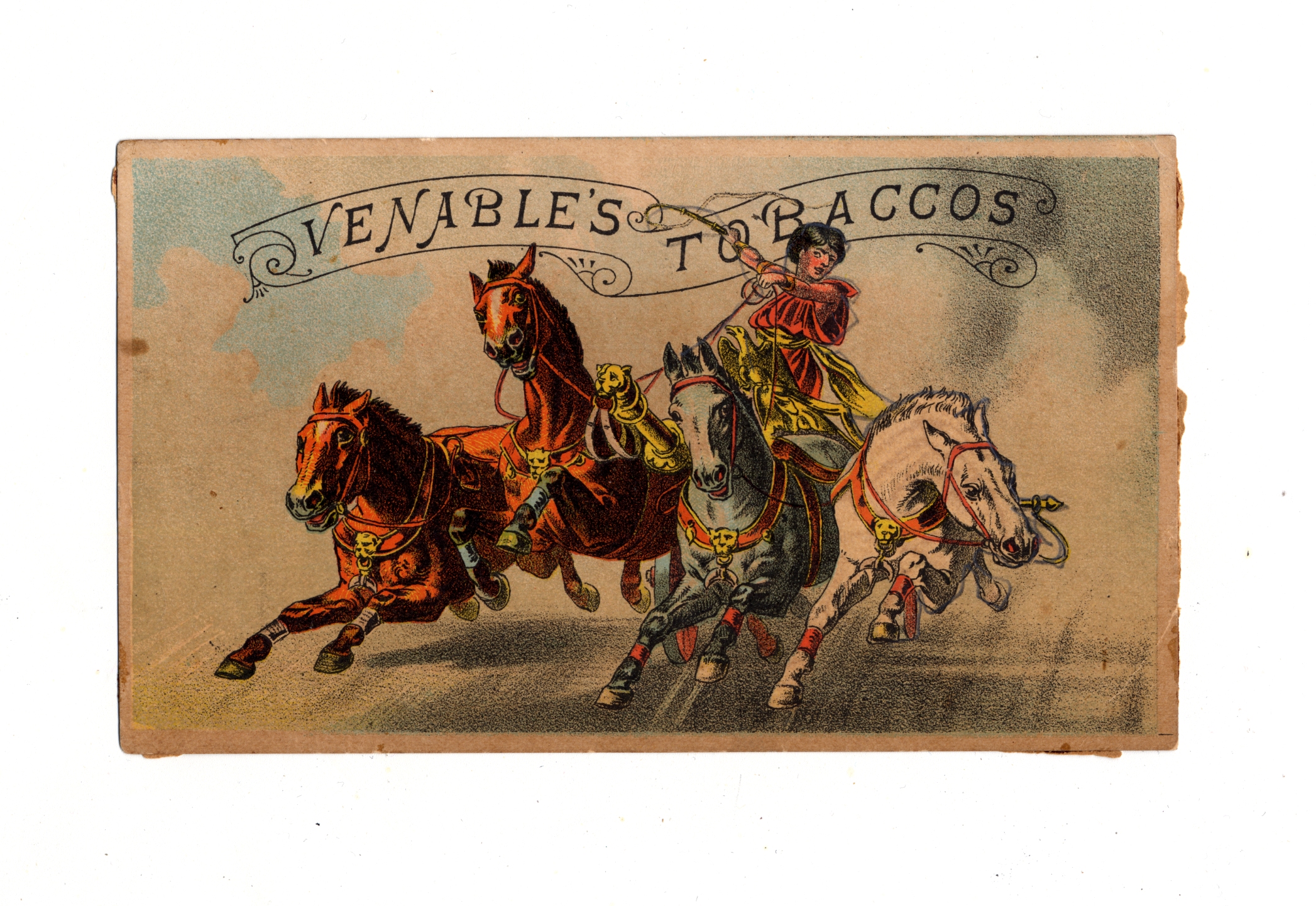 producing company. Scenes with exotic, eye-catching, and even fantastical qualities were often implemented into these cards. This portrayal was meant to suggest that the advertised product, as opposed to similar items from other brands, was of high quality and perhaps even supernatural in its effectiveness. This card shows a romantic setting of a charioteer and four horses that is intended to catch the eye of consumers as well as generate curiosity about what unique items the advertiser could offer.