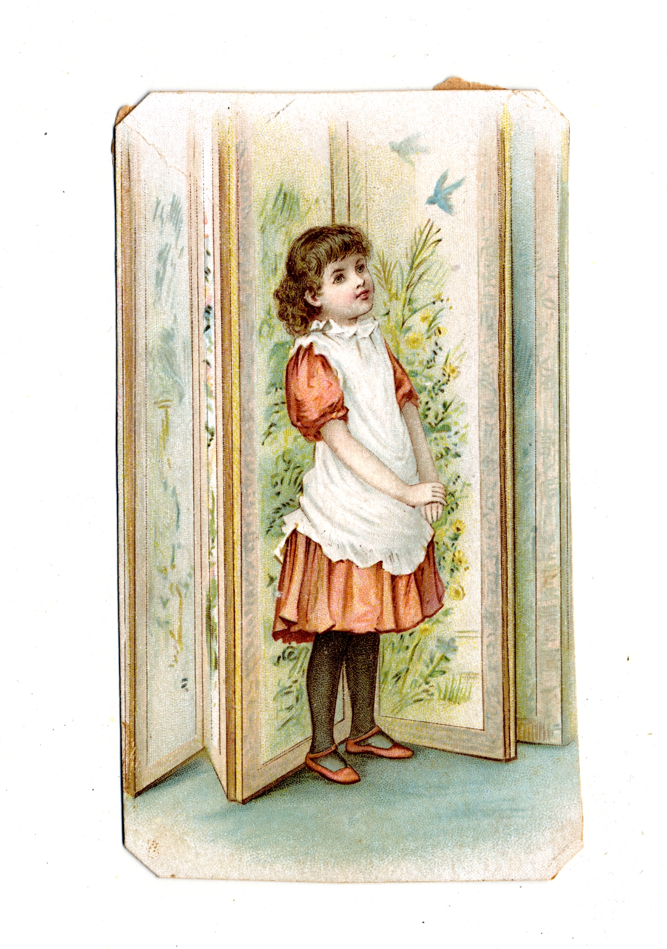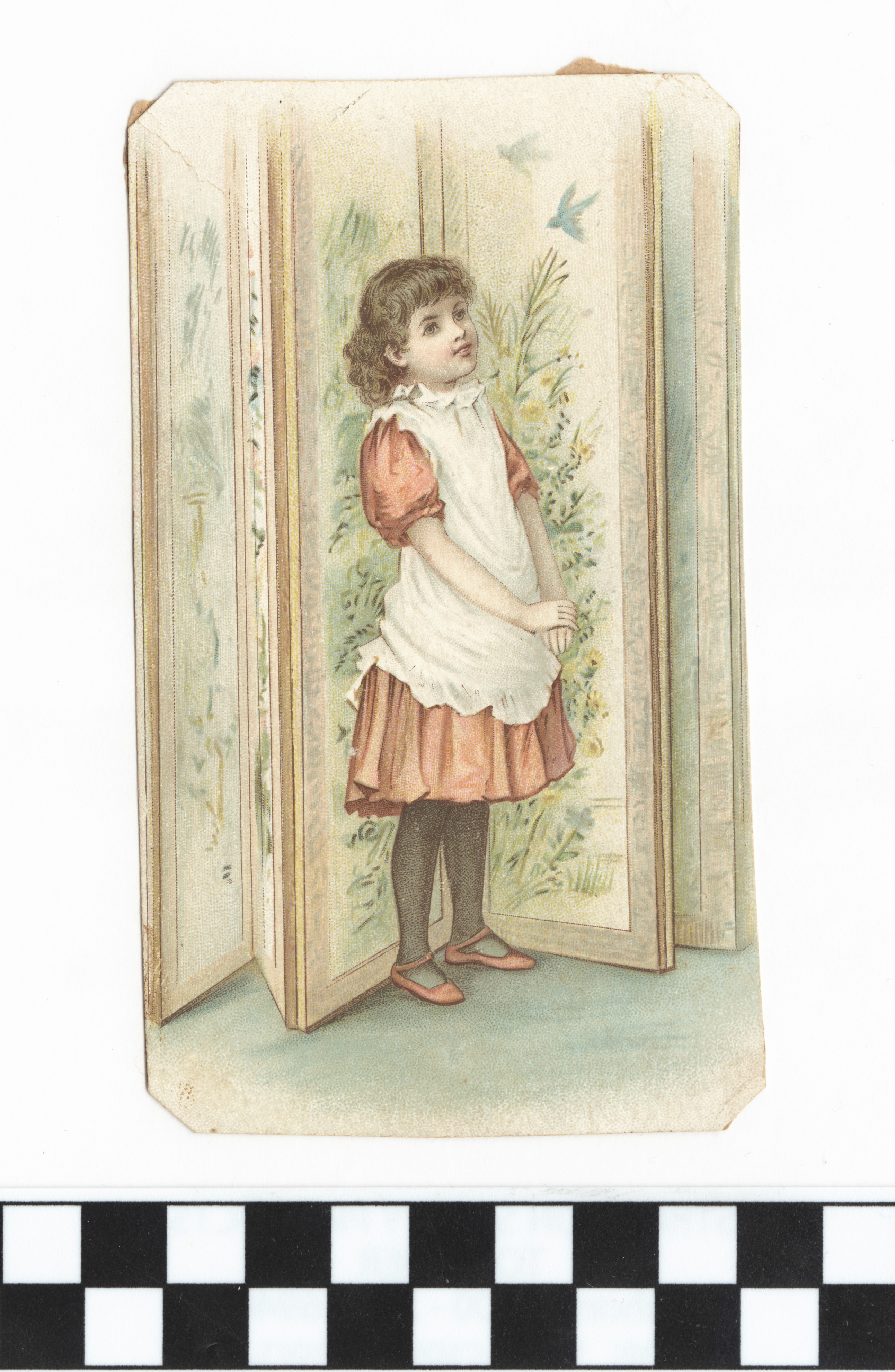 | Description | Many greeting cards relied on sentimental imagery and messages even when they were not affiliated with any specific holiday. Greeting card manufacturers of the 19th century generally incorporated wholesome imagery and morality to appeal to a wide consumer audience. The positivity and innocence of these ephemeral pieces became associated with greater profits and circulation, so many manufacturers chose to duplicate this style in their own cards. This card demonstrates the sentimental theme by featuring a girl in a pink dress standing in front of a folding screen with images of birds and foliage. Such a scene is designed to foster warm and affectionate feelings. |