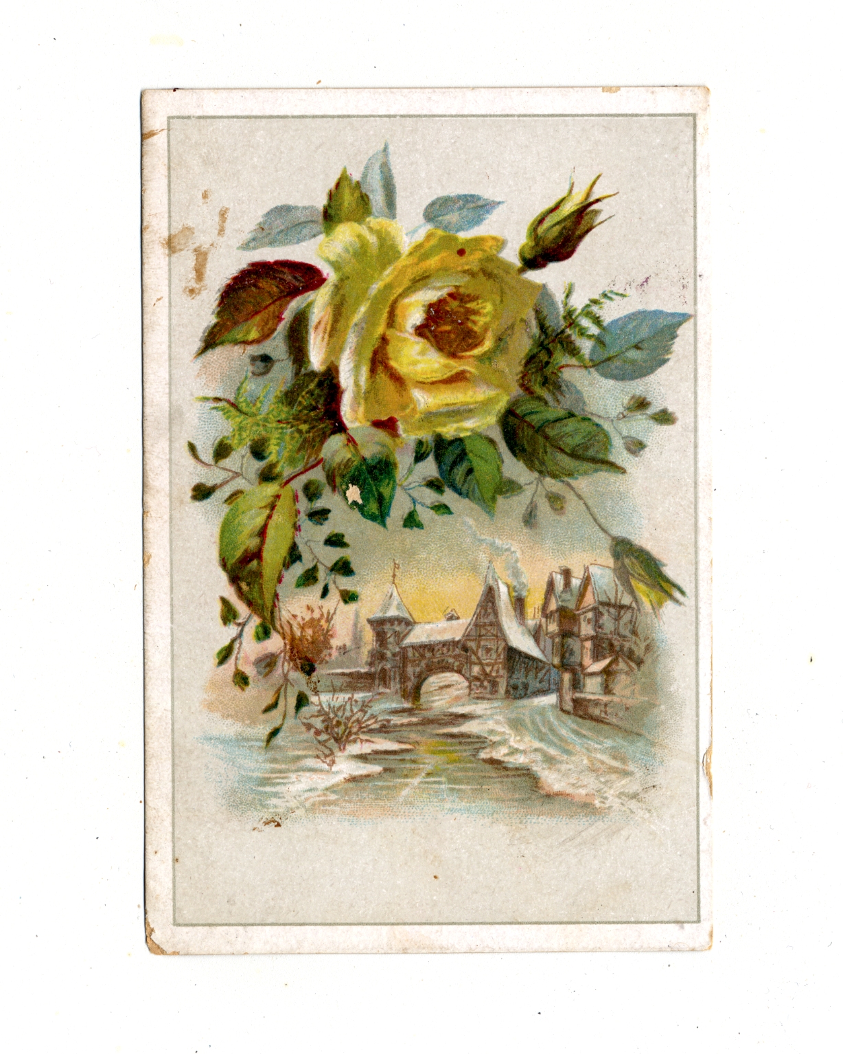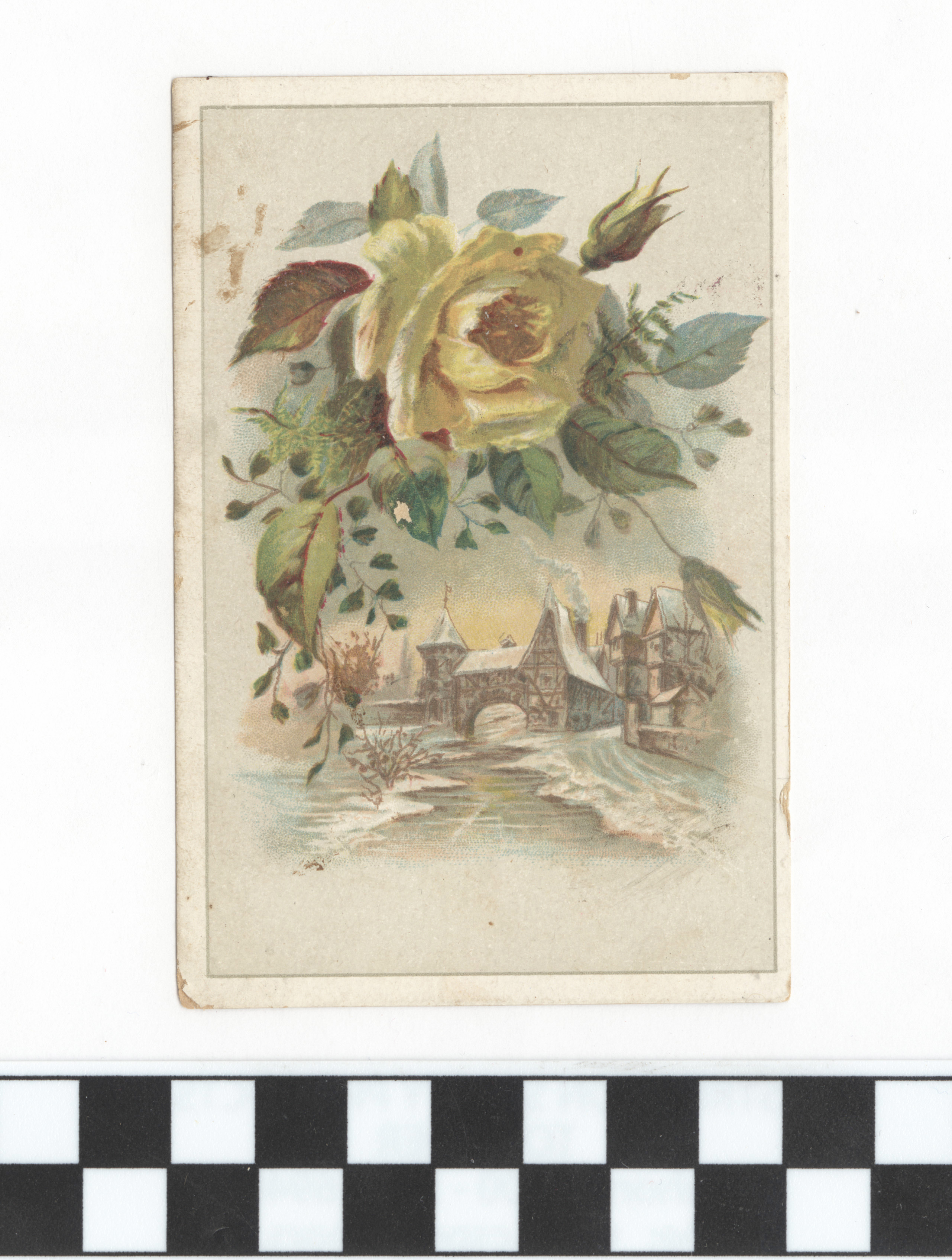 | Description | Many greeting cards relied on sentimental imagery and messages even when they were not affiliated with any specific holiday. Greeting card manufacturers of the 19th century generally incorporated wholesome imagery and morality to appeal to a wide consumer audience. The positivity and innocence of these ephemeral pieces became associated with greater profits and circulation, so many manufacturers chose to duplicate this style in their own cards. This card demonstrates the sentimental theme by featuring buildings by a river in winter with a yellow rose above. Such a scene is designed to encourage warm feelings. |