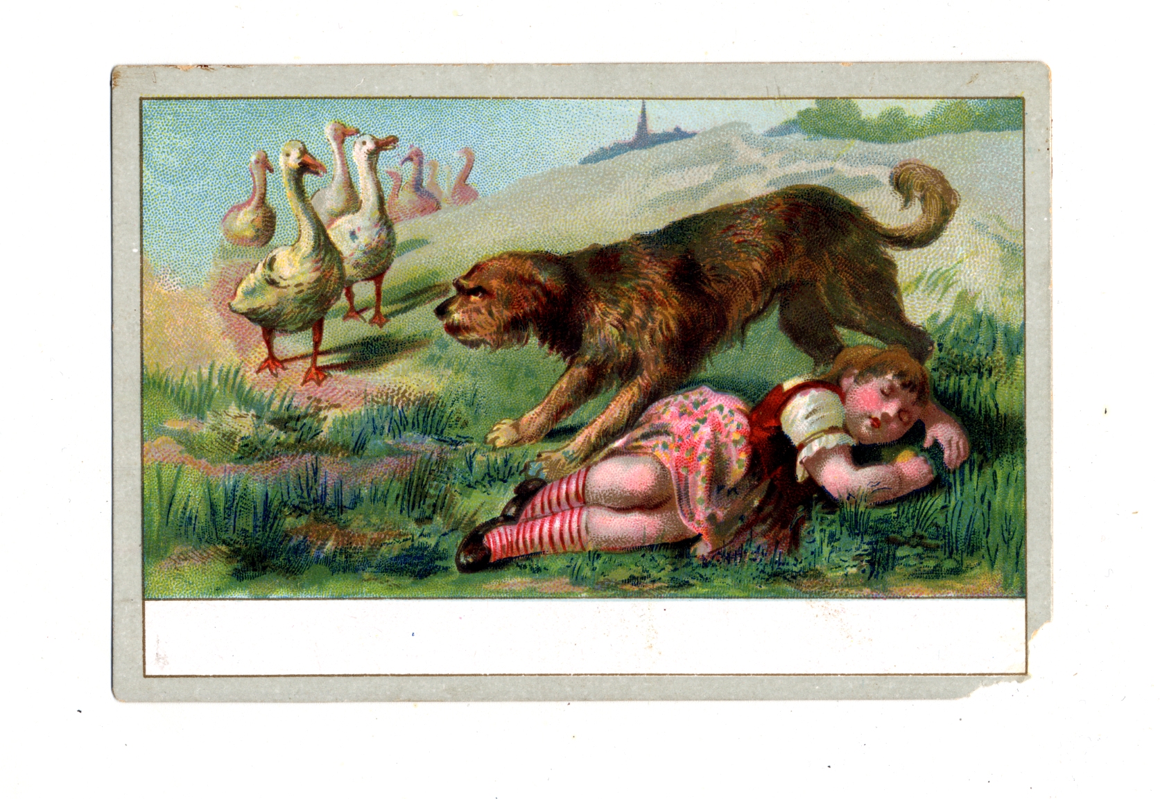 | Description | Many greeting cards relied on sentimental imagery and messages even when they were not affiliated with any specific holiday. Greeting card manufacturers of the 19th century generally incorporated wholesome imagery and morality to appeal to a wide consumer audience. The positivity and innocence of these ephemeral pieces became associated with greater profits and circulation, so many manufacturers chose to duplicate this style in their own cards. This card demonstrates the sentimental theme by featuring an image of a dog protecting a girl, a scene that is designed to encourage warm and affectionate feelings. |