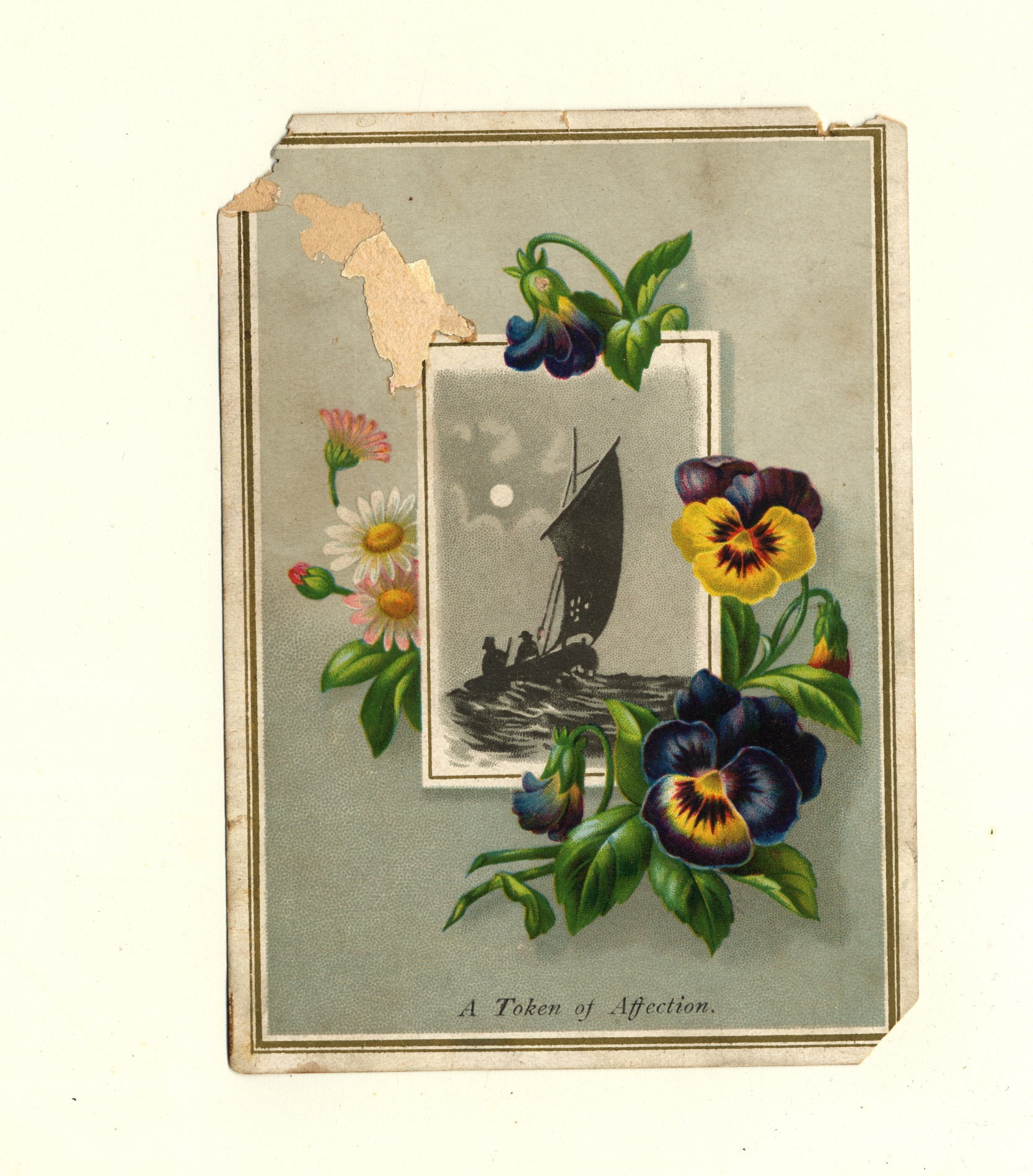 | Description | Many greeting cards relied on sentimental imagery and messages even when they were not affiliated with any specific holiday. Greeting card manufacturers of the 19th century generally incorporated wholesome imagery and morality to appeal to a wide consumer audience. The positivity and innocence of these ephemeral pieces became associated with greater profits and circulation, so many manufacturers chose to duplicate this style in their own cards. This card demonstrates the sentimental theme by featuring an image of two people on a sailboat surrounded by multicolored flowers. Such a scene is designed to encourage warm feelings. |