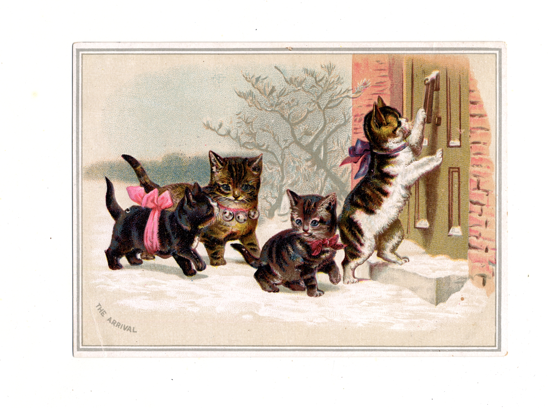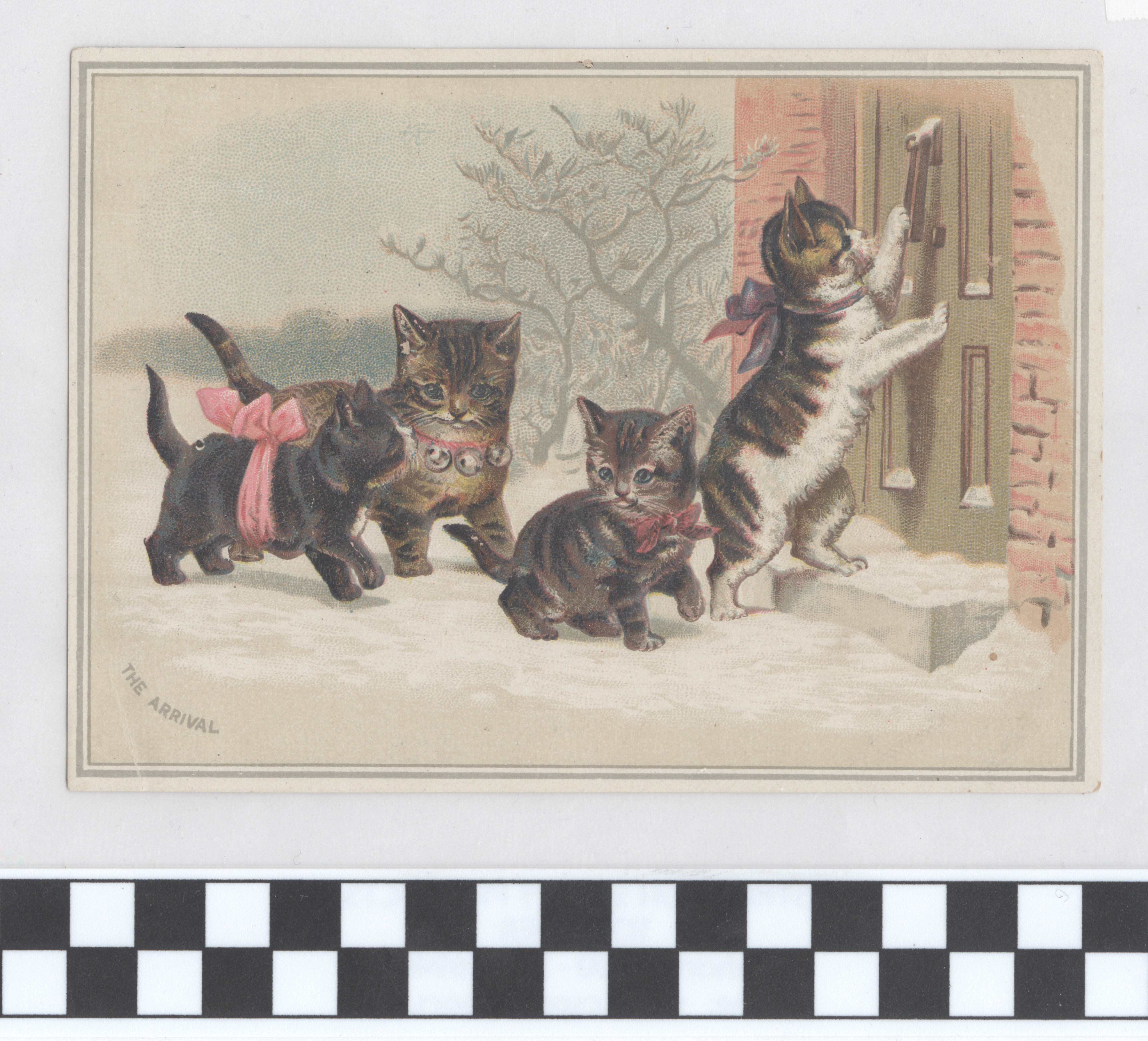 | Description | Many greeting cards relied on sentimental imagery and messages even when they were not affiliated with any specific holiday. Greeting card manufacturers of the 19th century generally incorporated wholesome imagery and morality to appeal to a wide consumer audience. The positivity and innocence of these ephemeral pieces became associated with greater profits and circulation, so many manufacturers chose to duplicate this style in their own cards. This card demonstrates the sentimental theme by featuring an image of kittens approaching a home entrance in the snow. Such a scene is designed to encourage warm and affectionate feelings. |