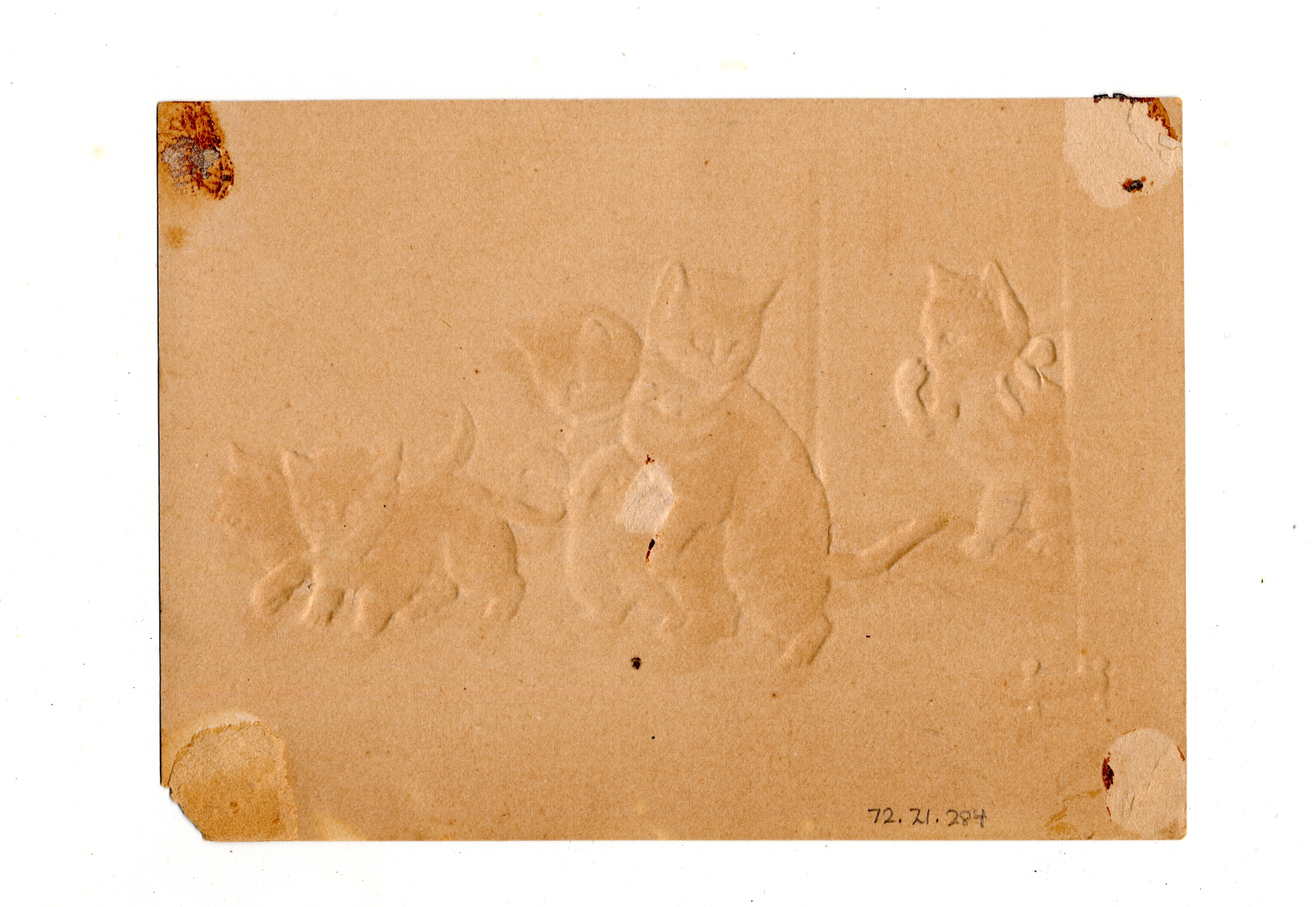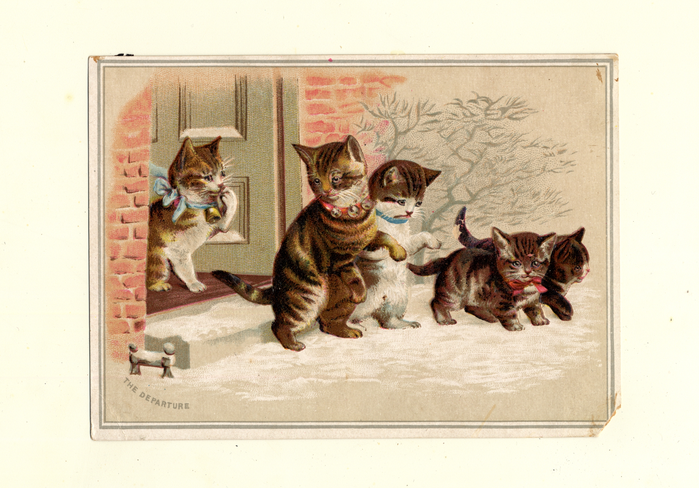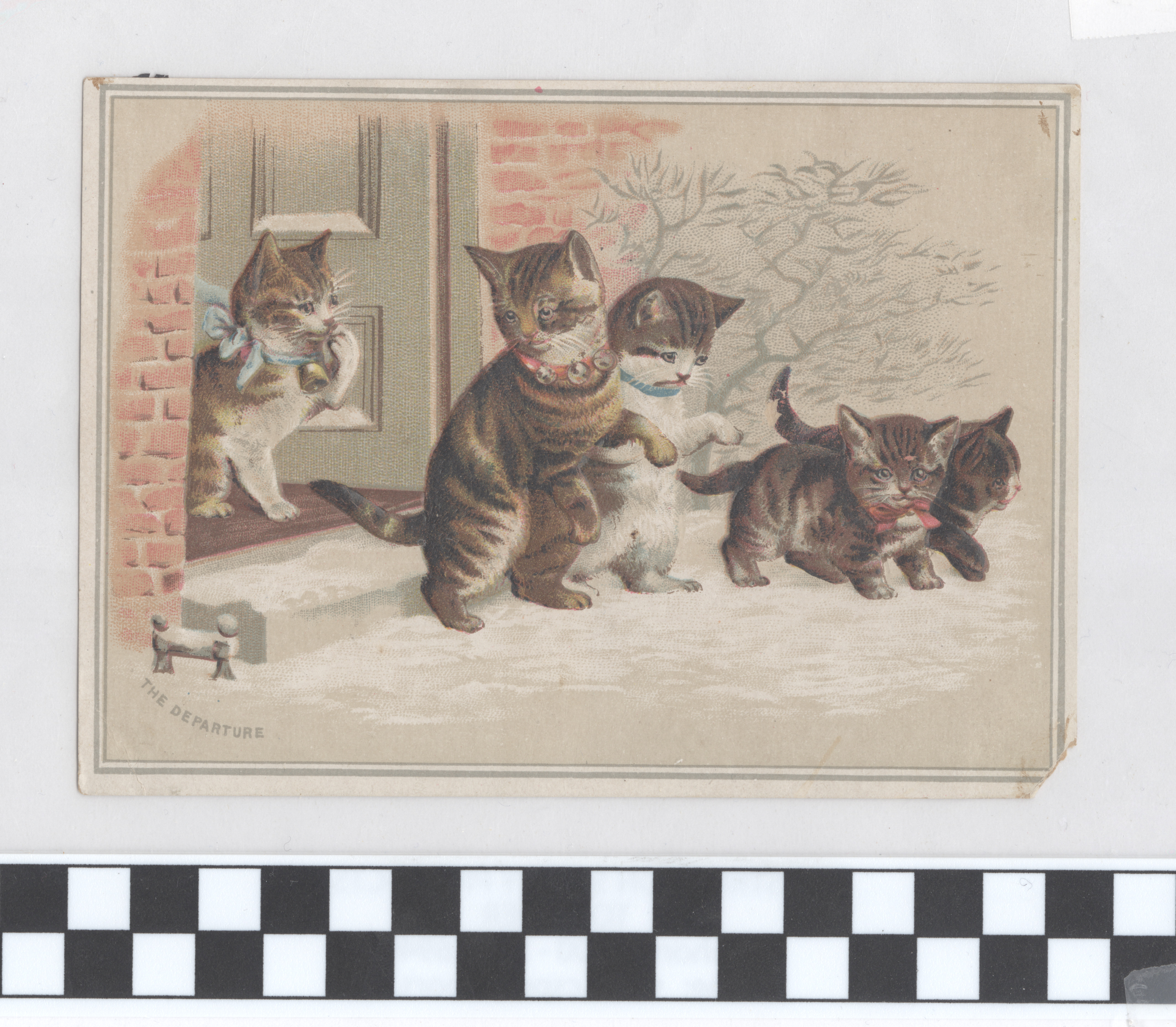 | Description | Many greeting cards relied on sentimental imagery and messages even when they were not affiliated with any specific holiday. Greeting card manufacturers of the 19th century generally incorporated wholesome imagery and morality to appeal to a wide consumer audience. The positivity and innocence of these ephemeral pieces became associated with greater profits and circulation, so many manufacturers chose to duplicate this style in their own cards. This card demonstrates the sentimental theme by featuring an image of kittens exiting a home entrance into the snow. Such a scene is designed to encourage warm and affectionate feelings. |