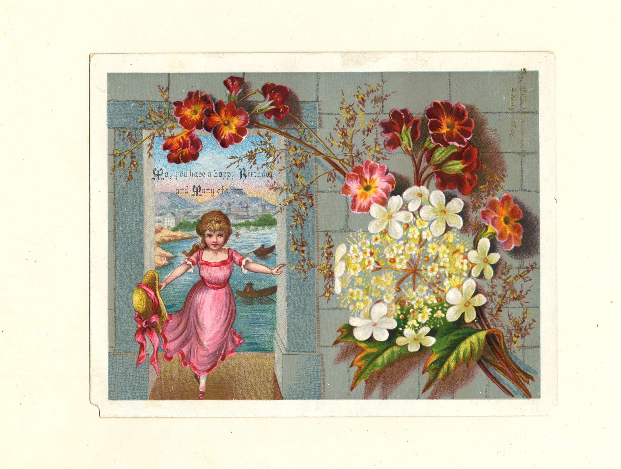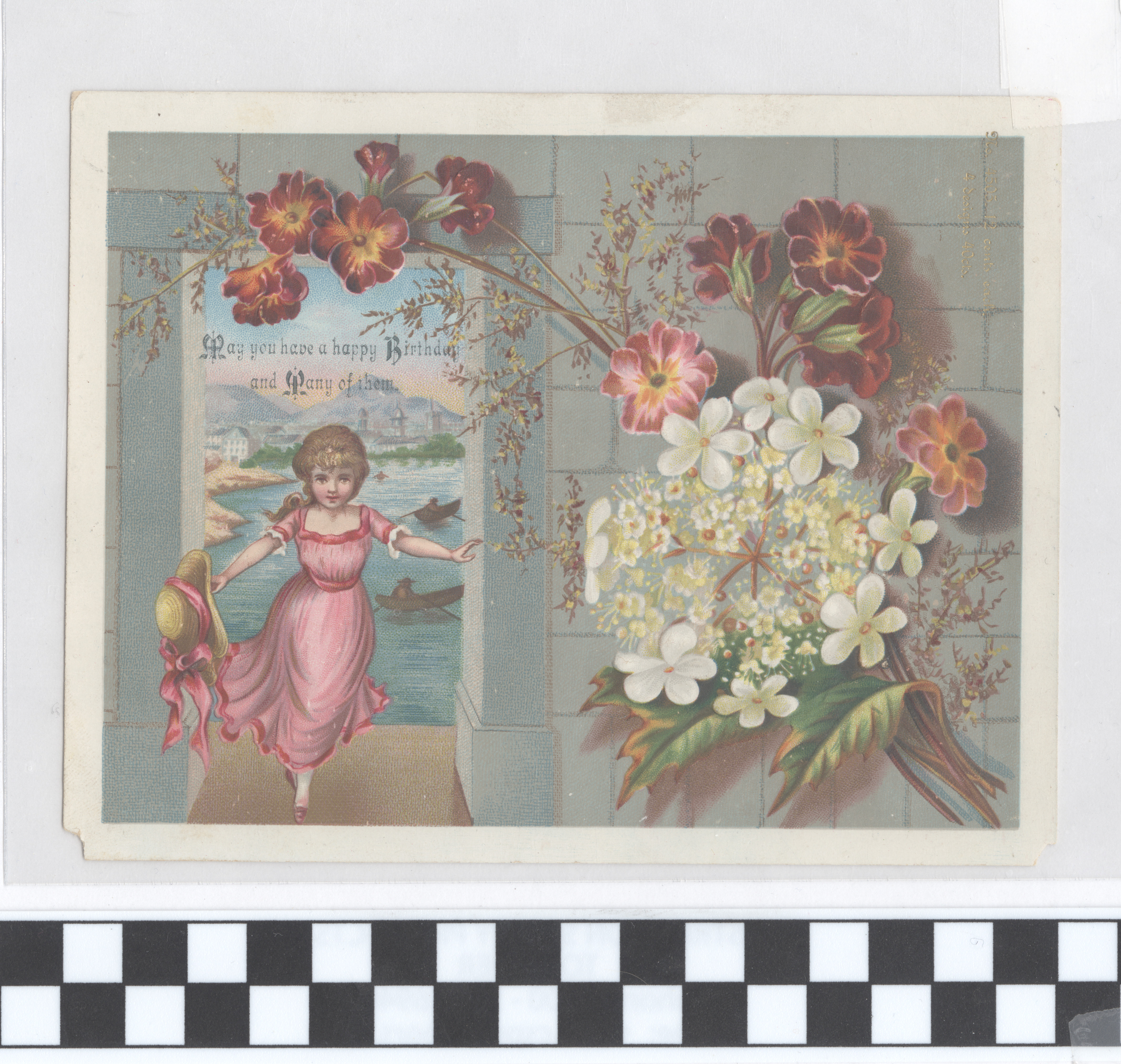 | Description | Greeting cards for holidays other than Valentine’s Day and Christmas also used sentimental imagery and messages to attract consumers. Greeting card manufacturers of the 19th century generally incorporated wholesome imagery and morality to appeal to a wide consumer audience. The positivity and innocence of these ephemeral pieces became associated with greater profits and circulation, so many manufacturers chose to duplicate this style in their own cards. This card demonstrates the sentimental theme by featuring a young girl in a pink dress with flowers beside her and a coastal landscape in the background. Such a scene encourages warm and affectionate feelings from consumers. |