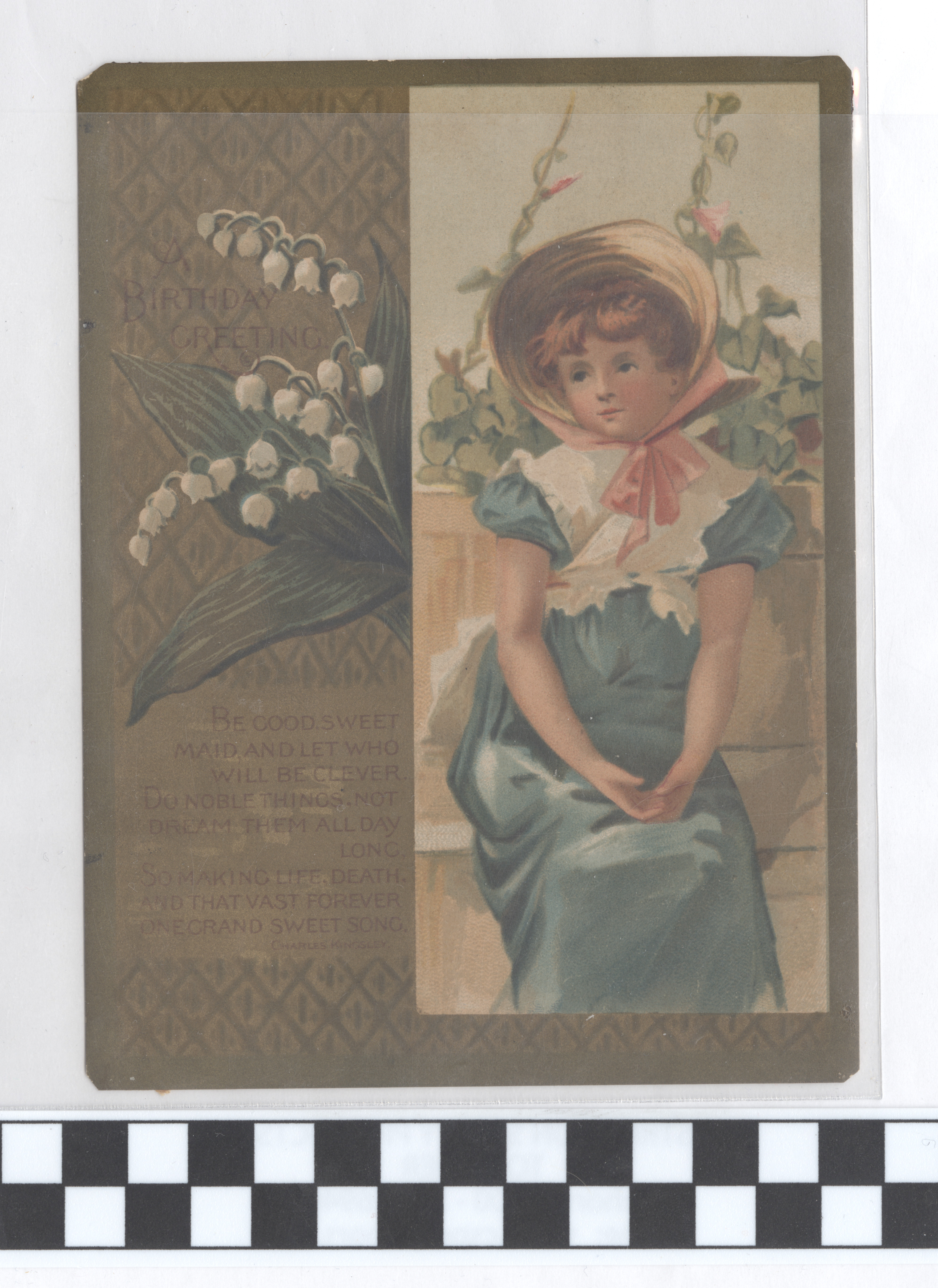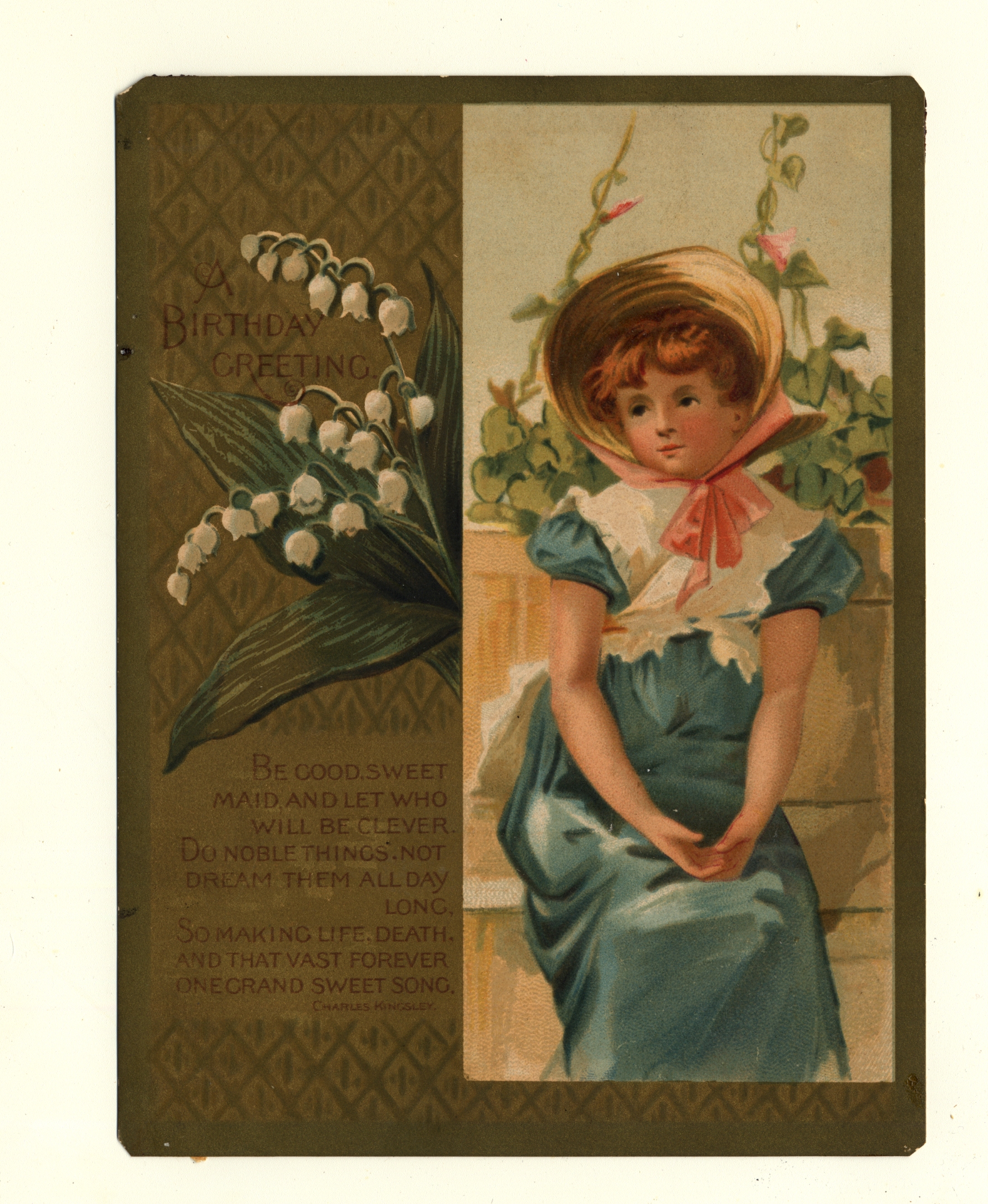 | Description | Greeting cards for holidays other than Valentine’s Day and Christmas also used sentimental imagery and messages to attract consumers. Greeting card manufacturers of the 19th century generally incorporated wholesome imagery and morality to appeal to a wide consumer audience. The positivity and innocence of these ephemeral pieces became associated with greater profits and circulation, so many manufacturers chose to duplicate this style in their own cards. This card demonstrates the sentimental theme by featuring a young woman wearing a bonnet and a birthday poem. Such a scene encourages warm and affectionate feelings from consumers. |