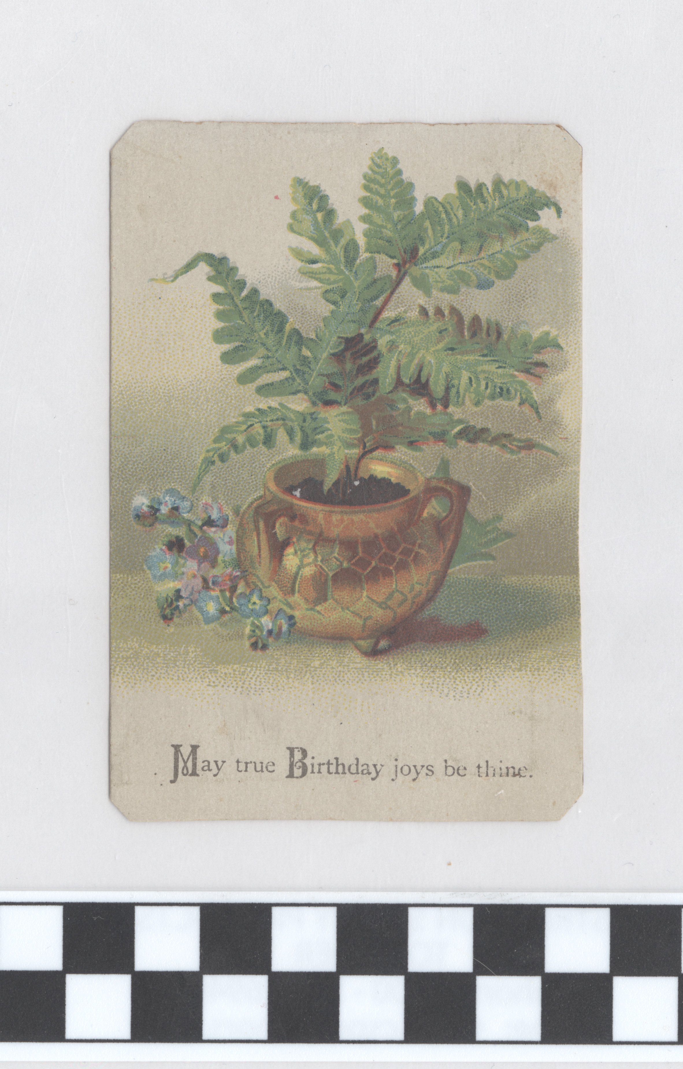 | Description | Greeting cards for holidays other than Valentine’s Day and Christmas also used sentimental imagery and messages to attract consumers. Greeting card manufacturers of the 19th century generally incorporated wholesome imagery and morality to appeal to a wide consumer audience. The positivity and innocence of these ephemeral pieces became associated with greater profits and circulation, so many manufacturers chose to duplicate this style in their own cards. This card demonstrates the sentimental theme by featuring a plant in an ornate planter with a birthday message below. Such a scene encourages warm and affectionate feelings from consumers. |