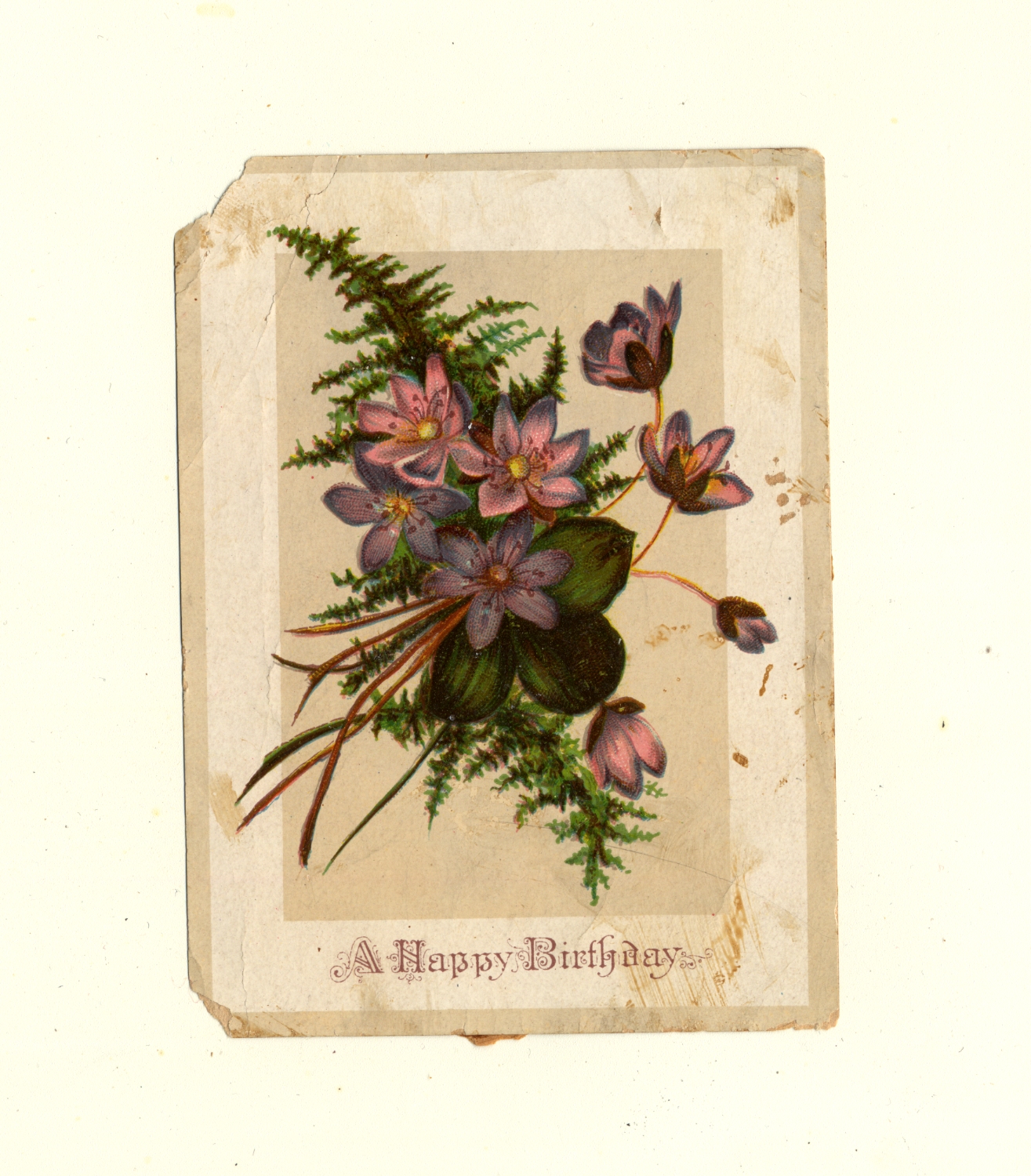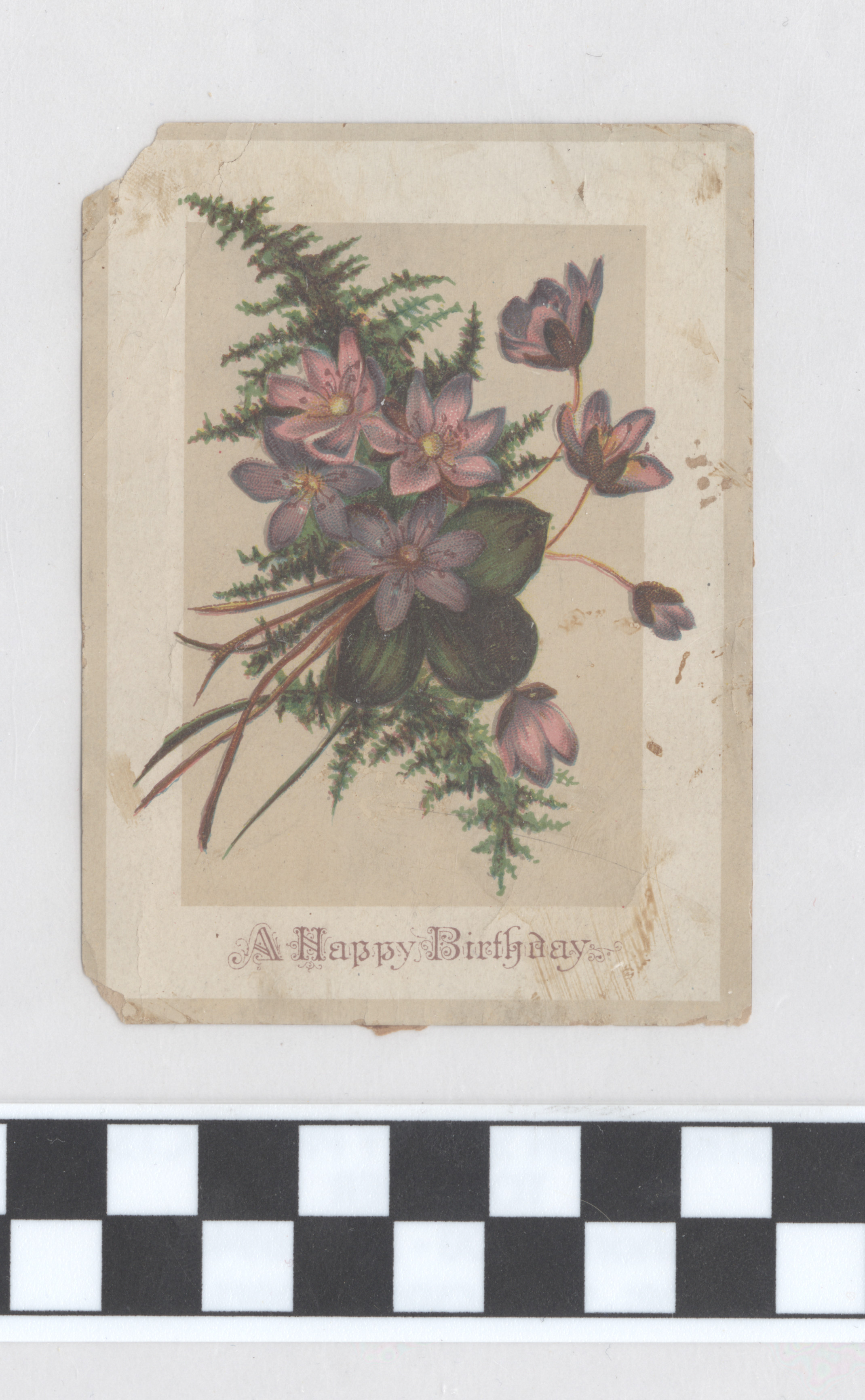 | Description | Greeting cards for holidays other than Valentine’s Day and Christmas also used sentimental imagery and messages to attract consumers. Greeting card manufacturers of the 19th century generally incorporated wholesome imagery and morality to appeal to a wide consumer audience. The positivity and innocence of these ephemeral pieces became associated with greater profits and circulation, so many manufacturers chose to duplicate this style in their own cards. This card demonstrates the sentimental theme by featuring an image of a bundle of purple flowers and foliage framed by a white border. Such a scene encourages warm feelings from consumers. |