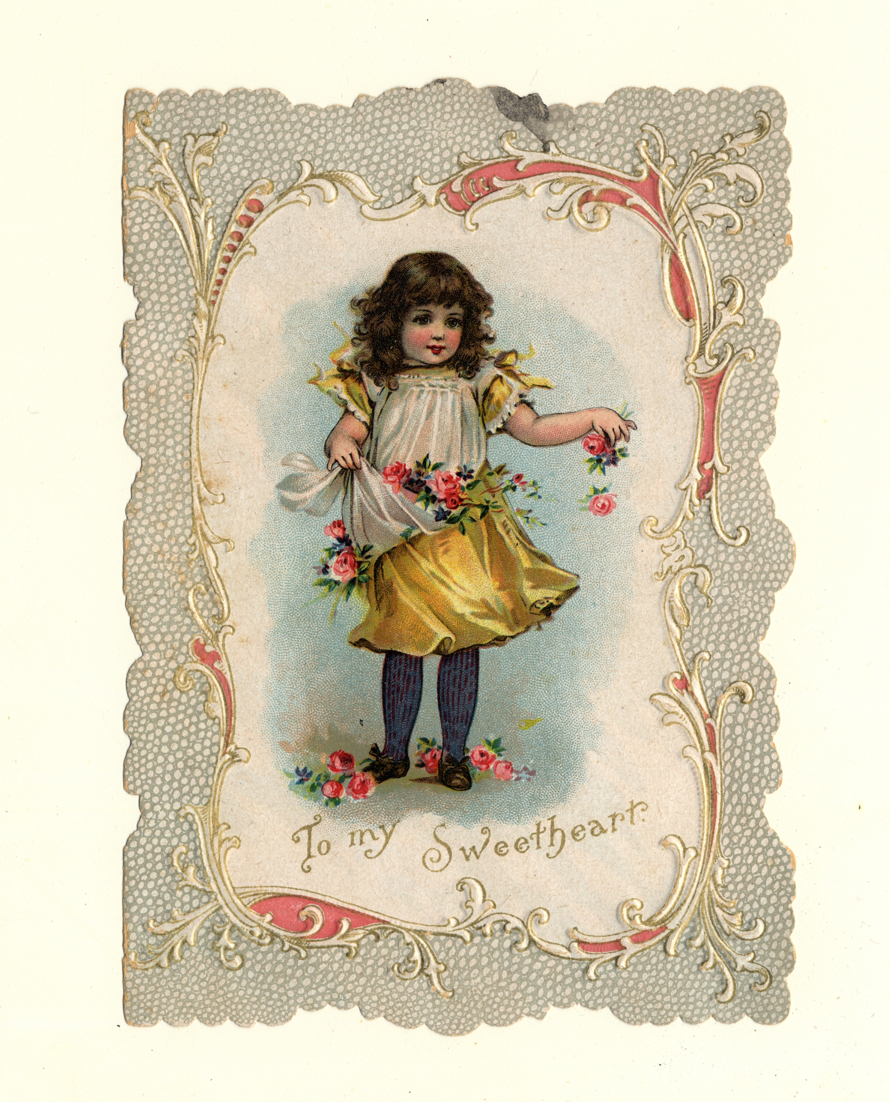 | Description | The “sentimental” Valentines of the 19th-century earned their name by frequently featuring Christian symbols, children, animals, and other saccharine images and themes. What made Valentines popular as greeting cards was their ability to convey strong emotions. Therefore, the designs of these Valentine types were meant to captivate an audience that found more wholesome love messages appealing. This card demonstrates the sentimental theme by featuring a portrait of a girl with flowers, an image that is meant to encourage warm and affectionate feelings. |