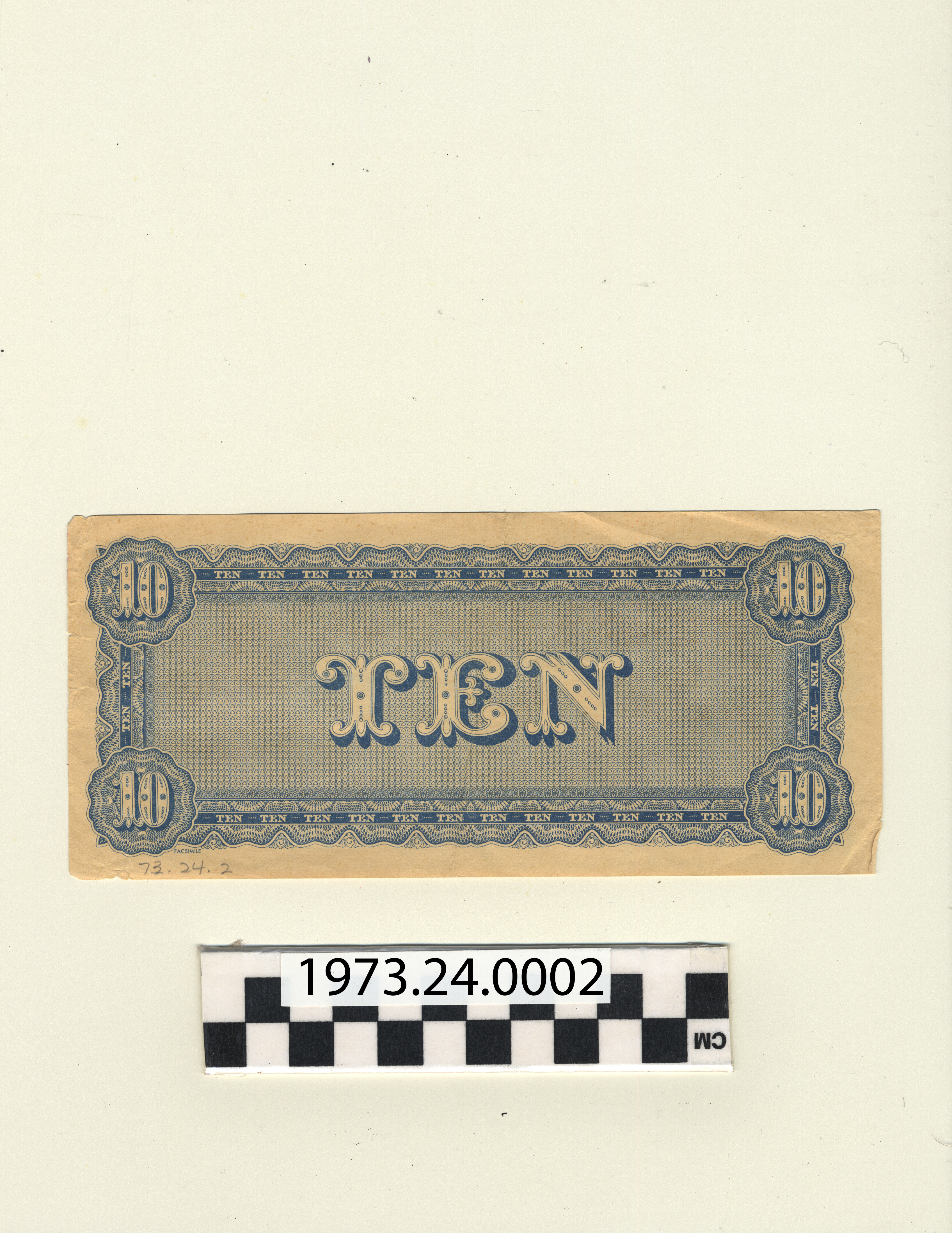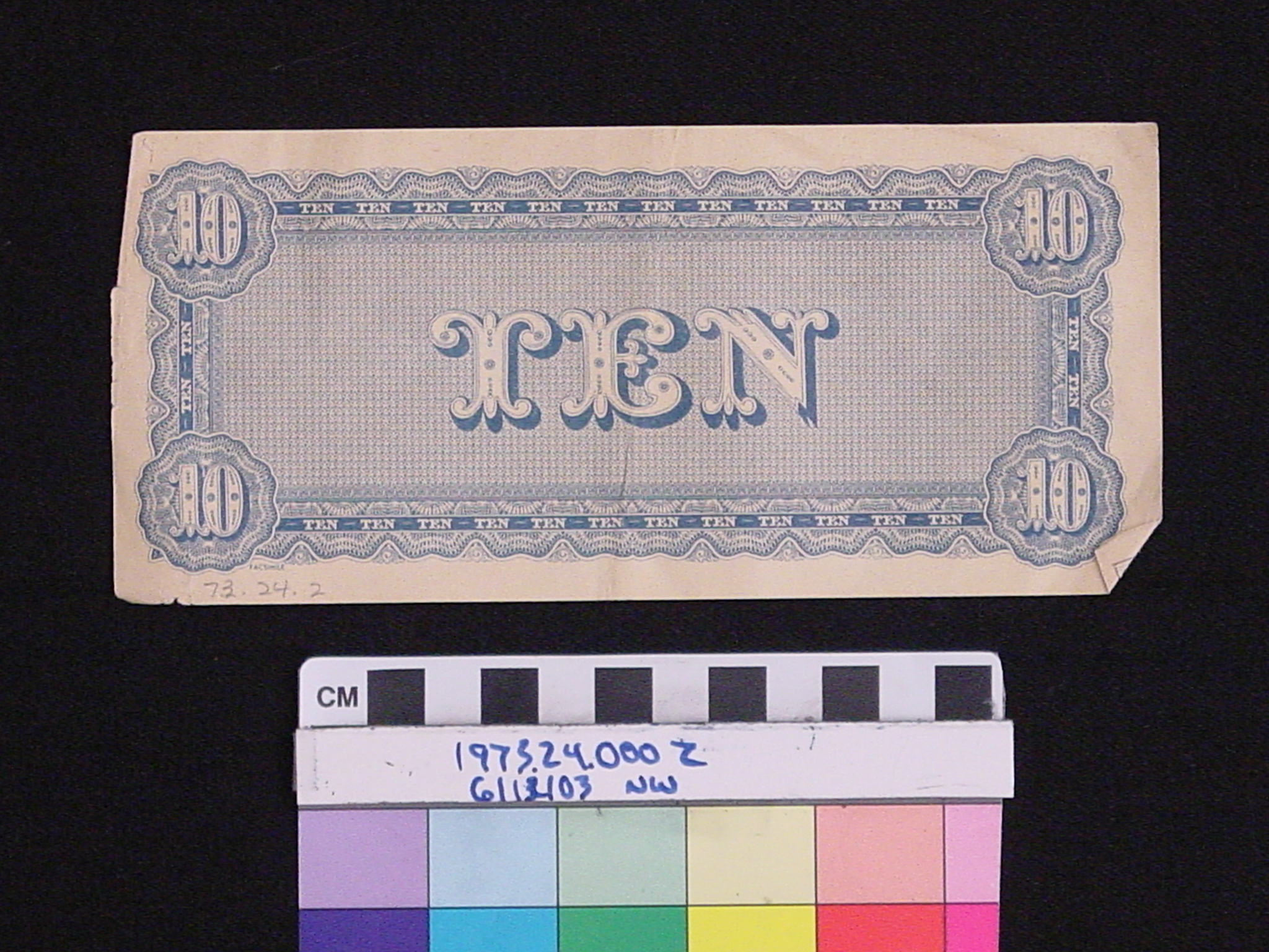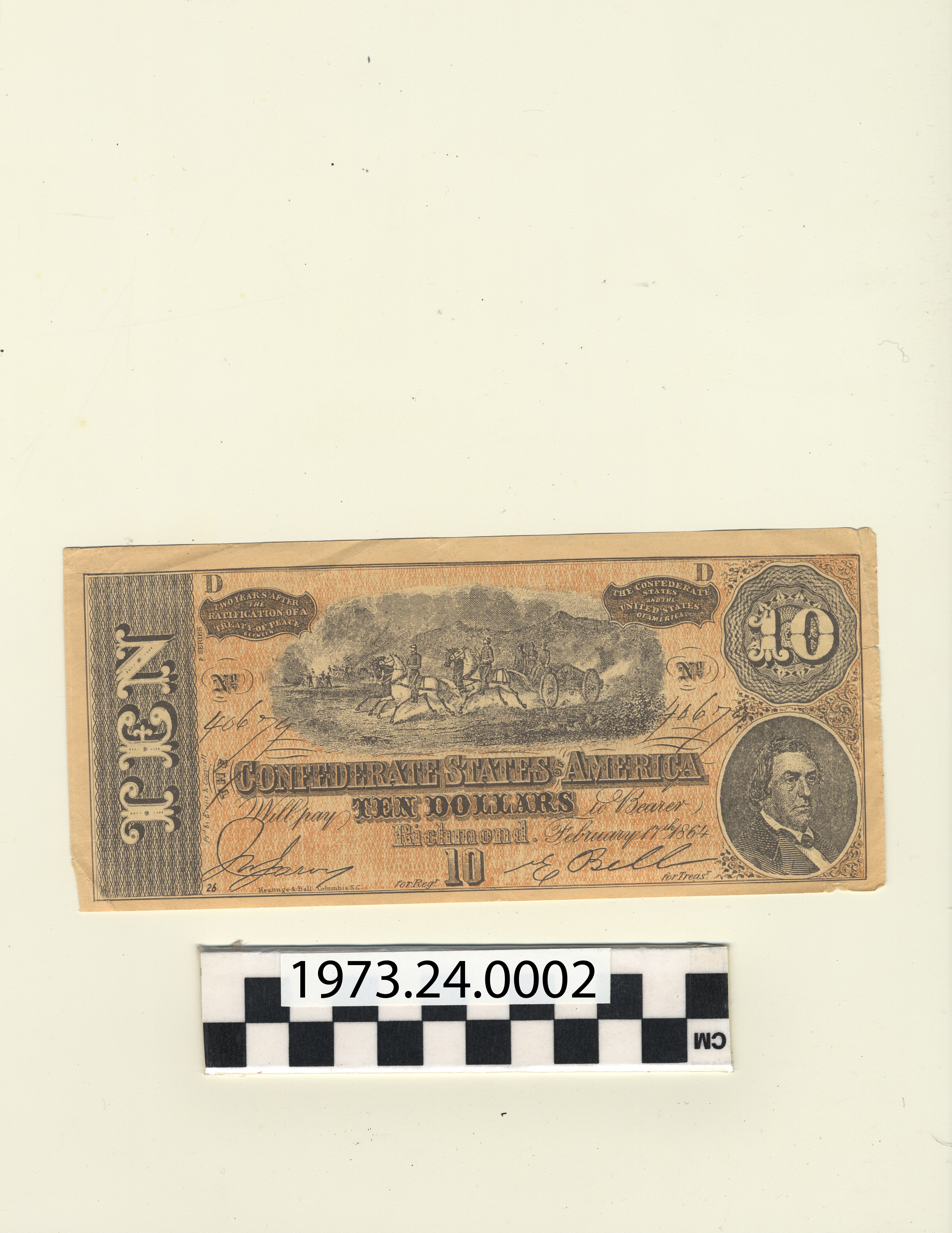 | Artifact Identification | Reproduction of Currency: Confederate $10 (1973.24.0002) |
