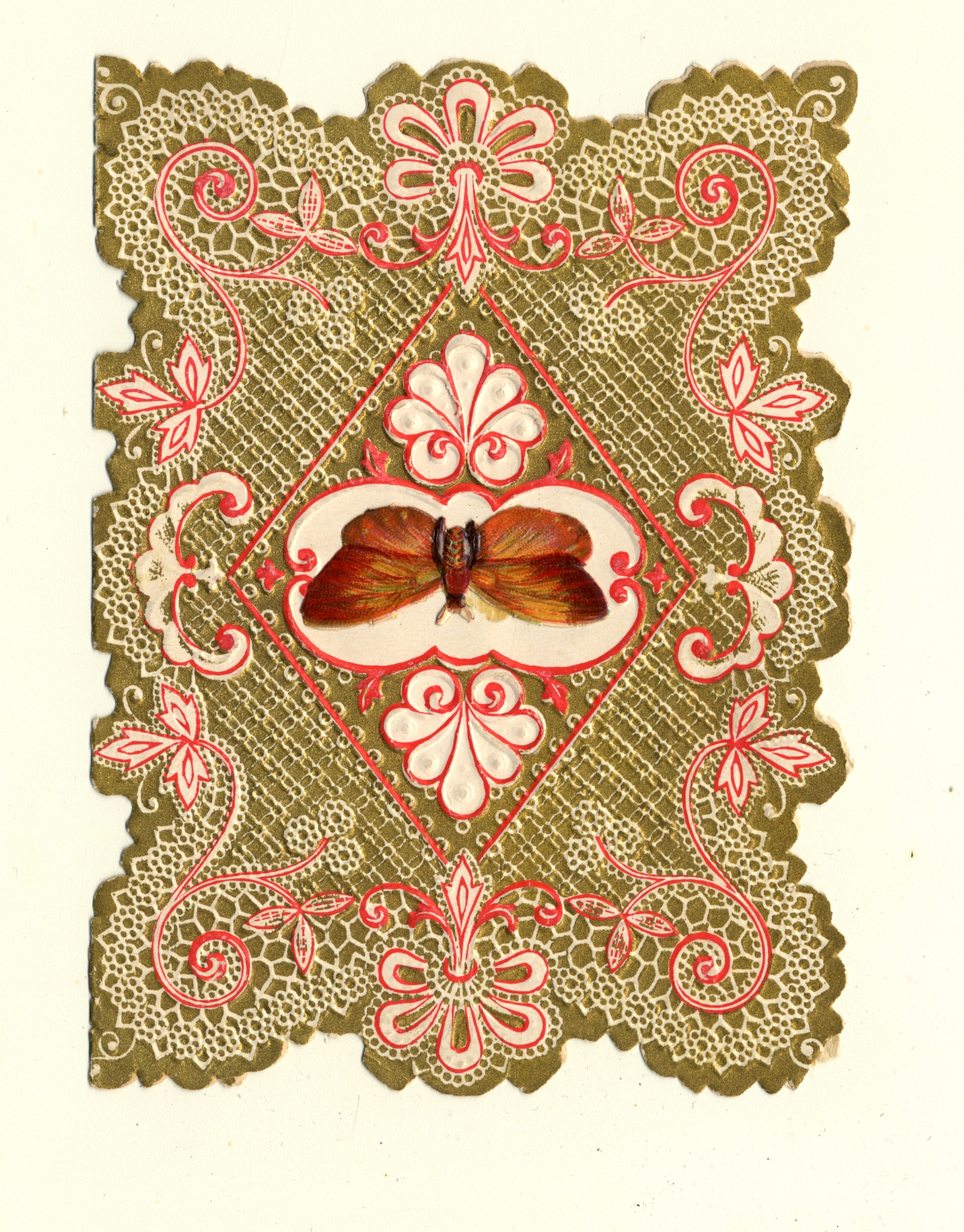 | Description | The “sentimental” Valentines of the 19th-century earned their name by frequently featuring Christian symbols, children, animals, and other saccharine images and themes. What made Valentines popular as greeting cards was their ability to convey strong emotions. Therefore, the designs of these Valentine types were meant to captivate an audience that found more wholesome love messages appealing. This card demonstrates the sentimental theme by featuring an ornate paper lace border and an image of a butterfly at the center. Such a scene is meant to encourage warm and affectionate feelings. |