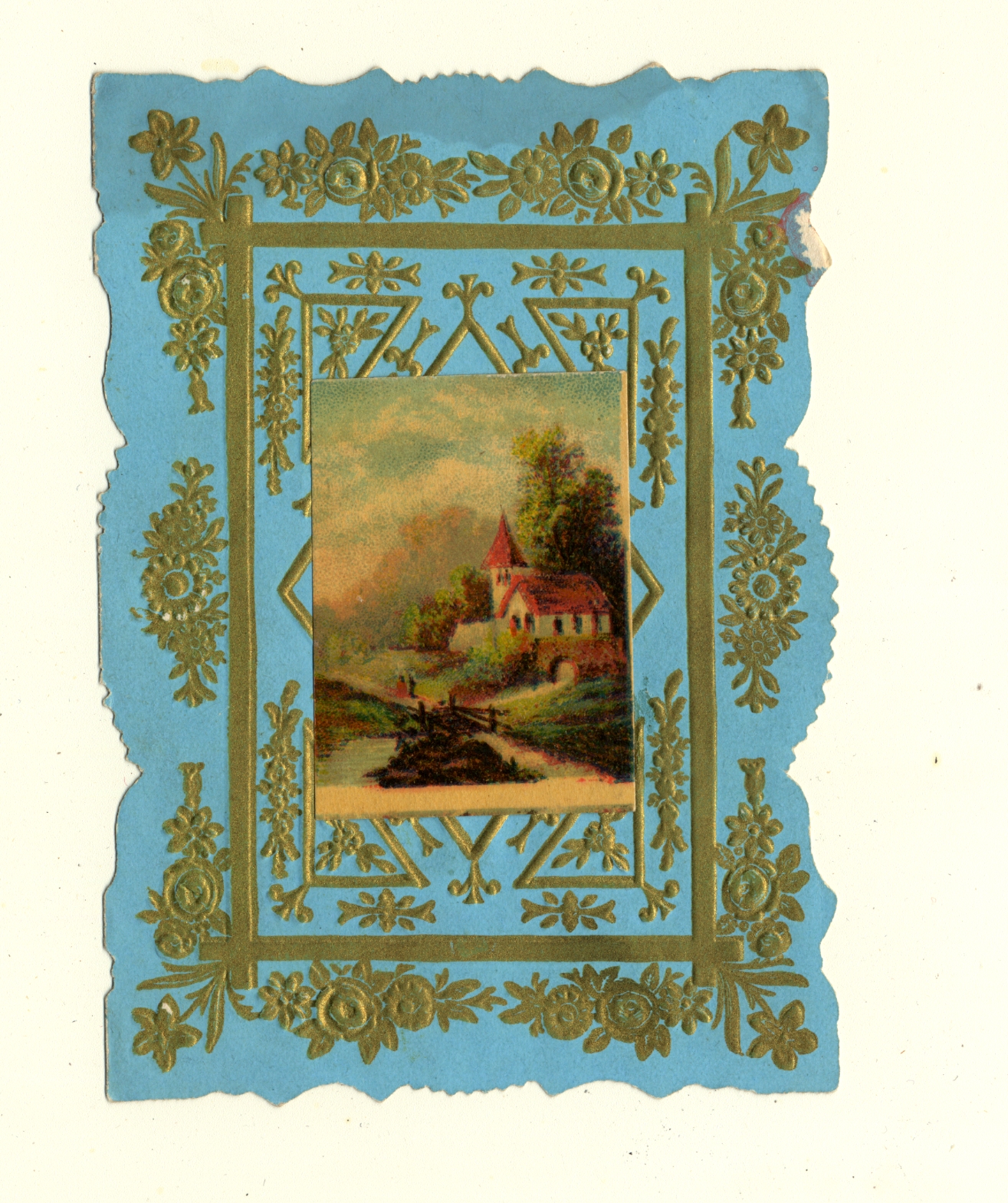 | Description | The “sentimental” Valentines of the 19th-century earned their name by frequently featuring Christian symbols, children, animals, and other saccharine images and themes. What made Valentines popular as greeting cards was their ability to convey strong emotions. Therefore, the designs of these Valentine types were meant to captivate an audience that found more wholesome love messages appealing. This card demonstrates the sentimental theme by having an ornate border with a scene of a church in a landscape at the center. Such an image is designed to encourage warm and affectionate feelings. |