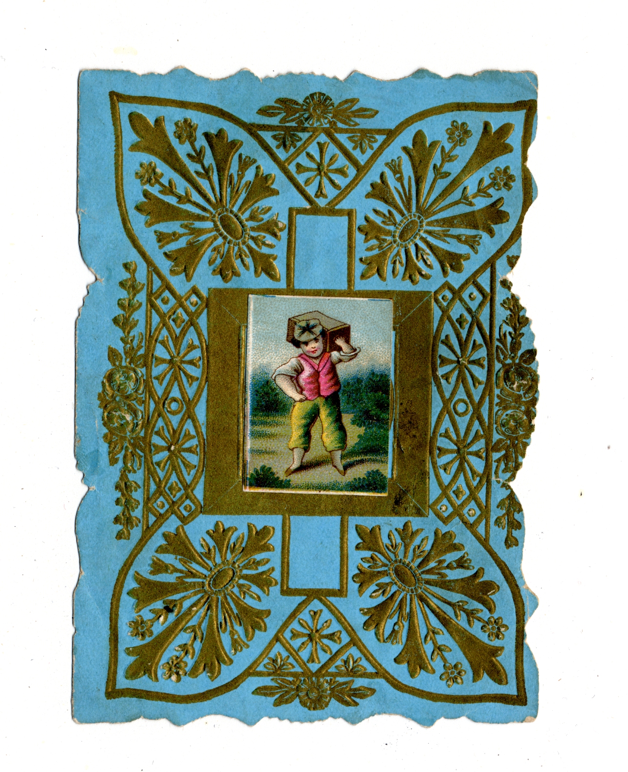 | Description | The “sentimental” Valentines of the 19th-century earned their name by frequently featuring Christian symbols, children, animals, and other saccharine images and themes. What made Valentines popular as greeting cards was their ability to convey strong emotions. Therefore, the designs of these Valentine types were meant to captivate an audience that found more wholesome love messages appealing. This card demonstrates the sentimental theme by having a picture of a boy at the center of the cover, an image that is designed to encourage warm and affectionate feelings. |