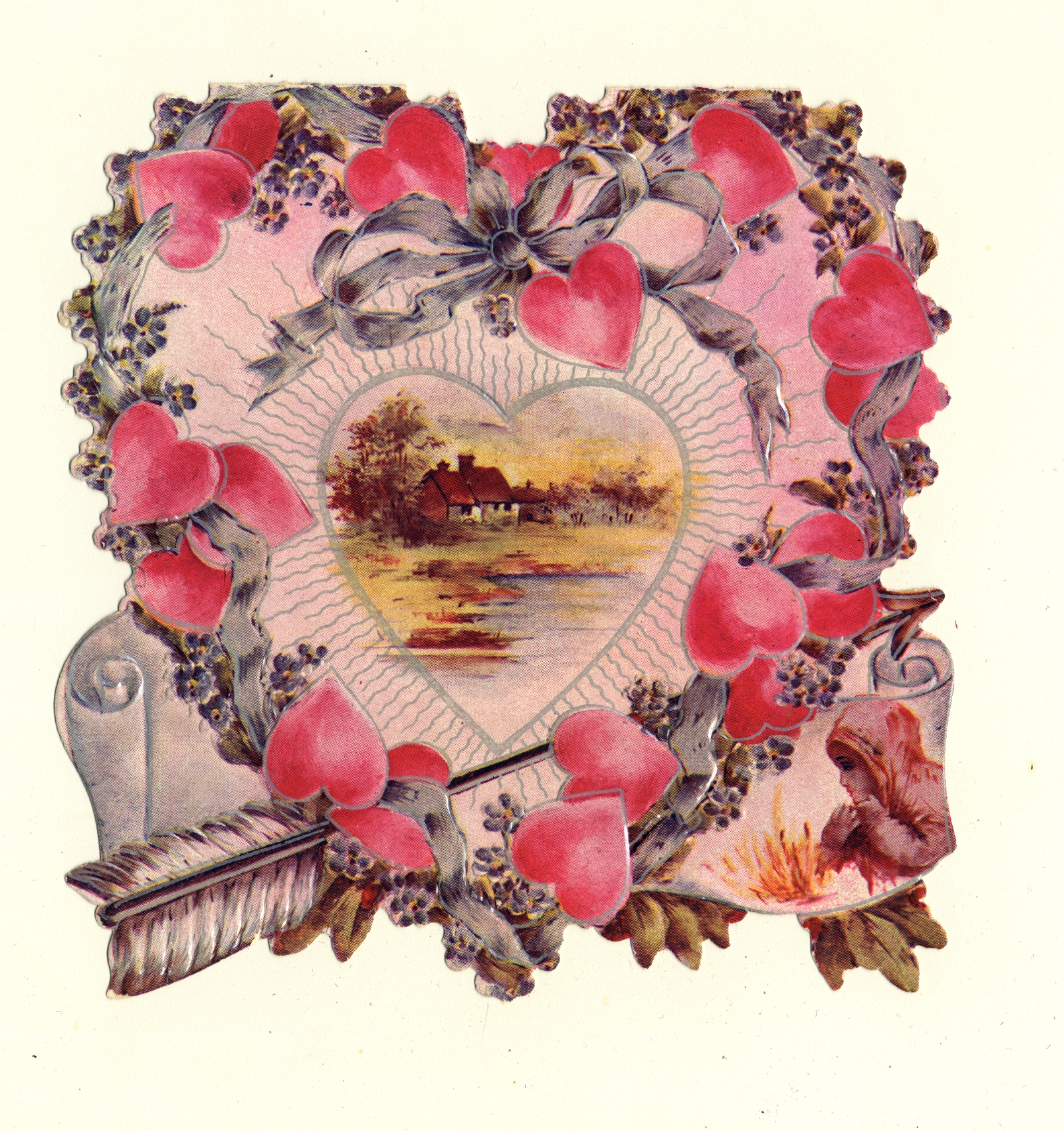| Description | The “sentimental” Valentines of the 19th-century earned their name by frequently featuring Christian symbols, children, animals, and other saccharine images and themes. What made Valentines popular as greeting cards was their ability to convey strong emotions. Therefore, the designs of these Valentine types were meant to captivate an audience that found more wholesome love messages appealing. This card demonstrates the sentimental theme by featuring a landscape of a house surrounded by hearts, ribbons, and arrows. Such a scene is meant to encourage warm and affectionate feelings. |