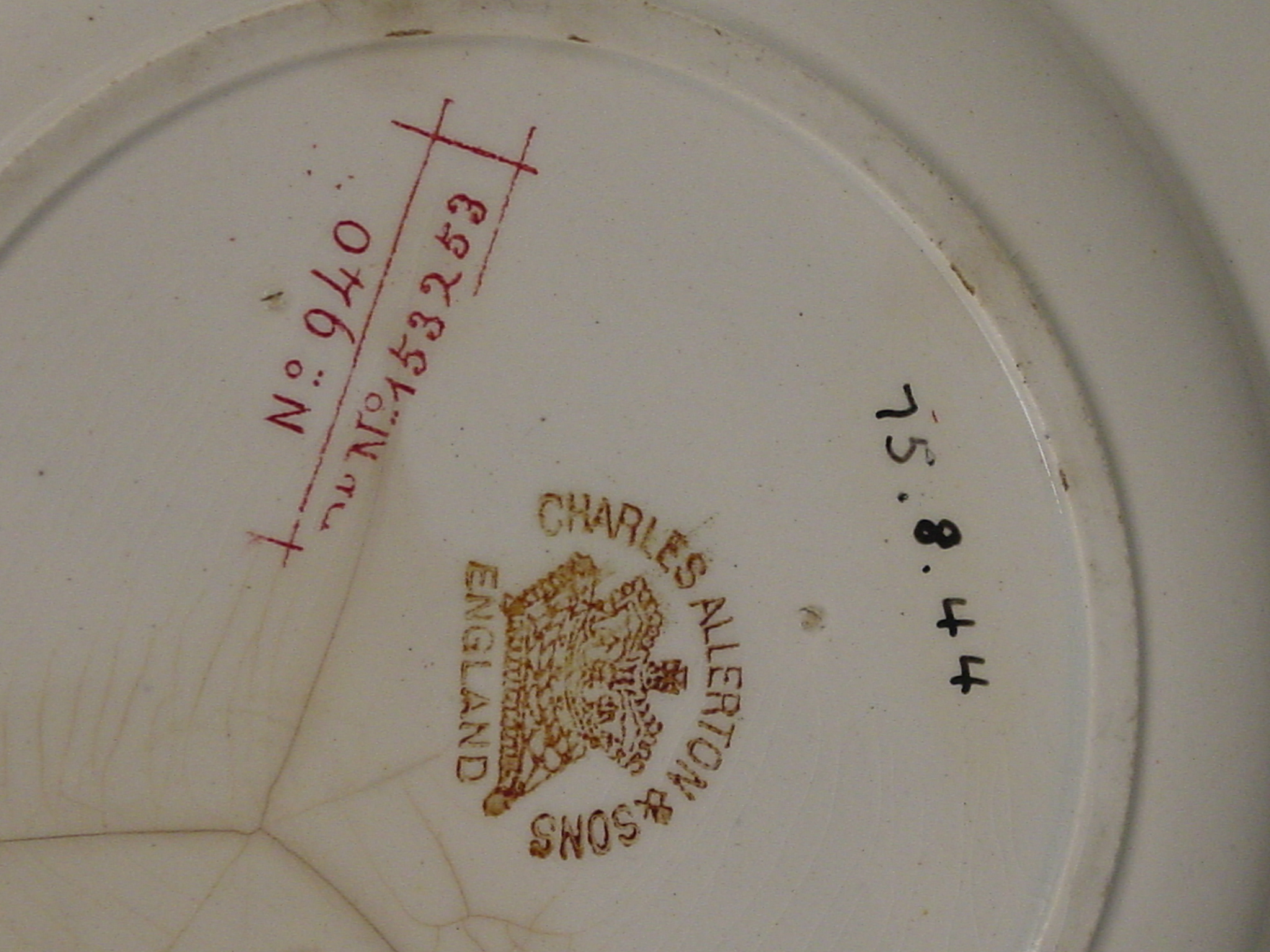 | Artist/Maker | Manufacturer's stamp in brown on base: circumscribing a crown on a pillow “Charles Allerton & Sons, England“ Item number printed in red glaze on base: “No 940 Pt(?) No 153253“ “Staffordshire potteries“ written on Acc. Card. |
