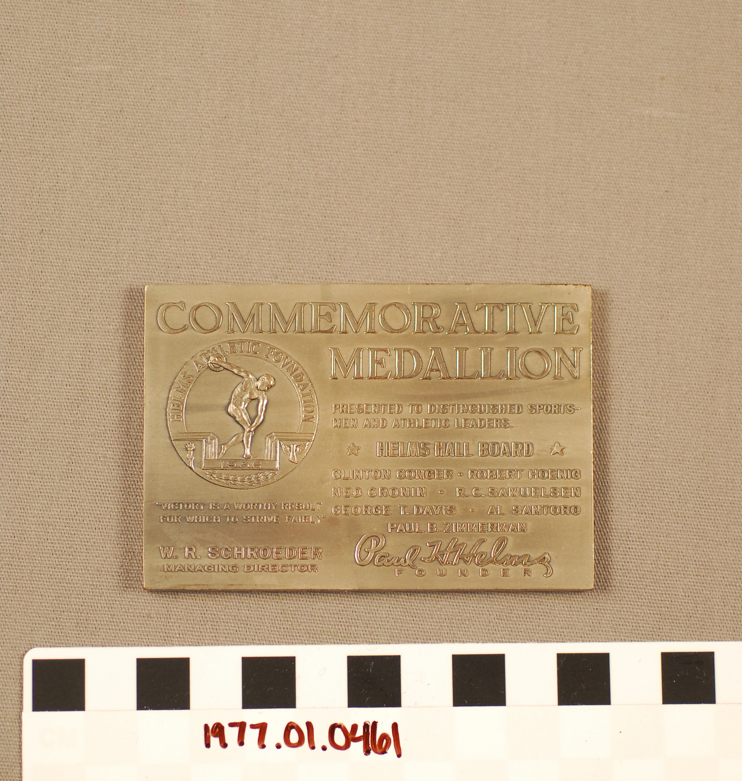 | Artifact Identification | Commemorative Plaque: Helms Hall (1977.01.0461) |