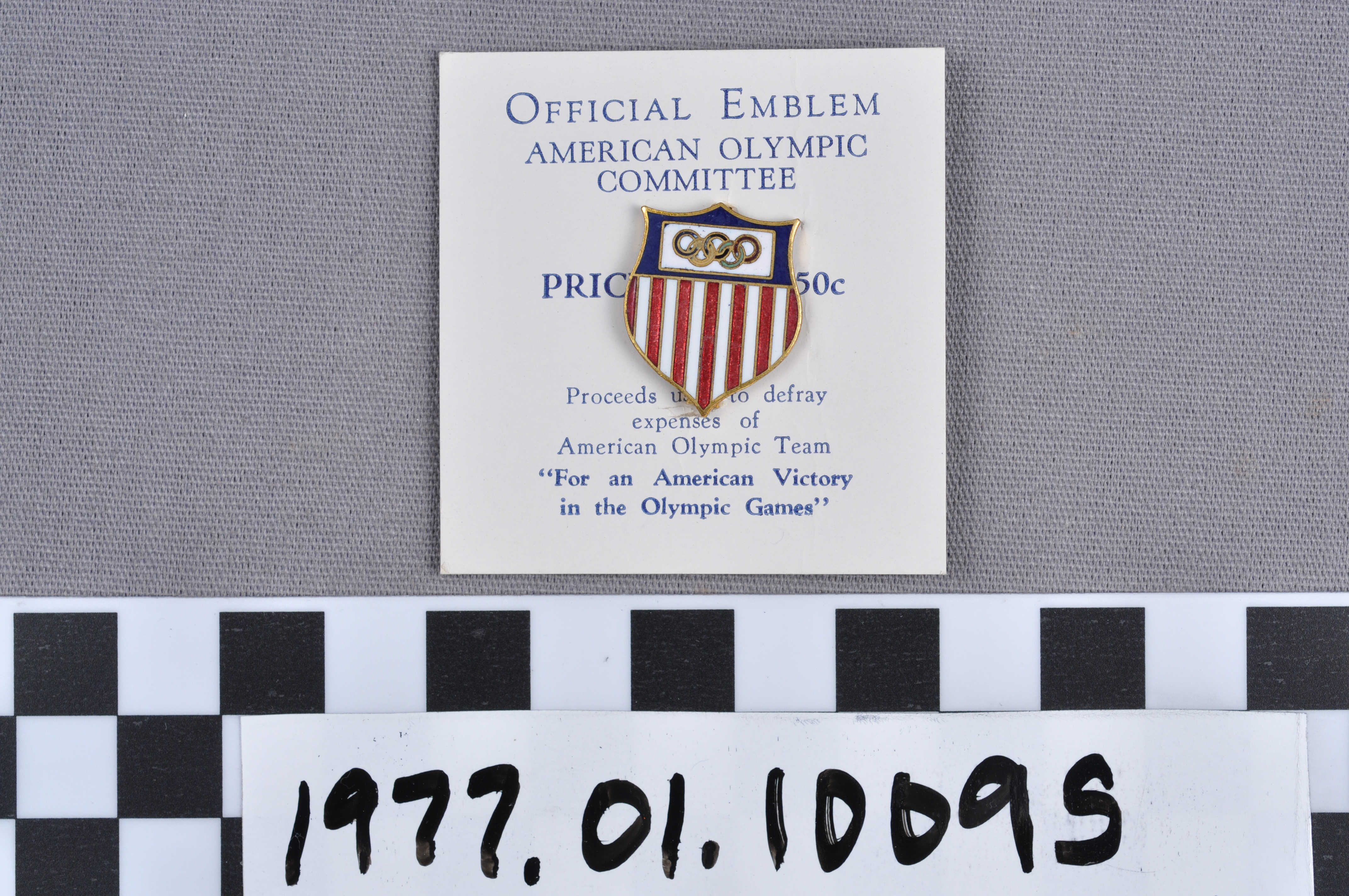 | Artifact Identification | Commemorative Olympic Pin: Official Emblem, mounted on white paper stock (1977.01.1009S) |