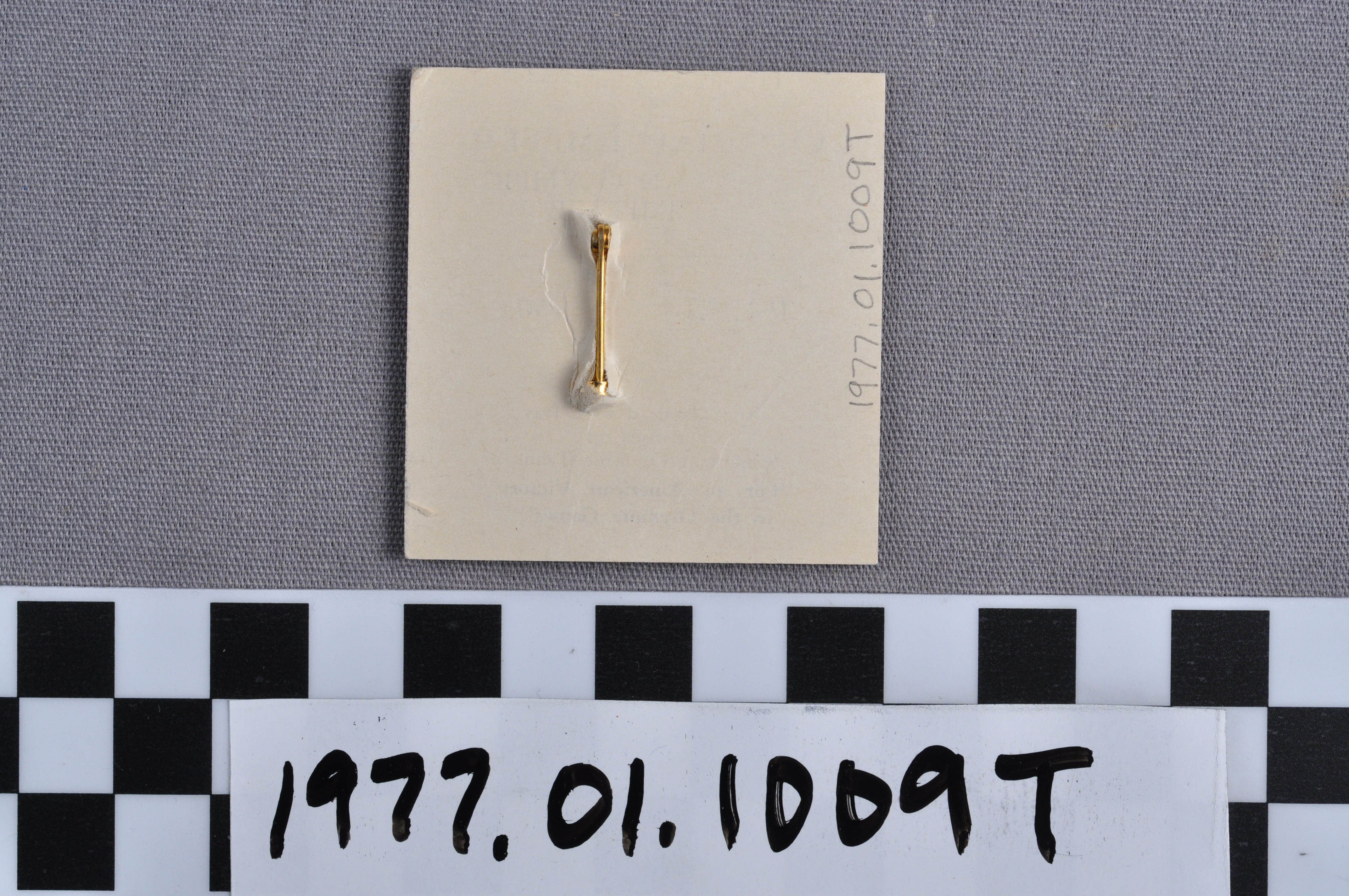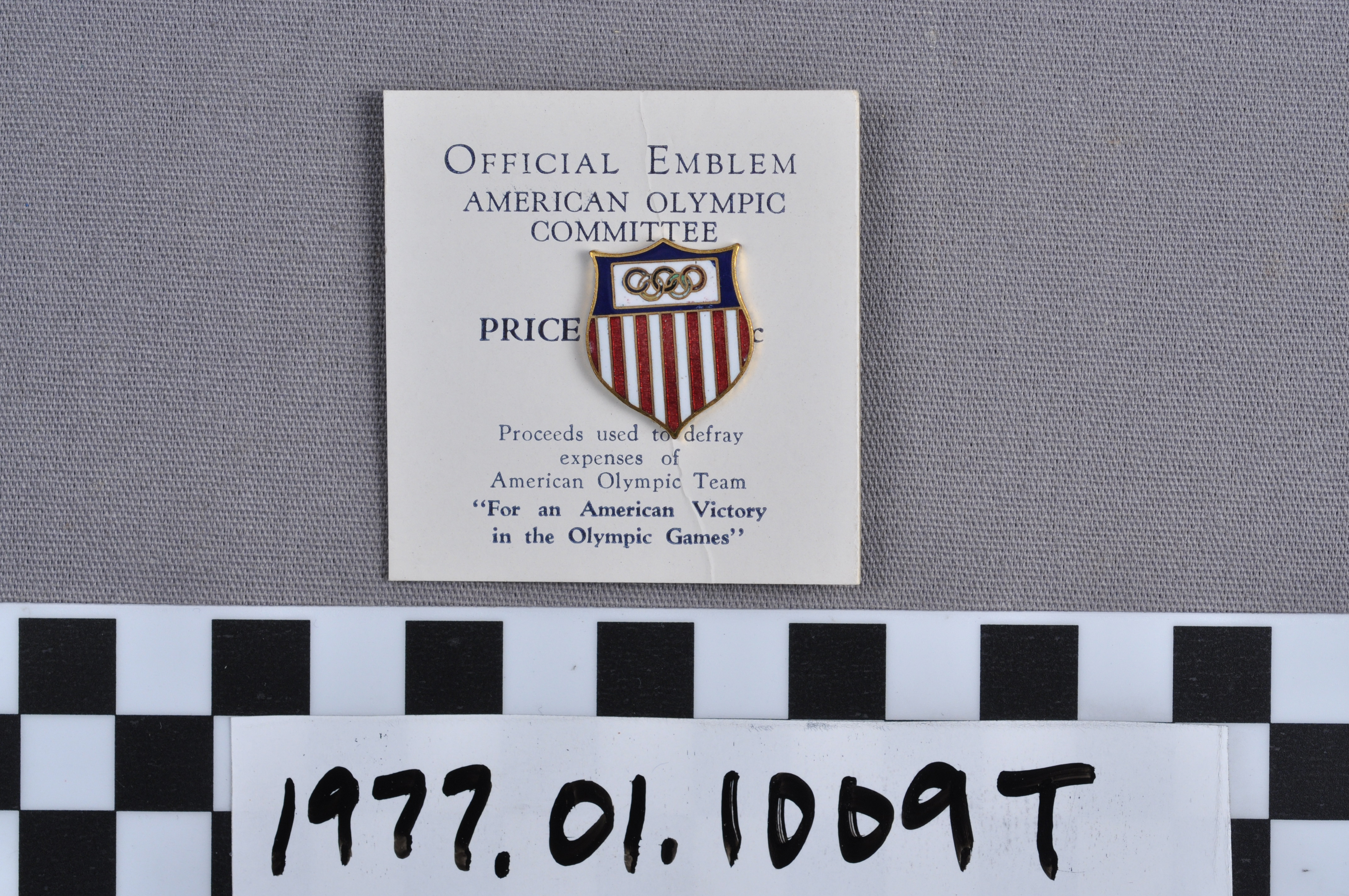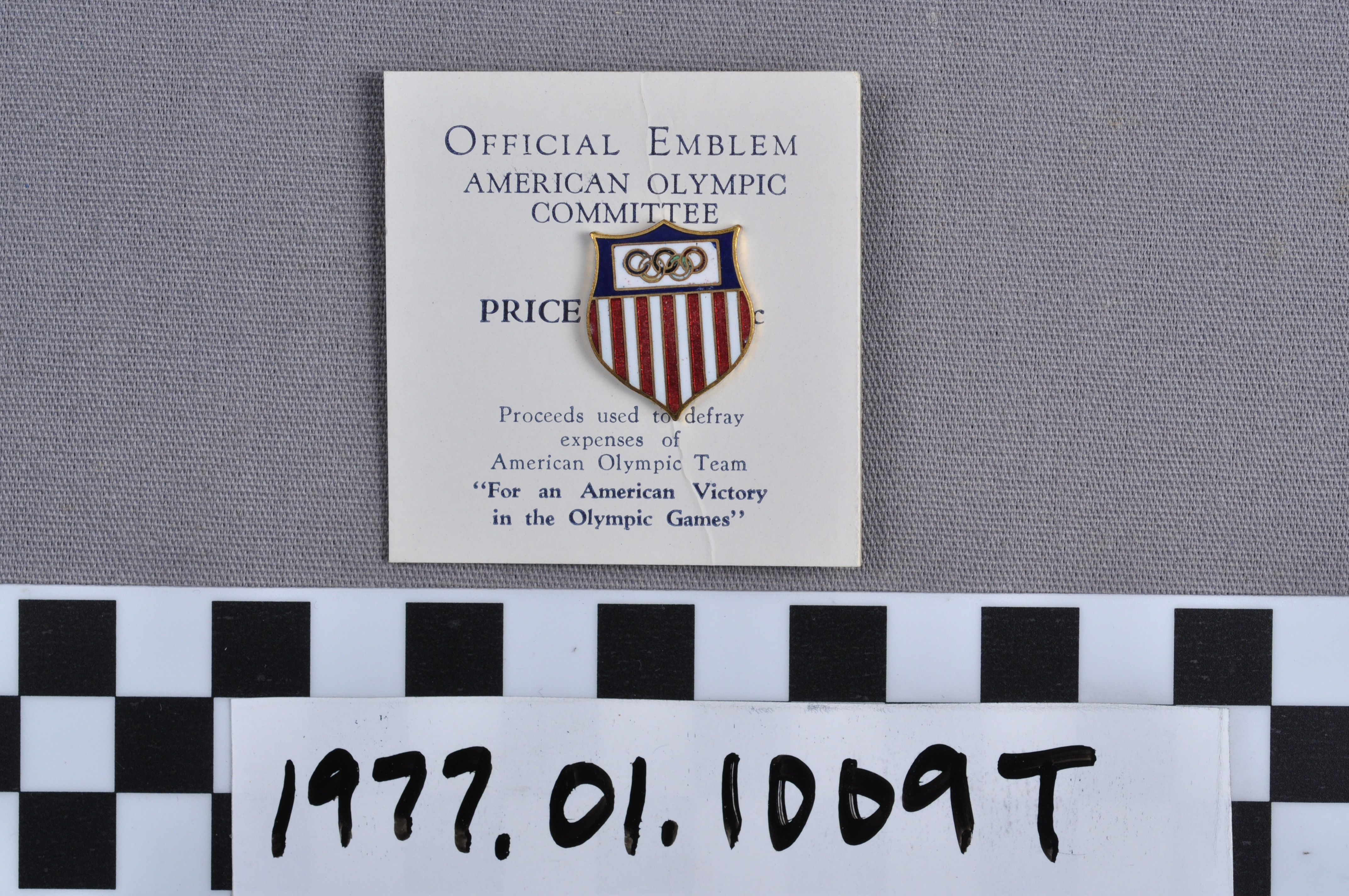 | Artifact Identification | Commemorative Olympic Pin: Official Emblem, Mounted on white paper stock (1977.01.1009T) |