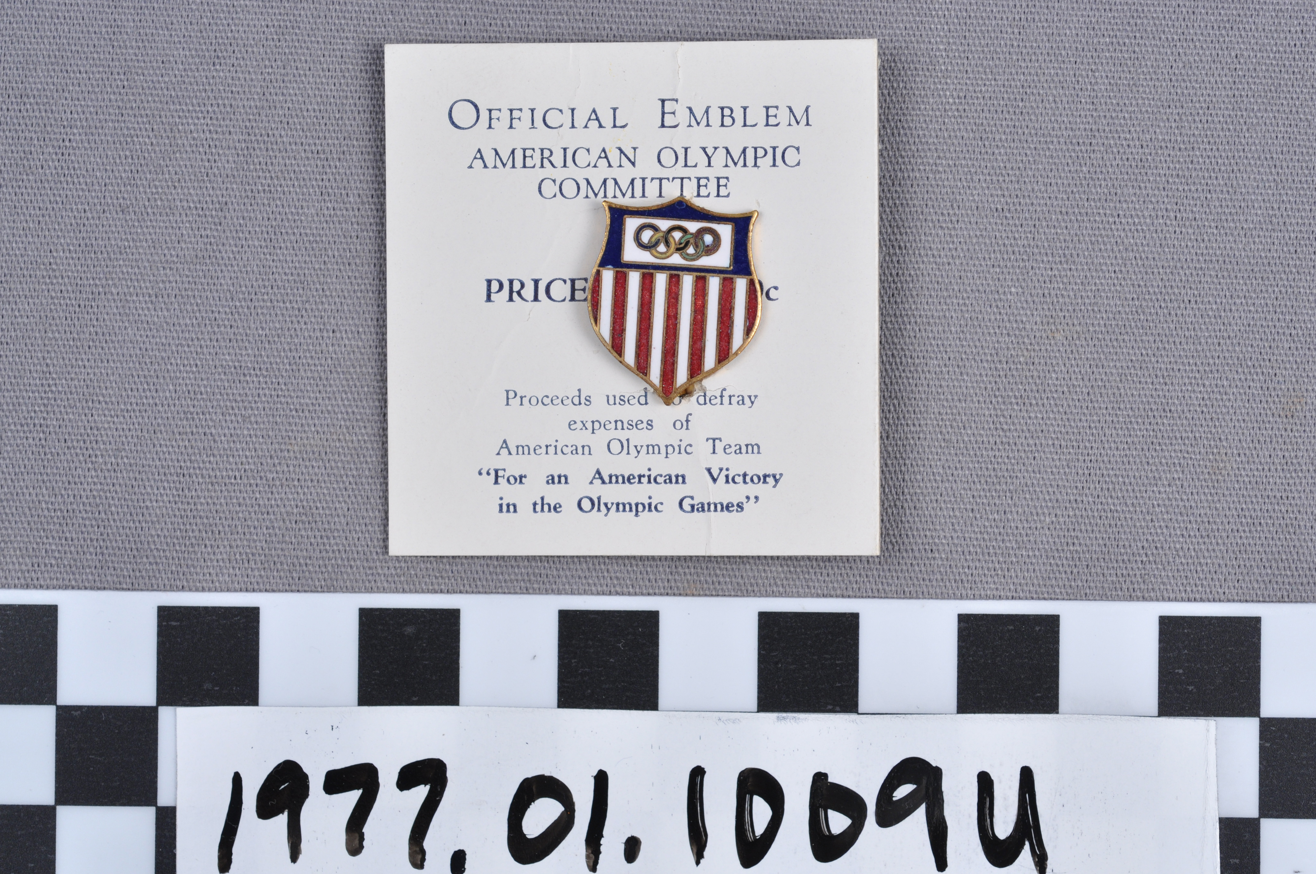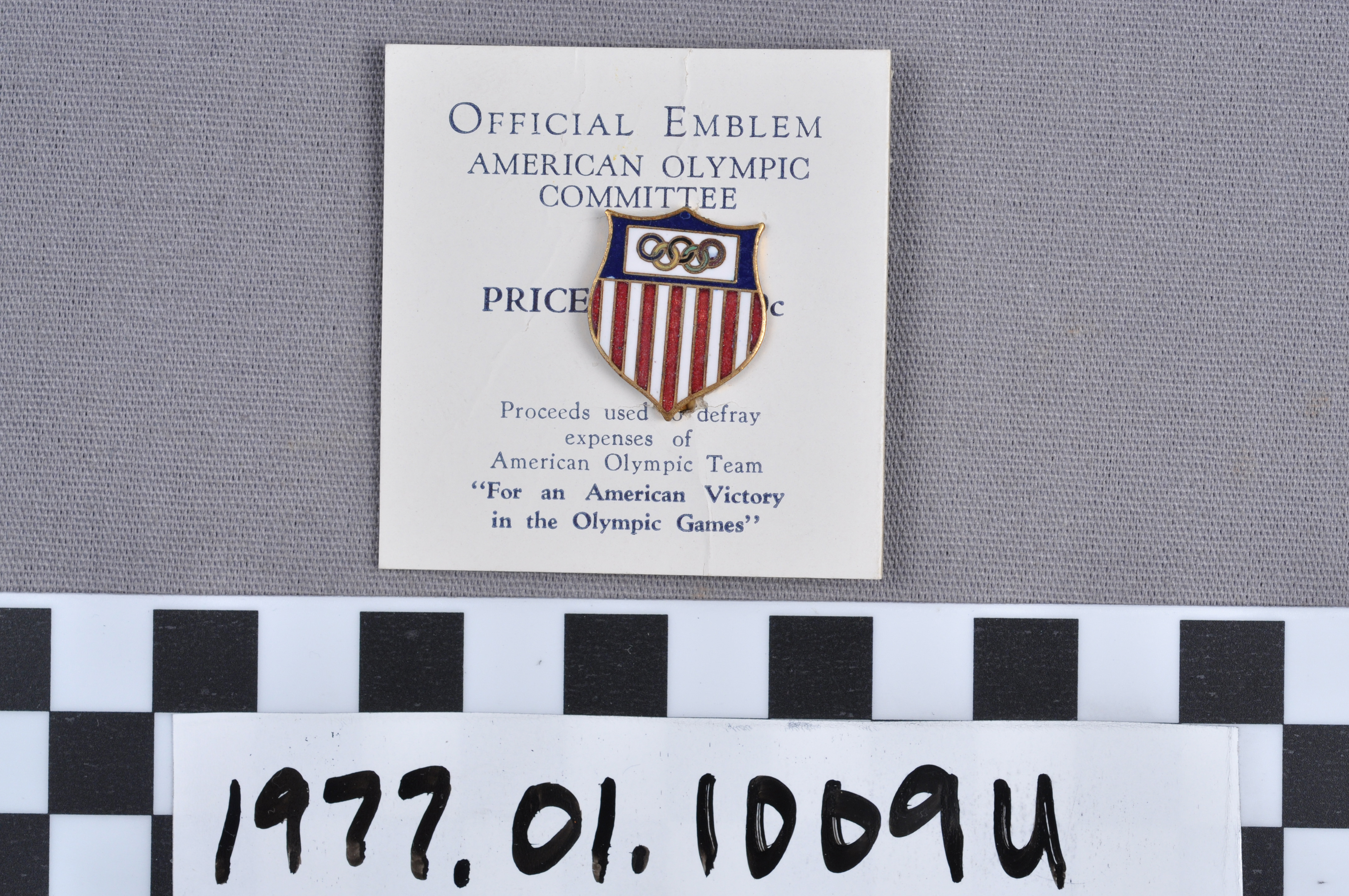 | Artifact Identification | Commemorative Olympic Pin: Official Emblem, Mounted on white paper stock (1977.01.1009U) |