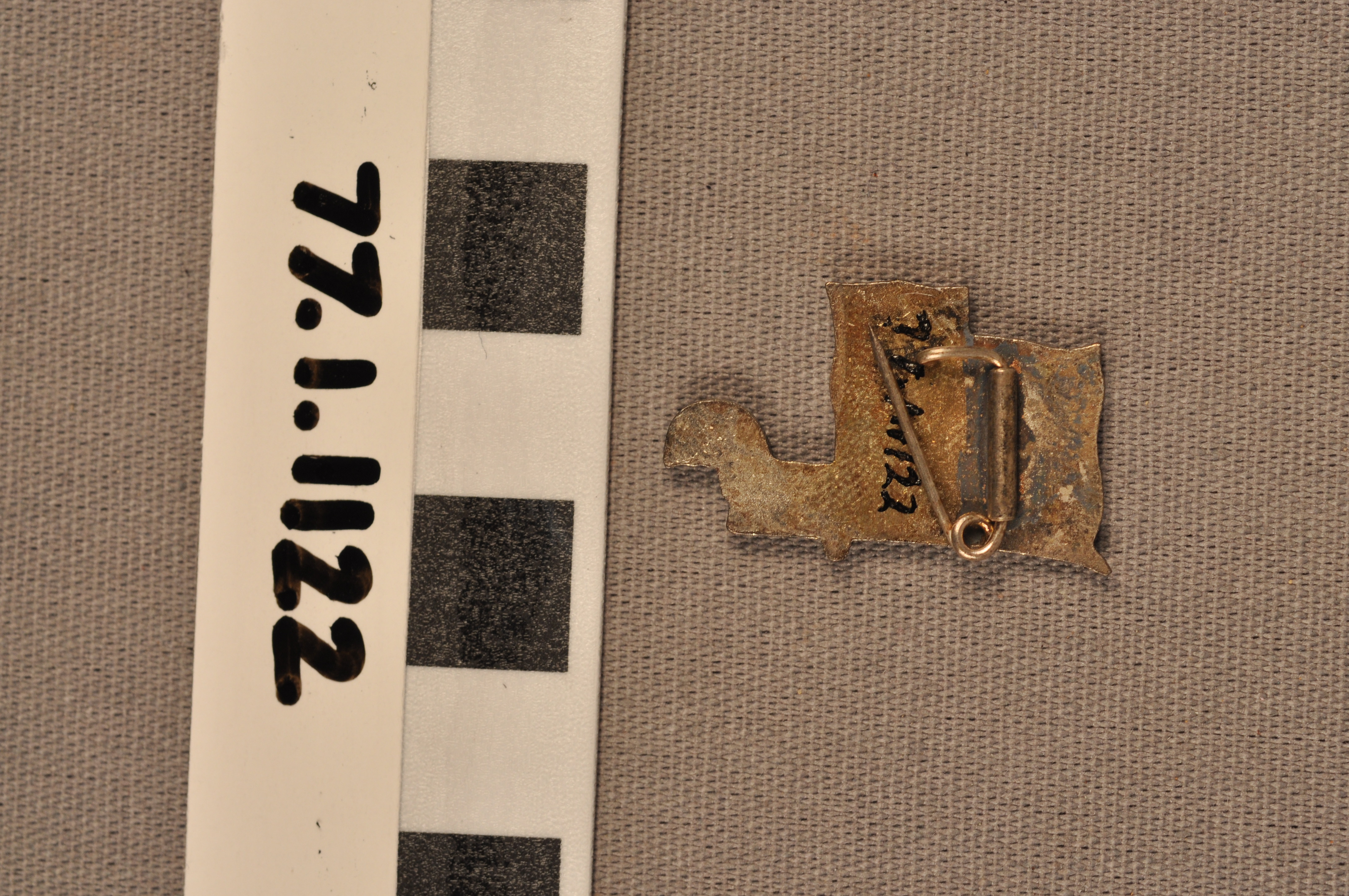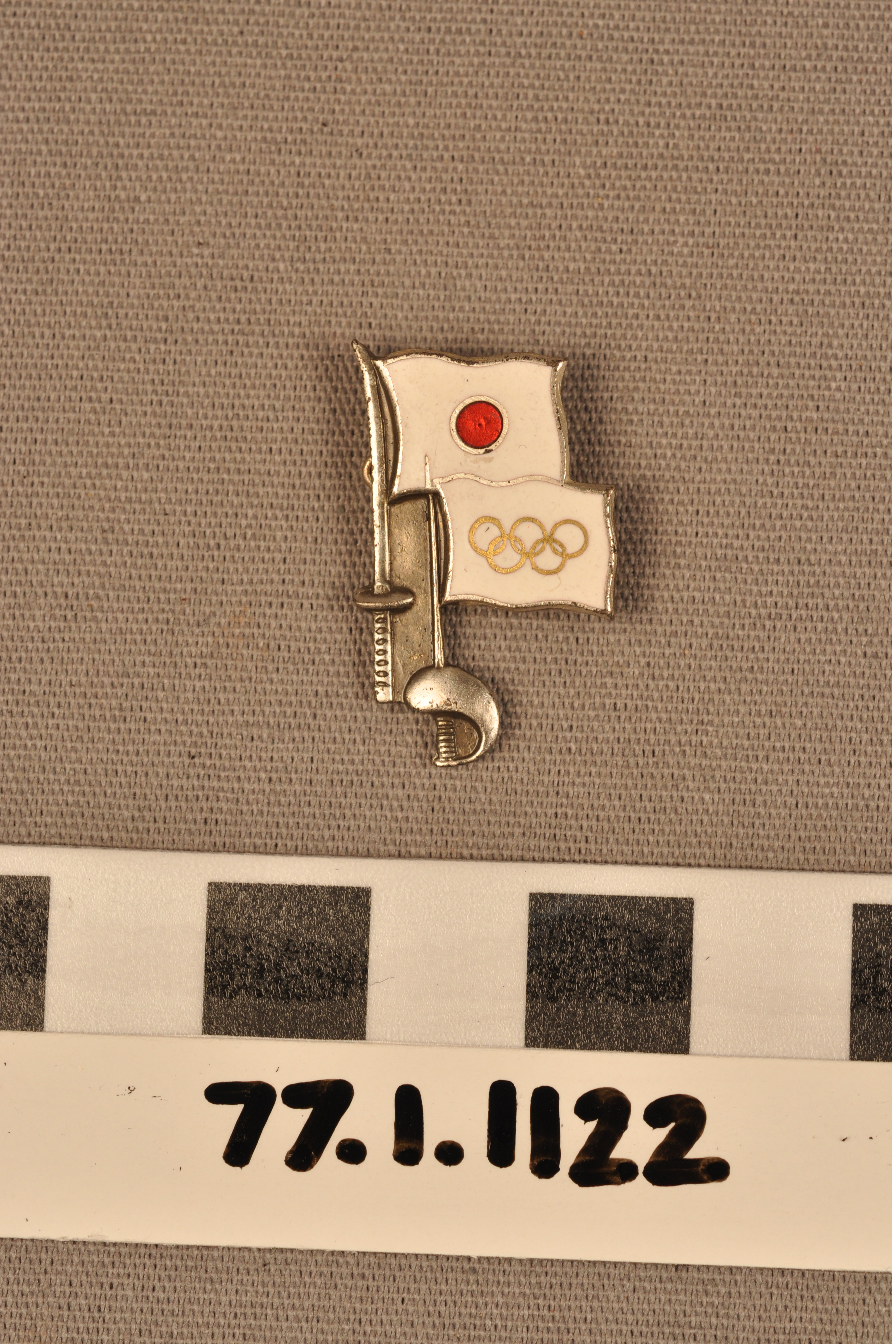 | Artifact Identification | Commemorative Olympic Pin: Flag of Japan, Olympic Flag, Curved Sword (1977.01.1122) |