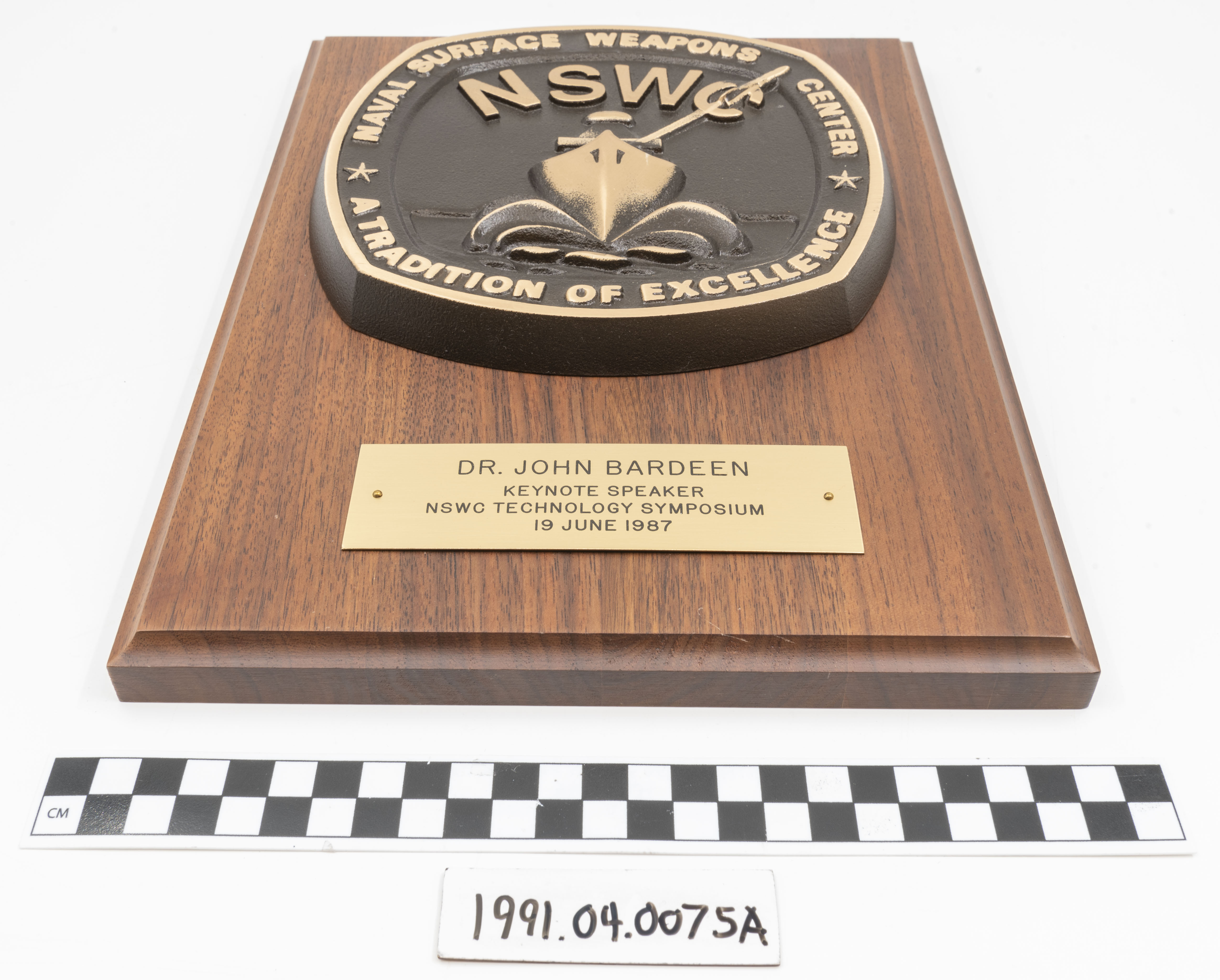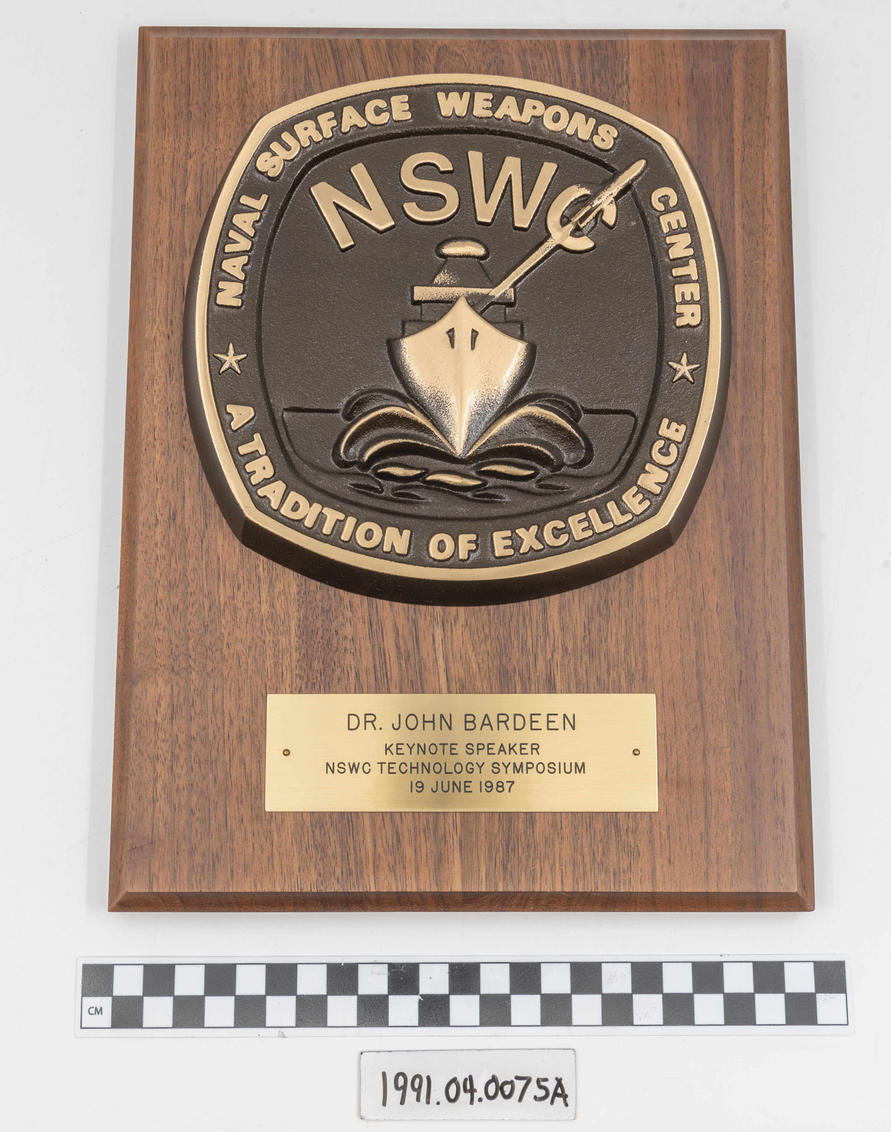 Artifact Identification | Commemorative Plaque: "Dr. John Bardeen, Keynote Speaker, Naval Surface Weapons Center Technology Symposium" (1991.04.0075A) |