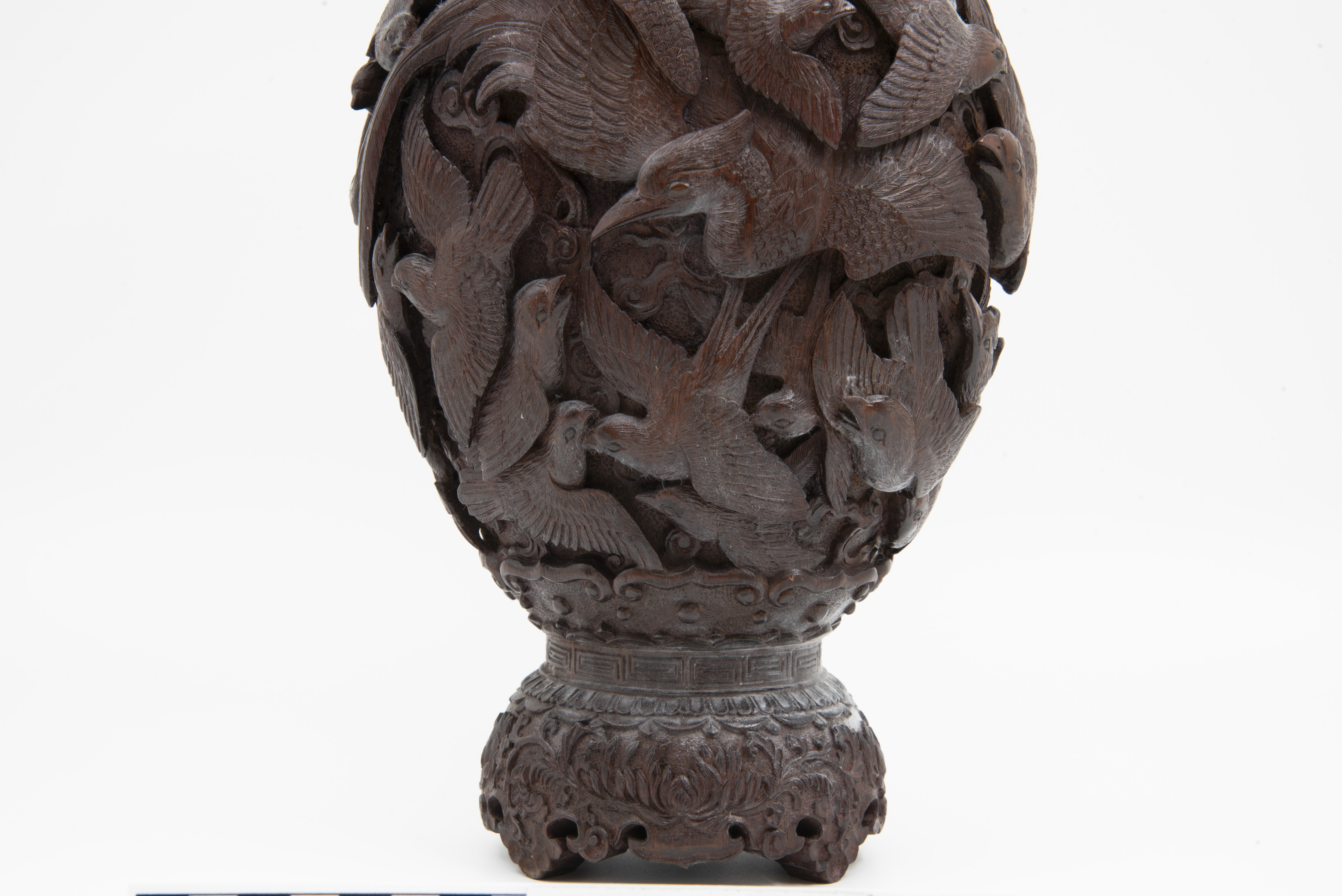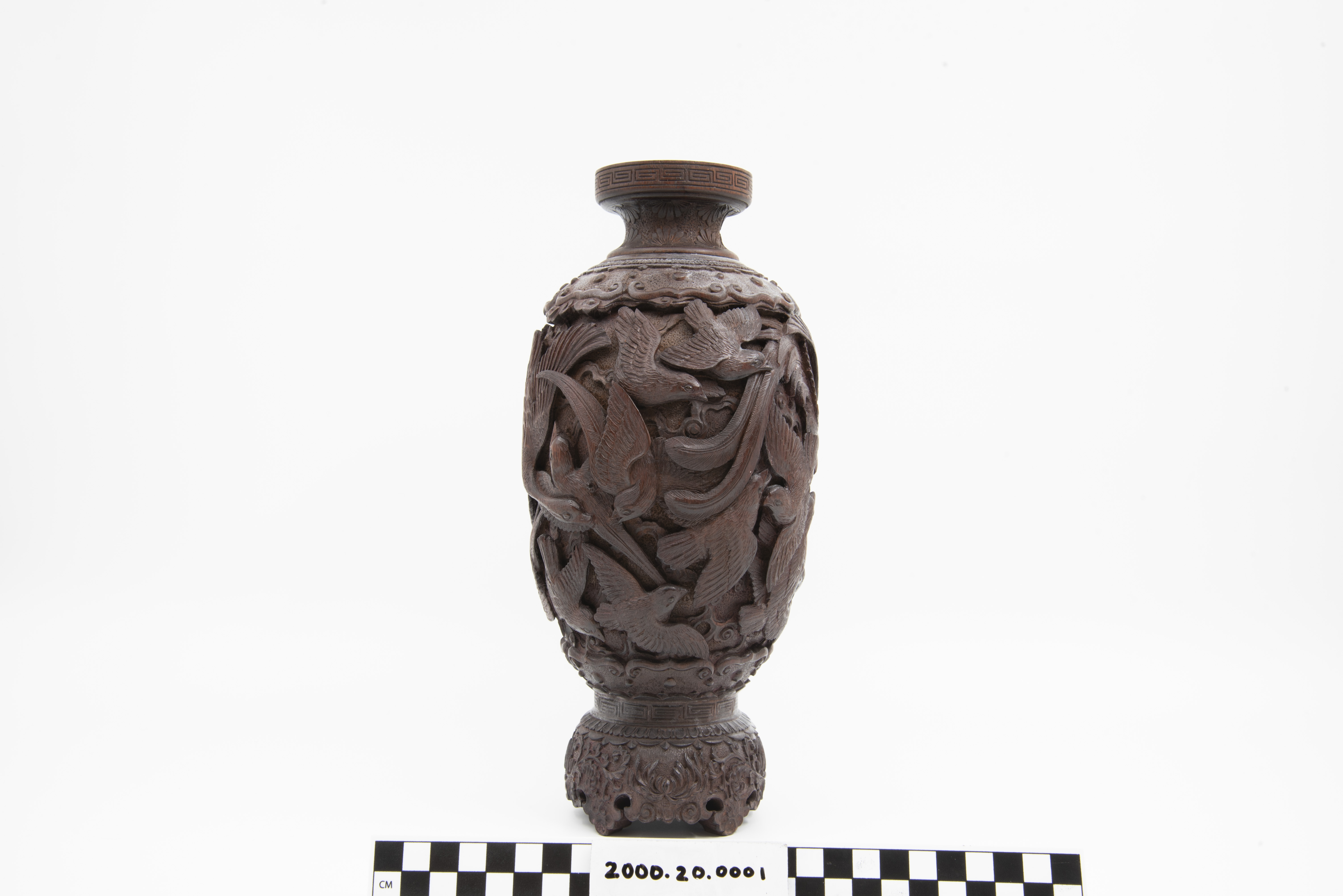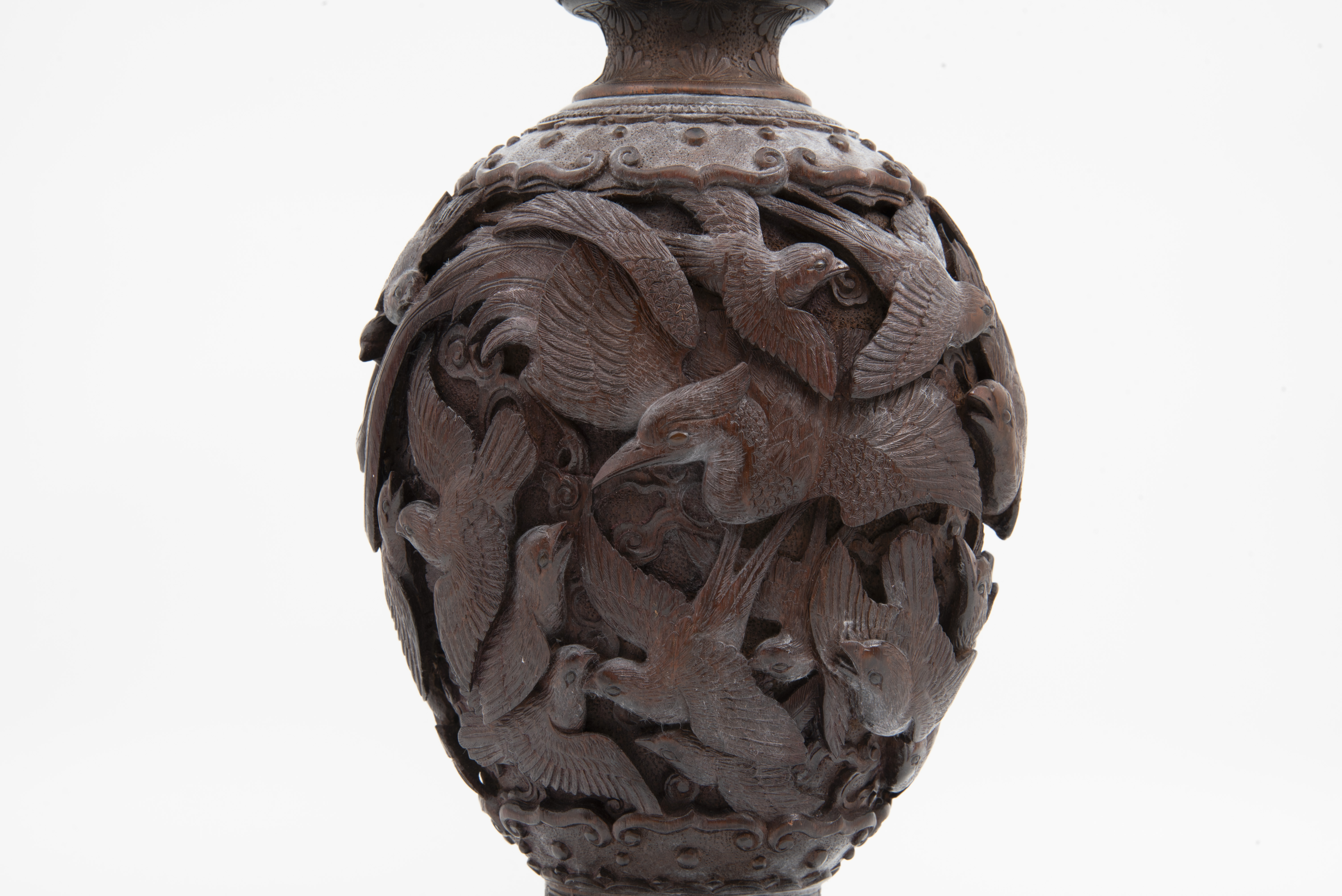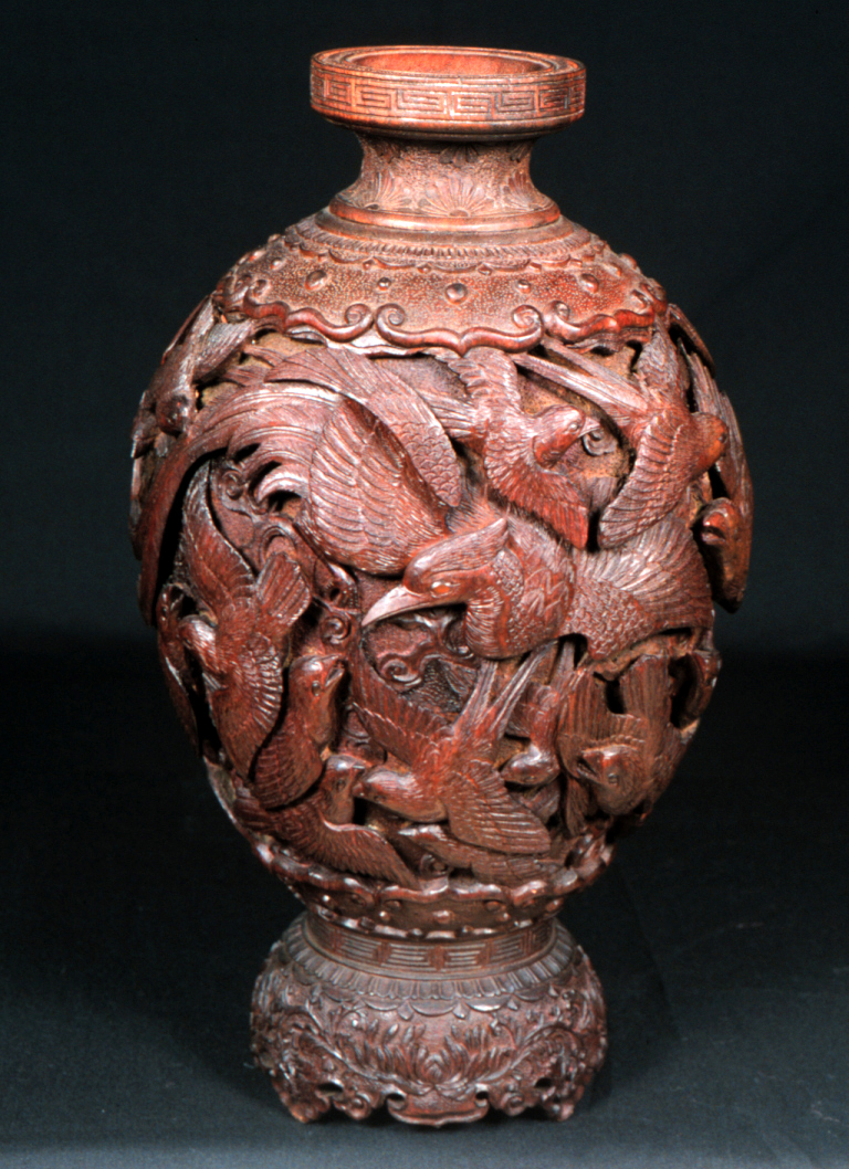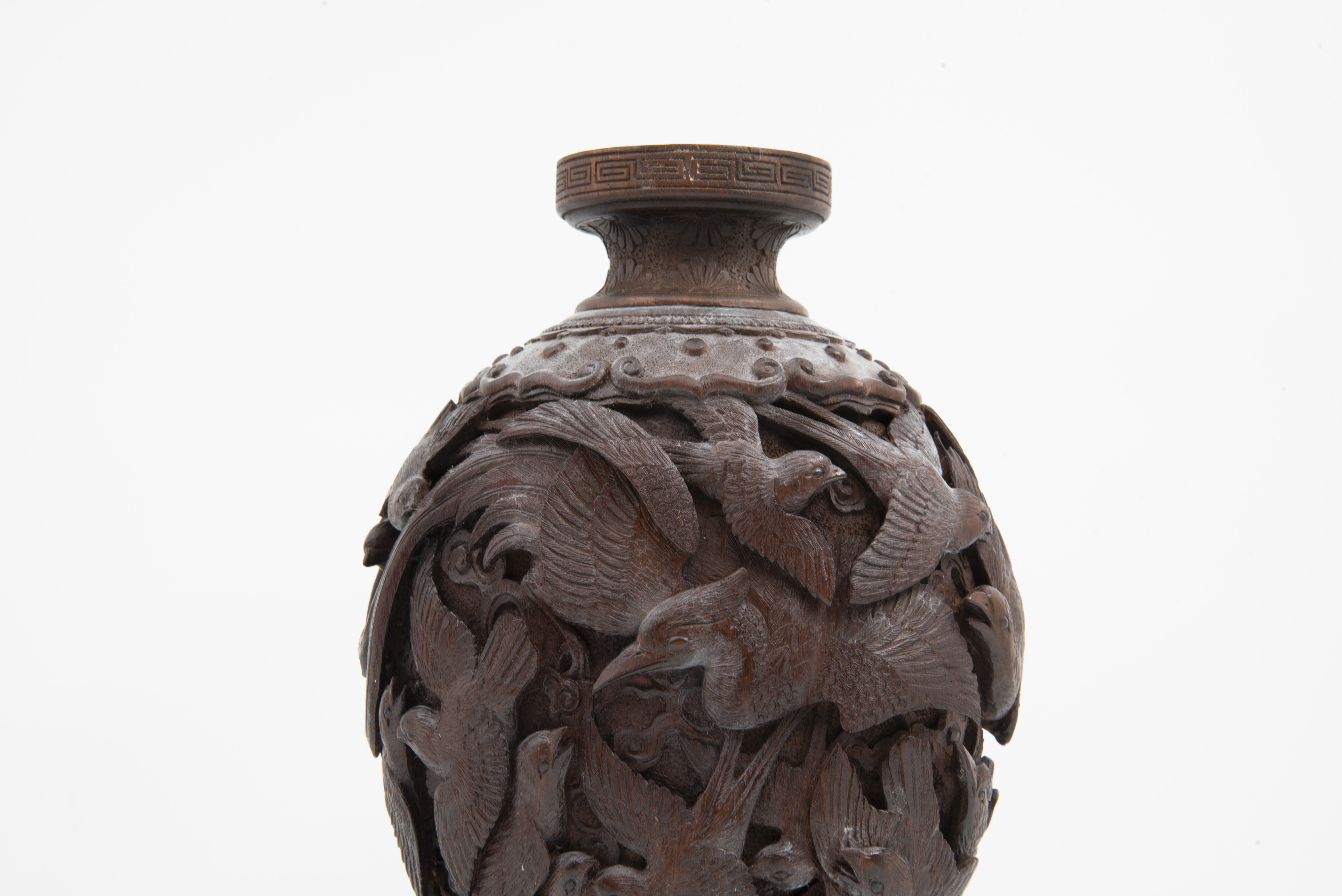 | Description | "A richly and finely carved Japanese vase, bamboo, with the body covered overall with various birds, the shoulder with an ornamental band, key fret motif on rim of mouth, the foot carved and scalloped, height 11 1/2 inches. Dating is late 19th Century, Meiji Period (1868 - 1912). |