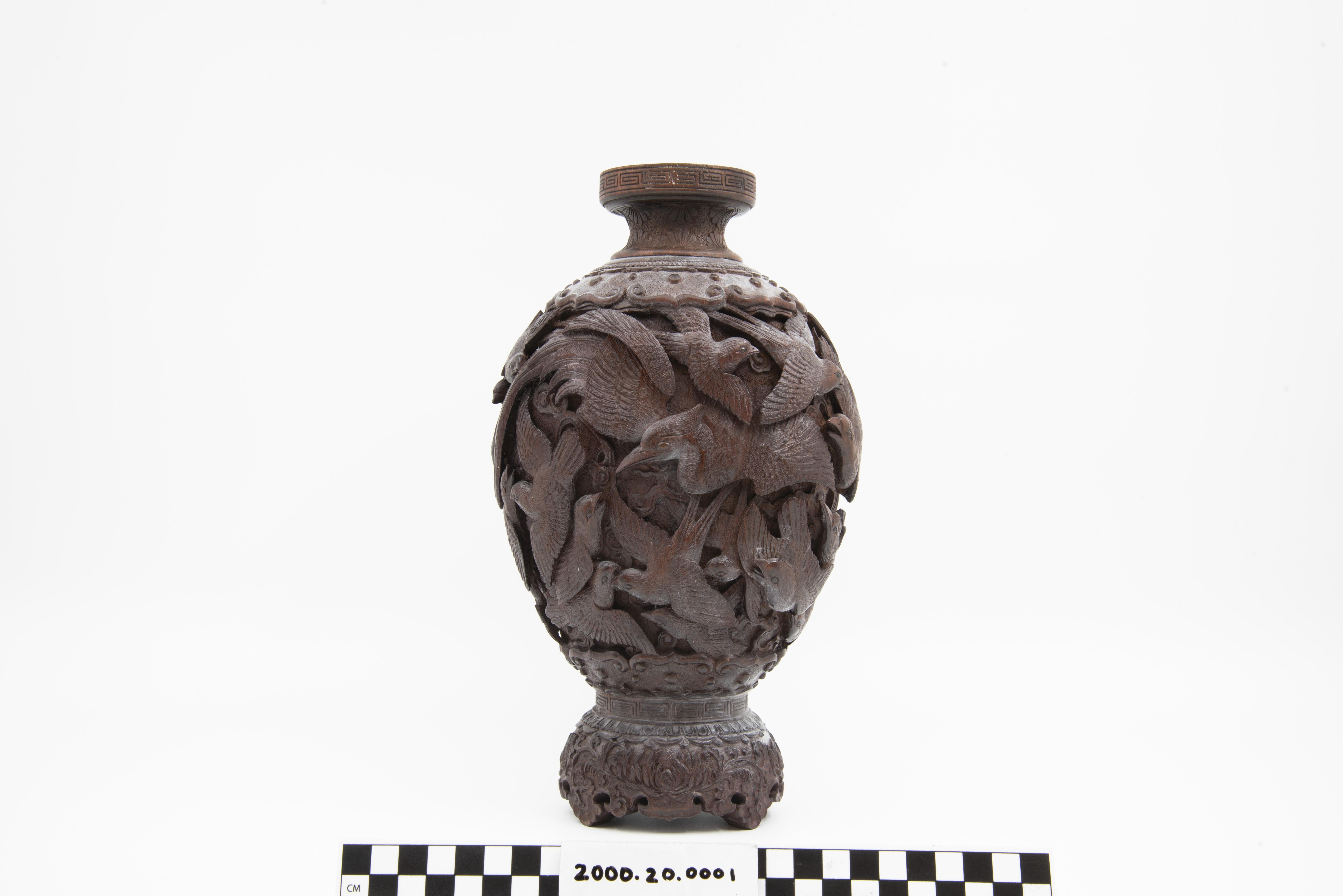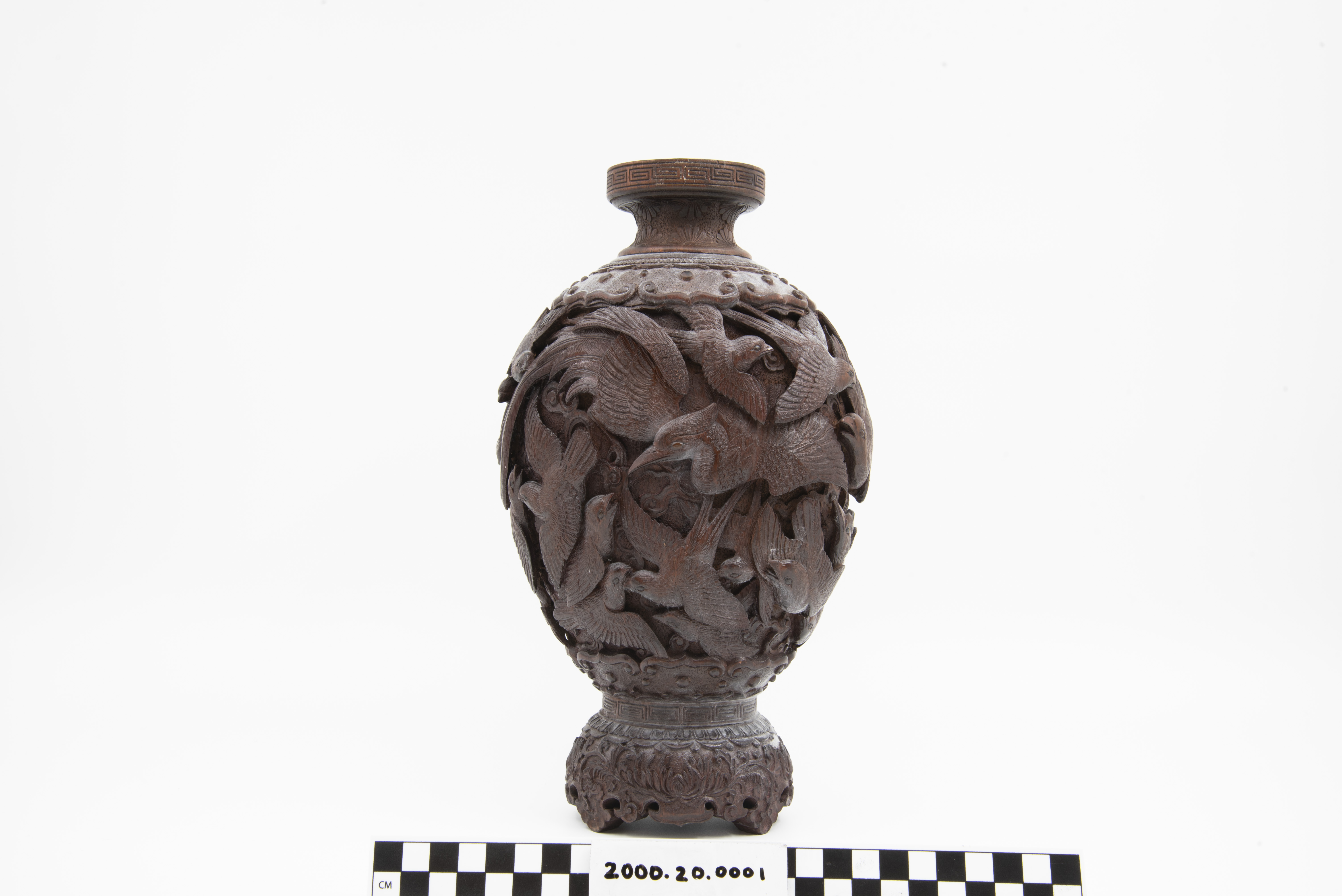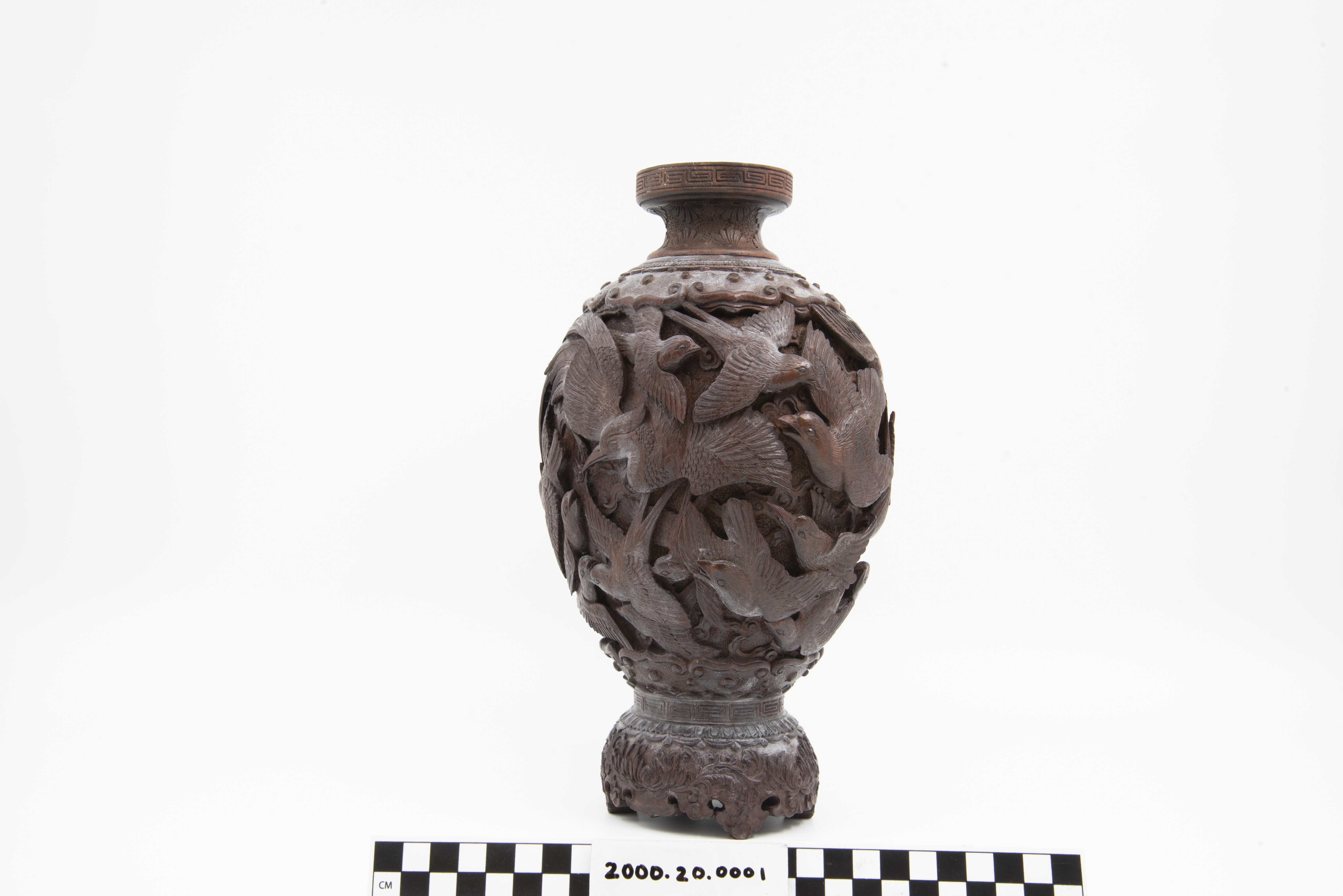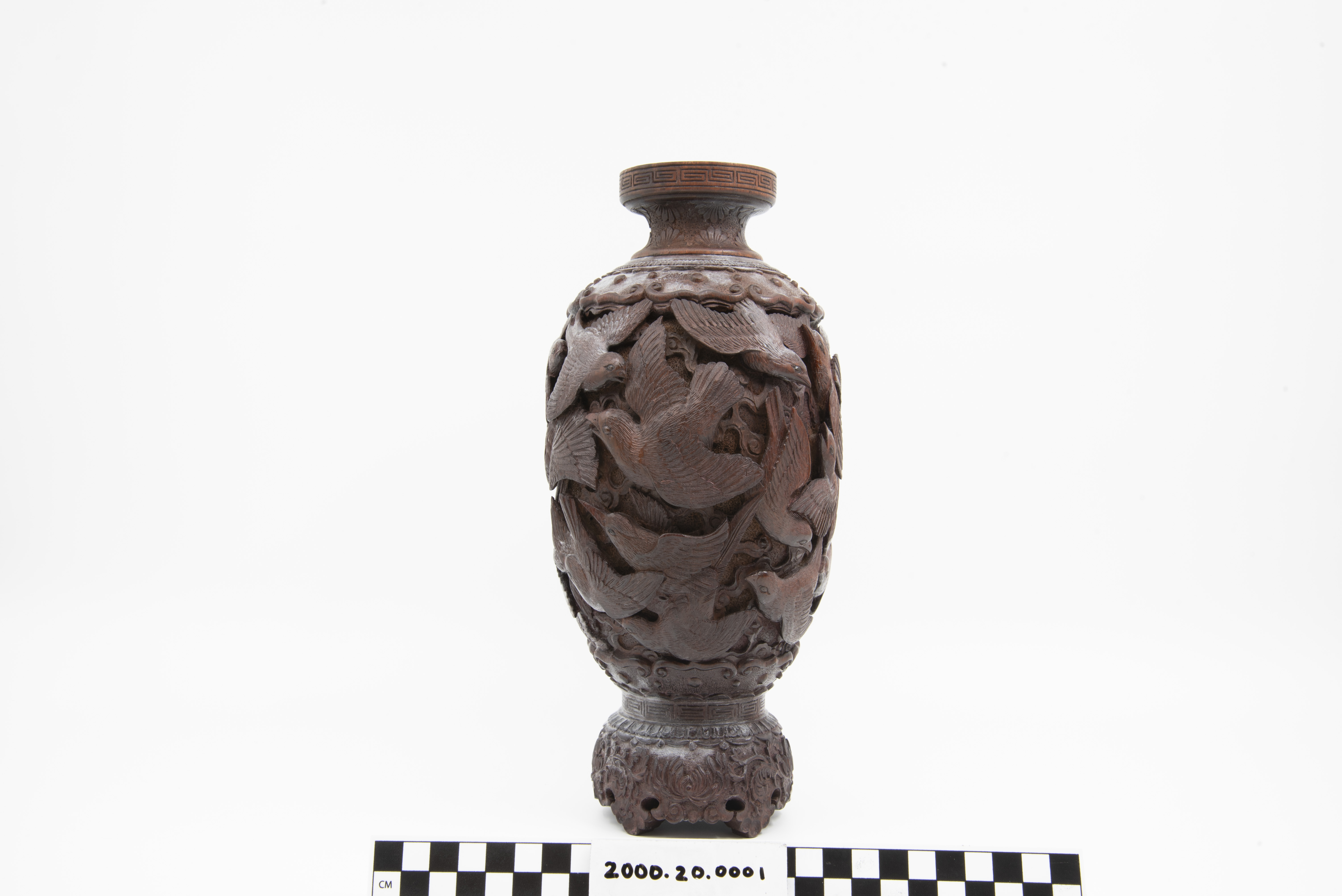 | Description | "A richly and finely carved Japanese vase, bamboo, with the body covered overall with various birds, the shoulder with an ornamental band, key fret motif on rim of mouth, the foot carved and scalloped, height 11 1/2 inches. Dating is late 19th Century, Meiji Period (1868 - 1912). |