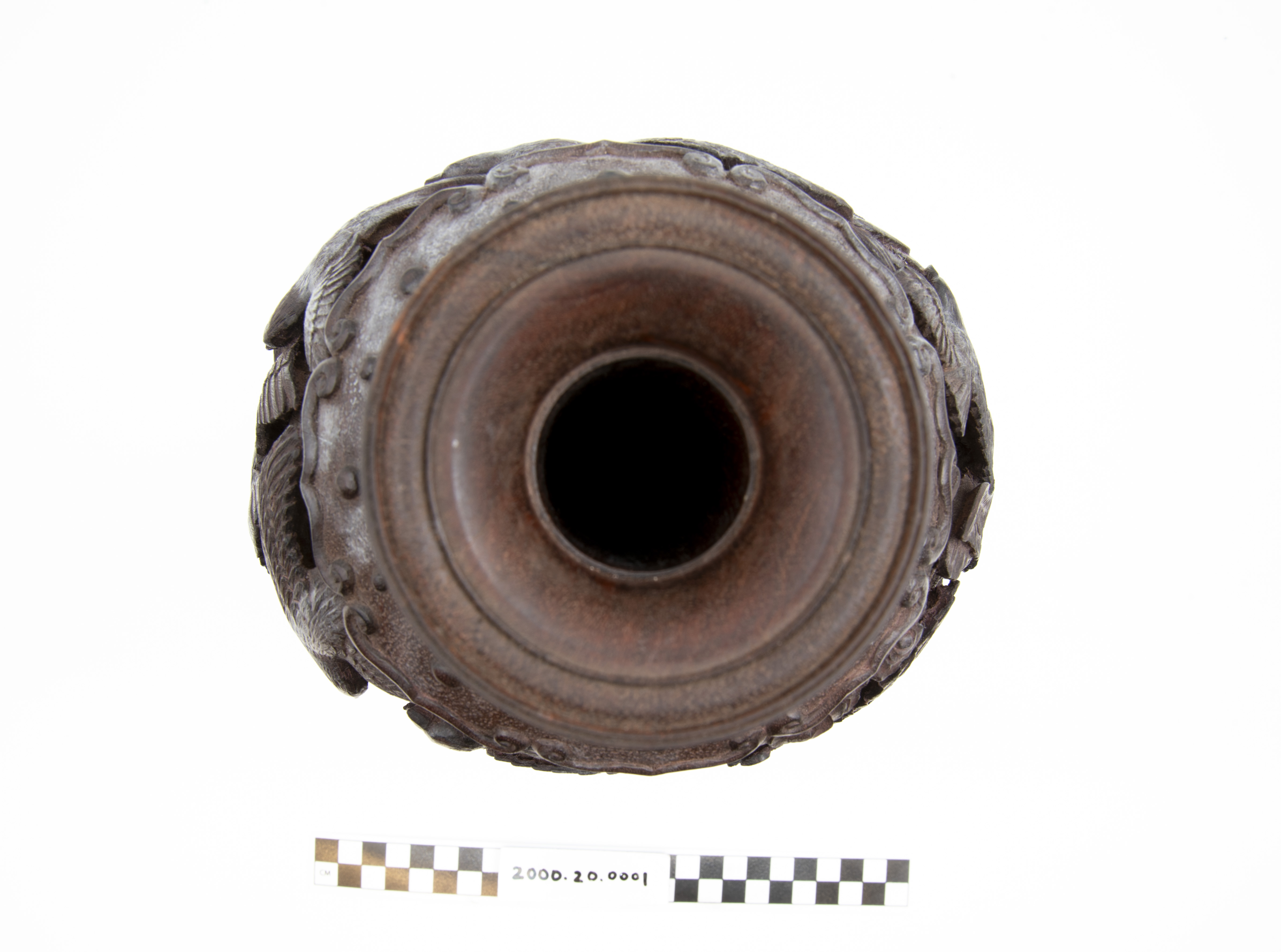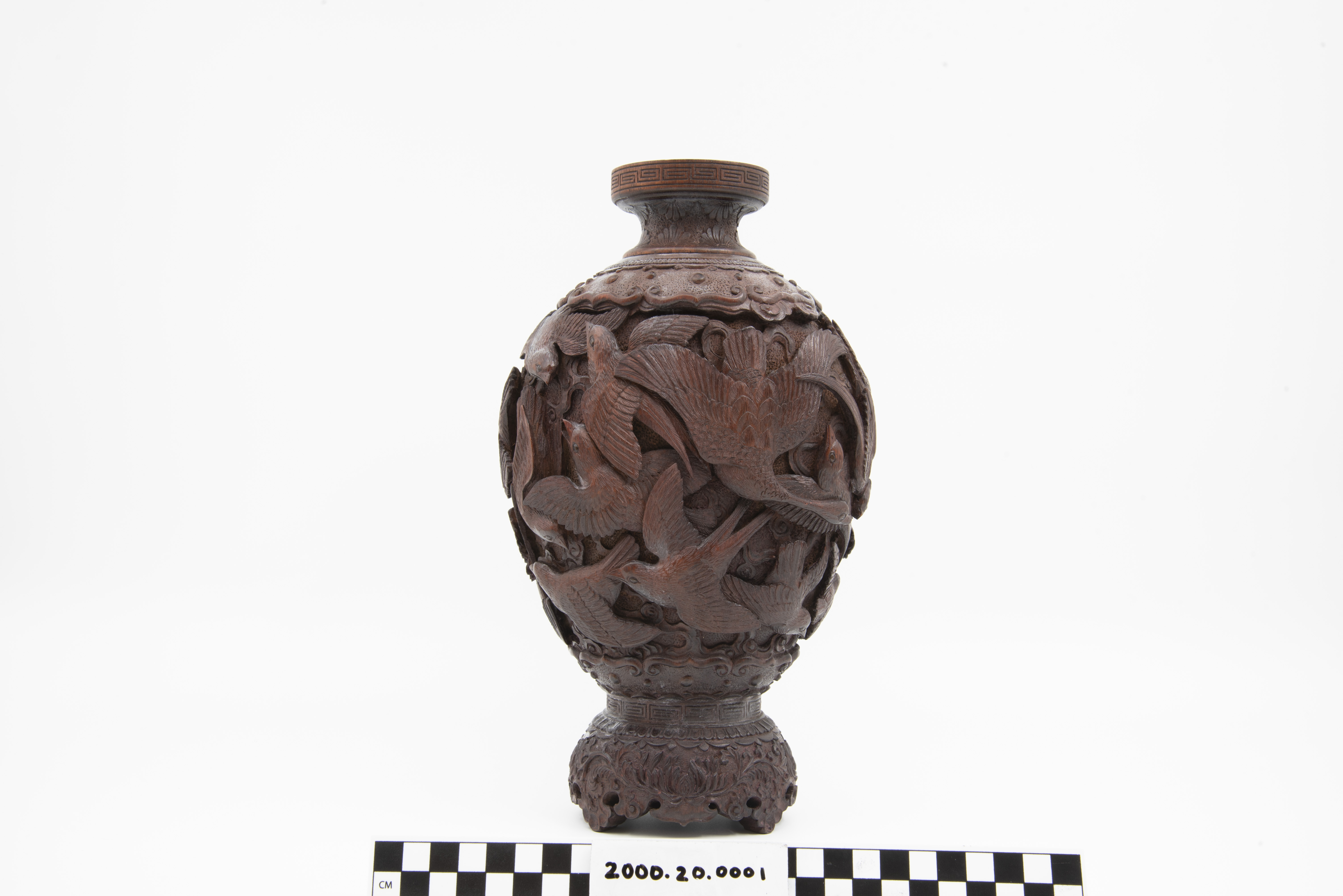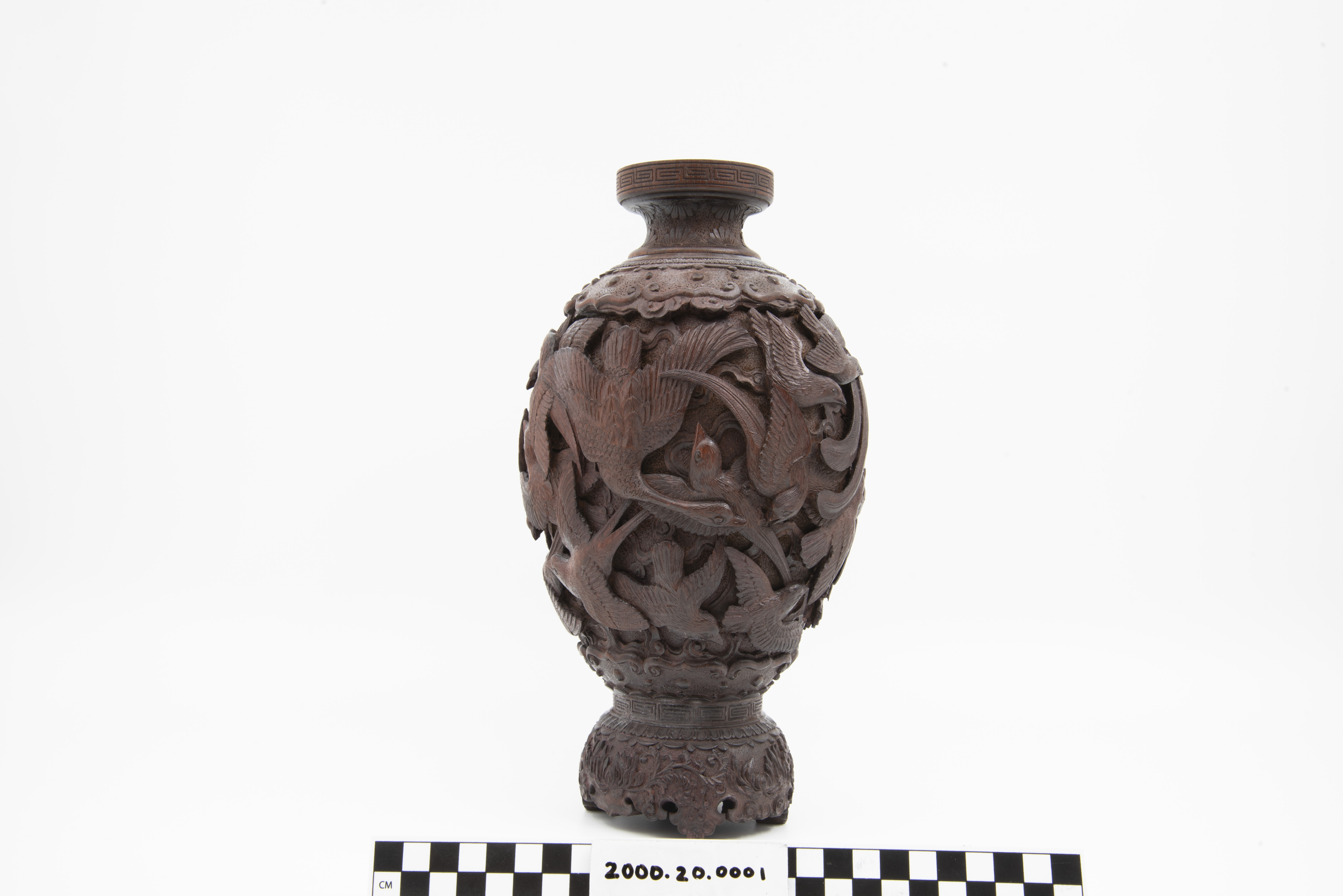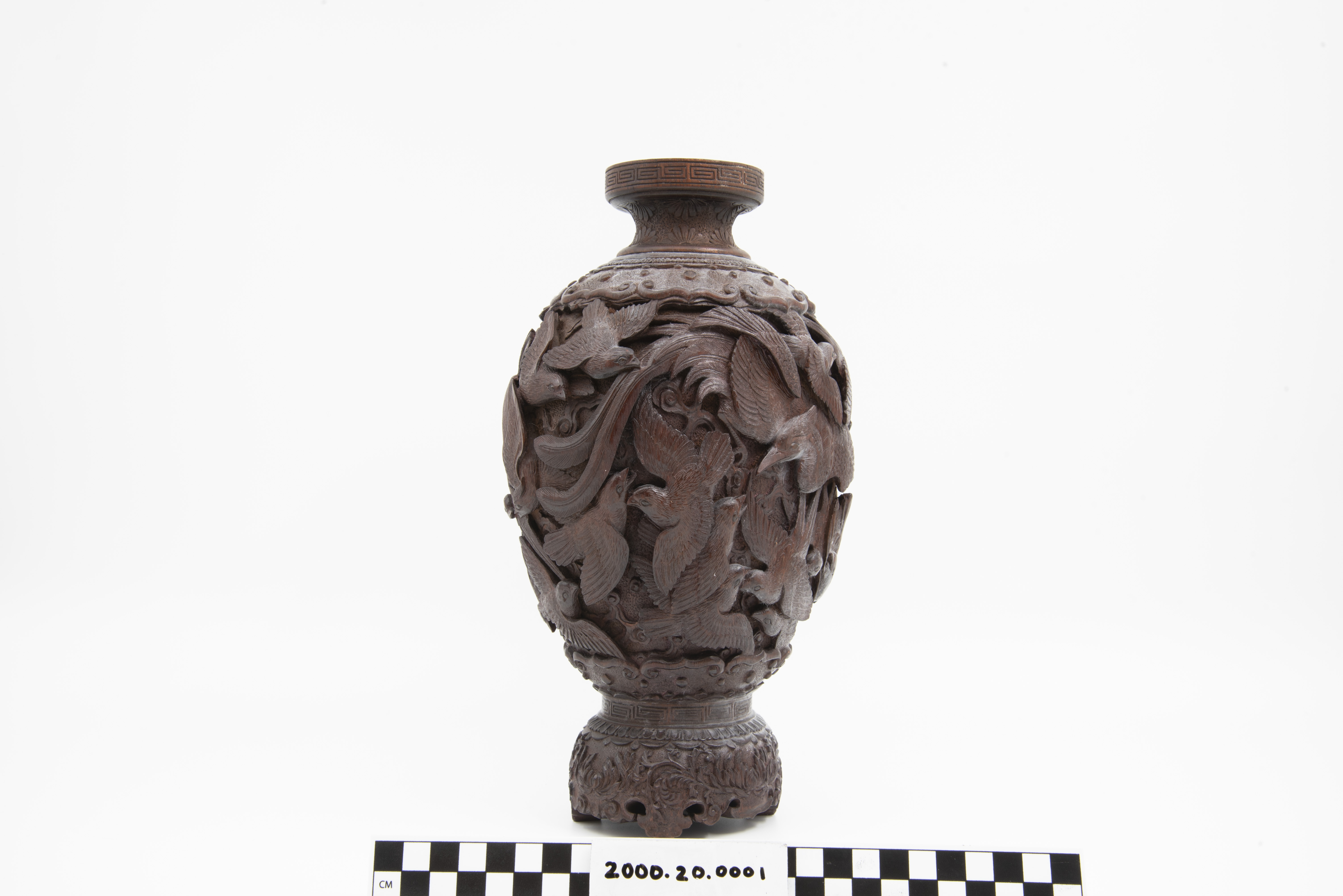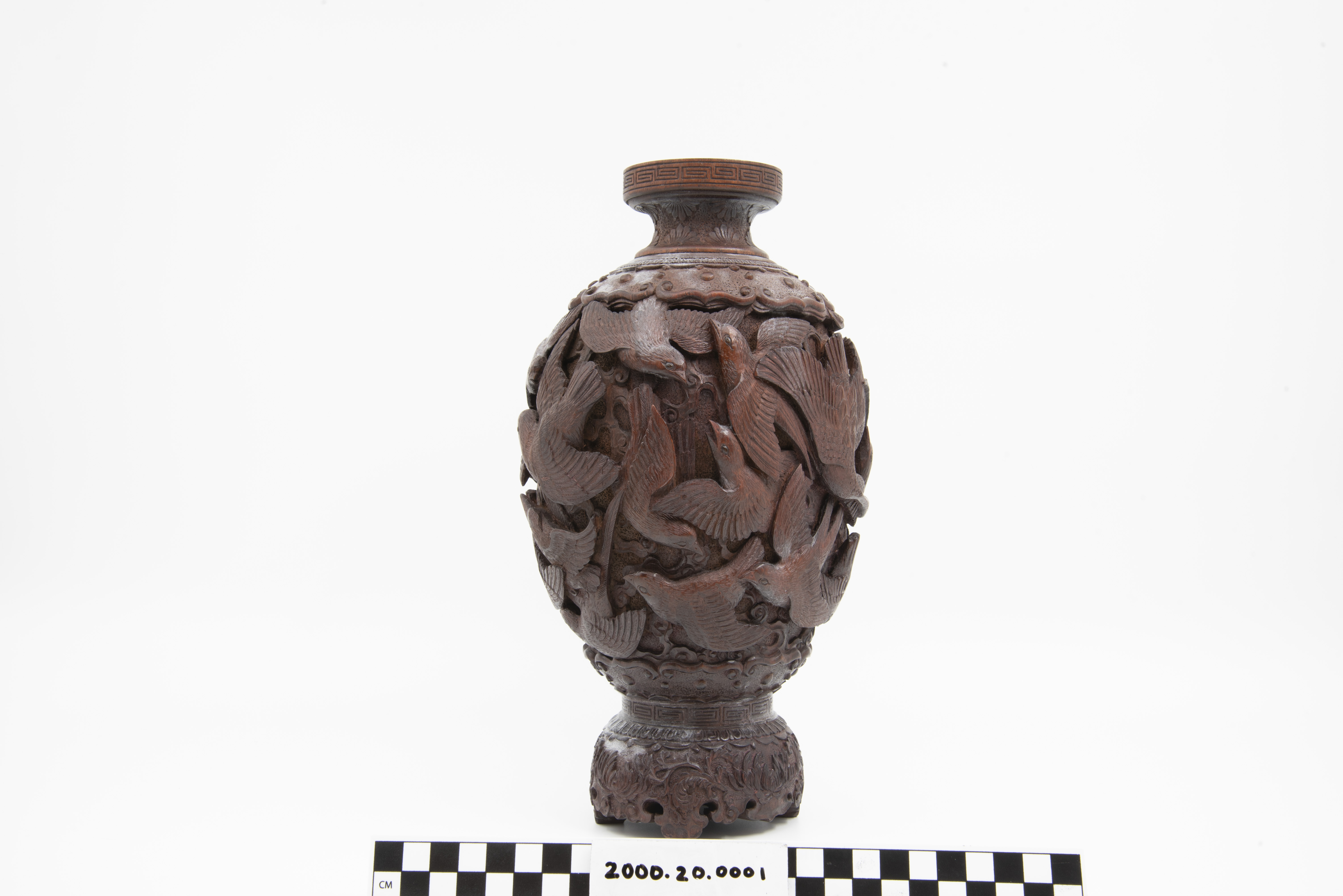 | Description | "A richly and finely carved Japanese vase, bamboo, with the body covered overall with various birds, the shoulder with an ornamental band, key fret motif on rim of mouth, the foot carved and scalloped, height 11 1/2 inches. Dating is late 19th Century, Meiji Period (1868 - 1912). |