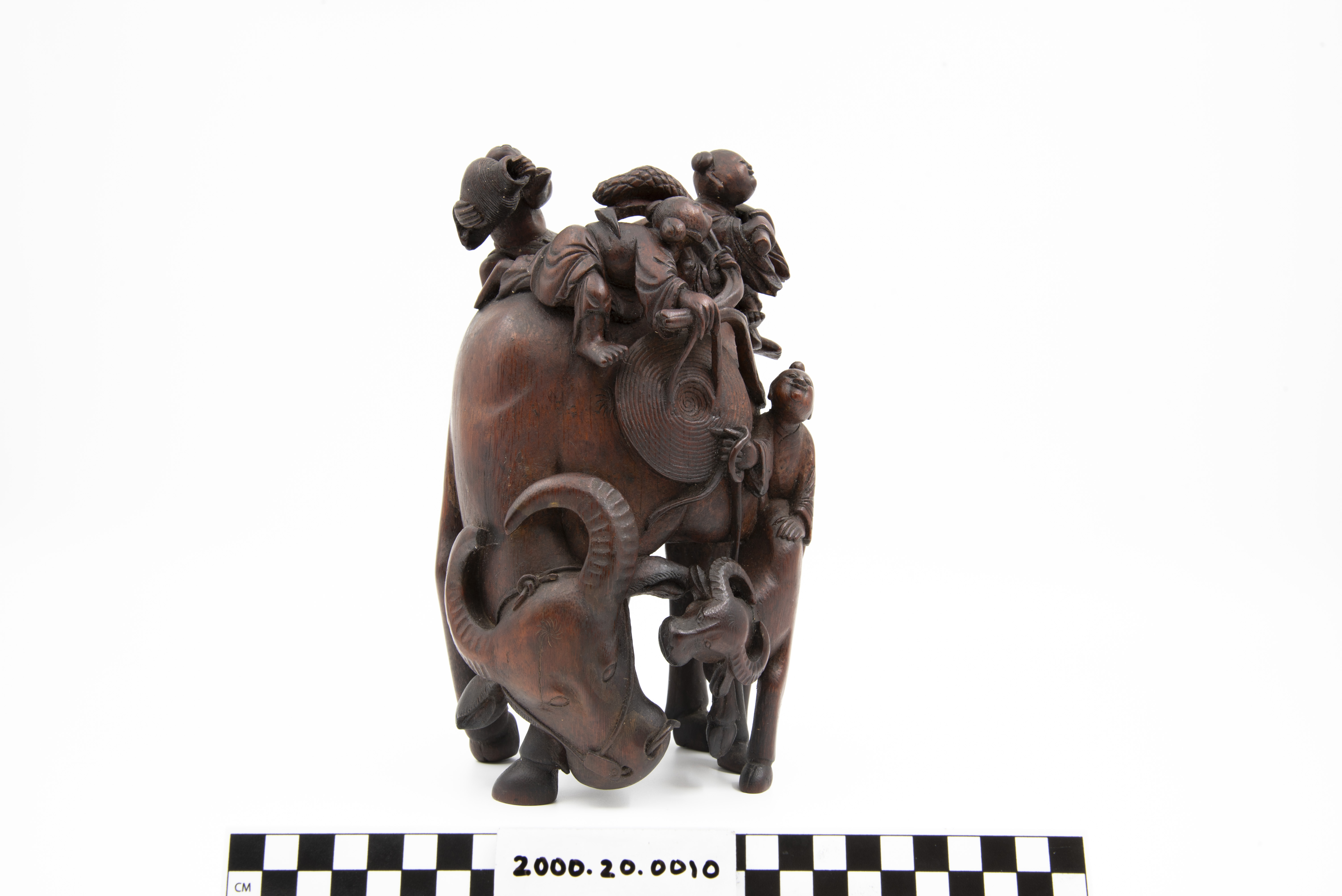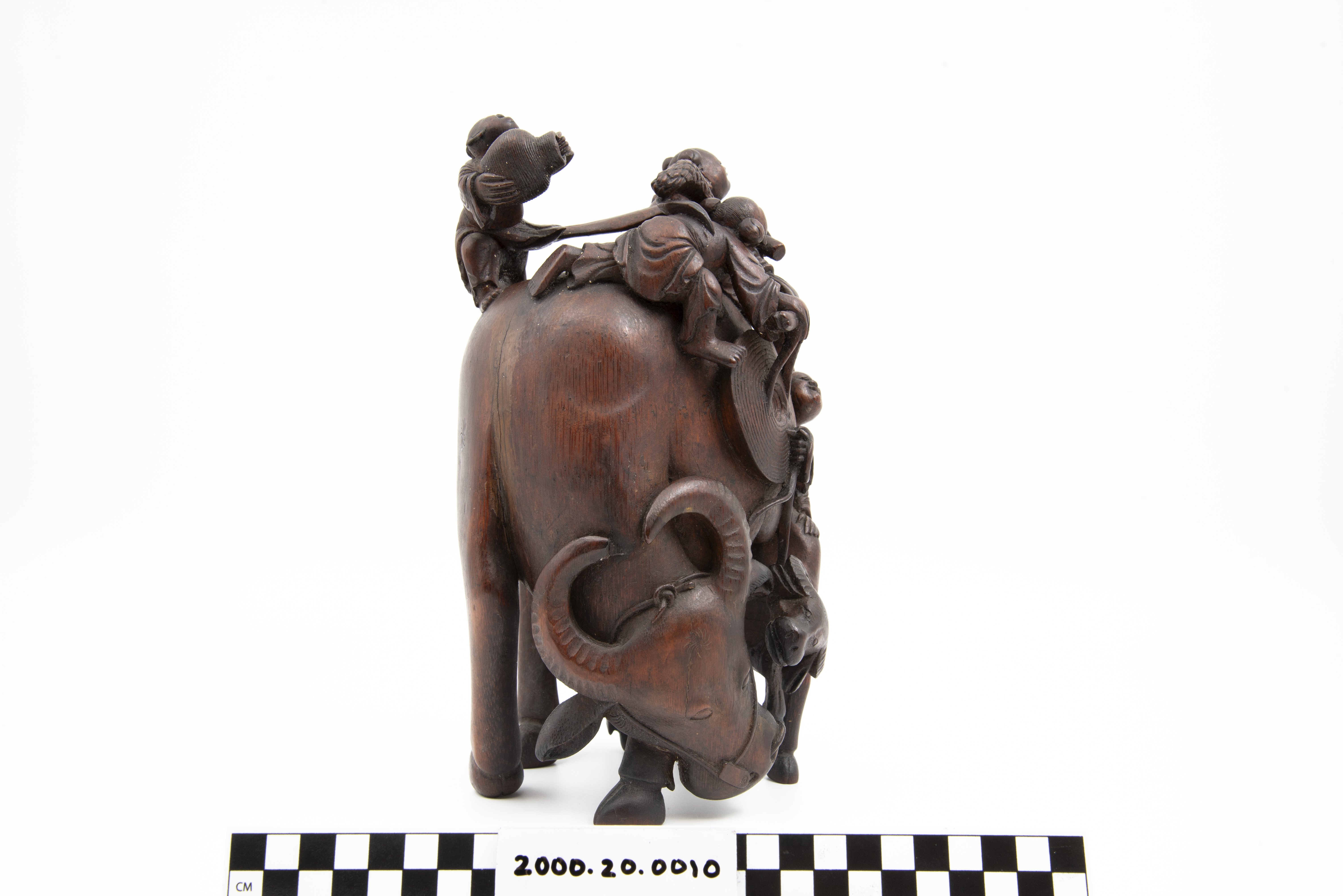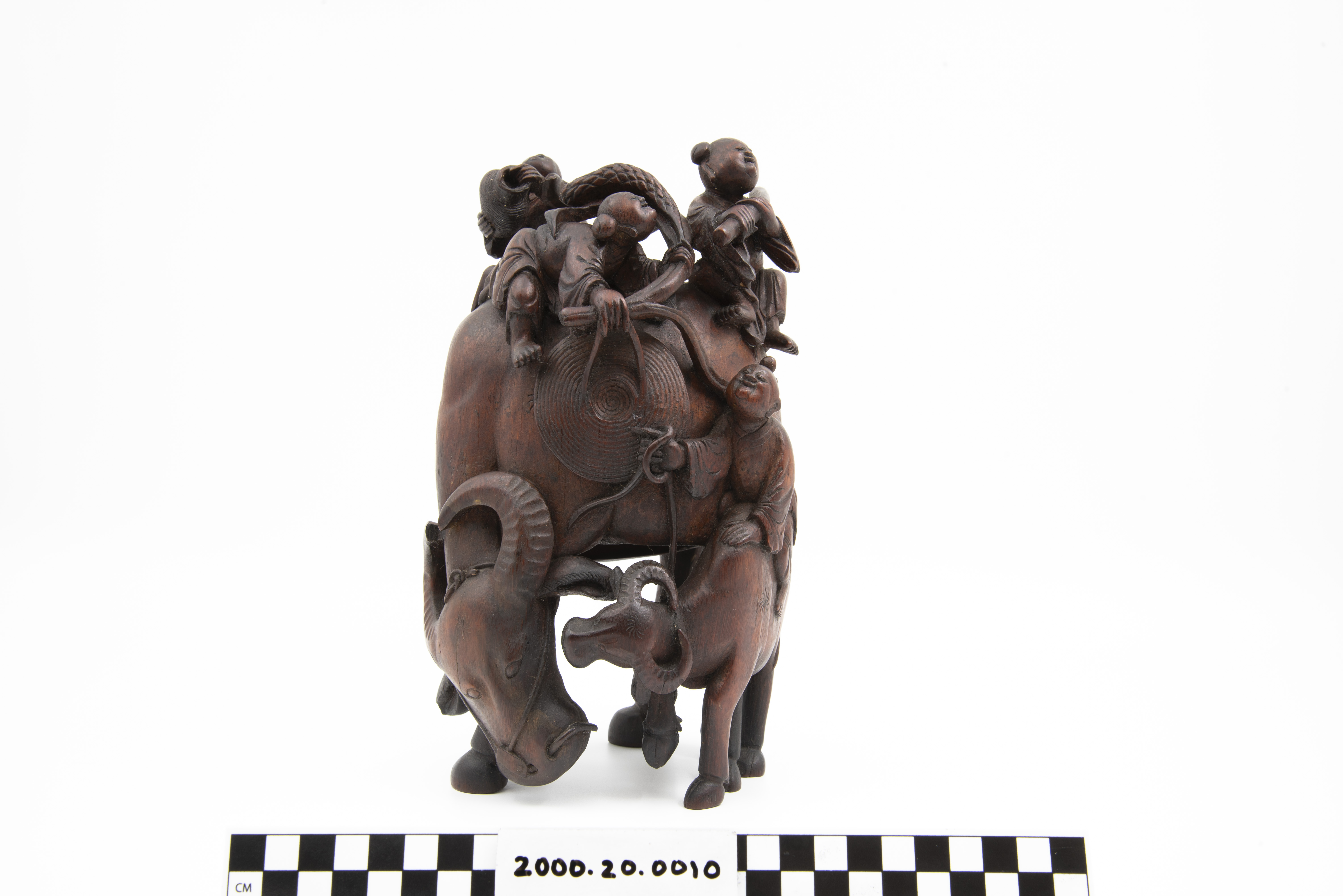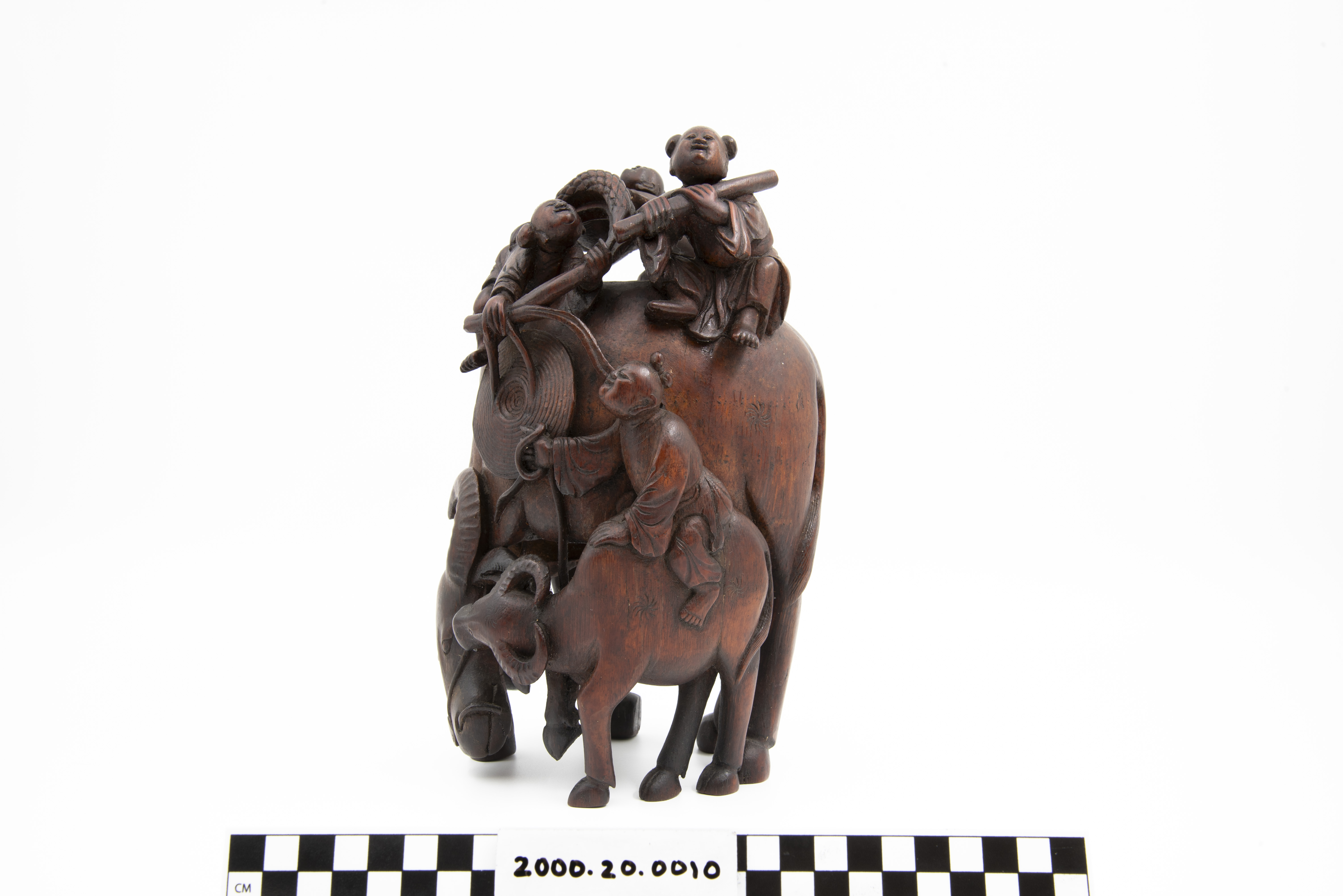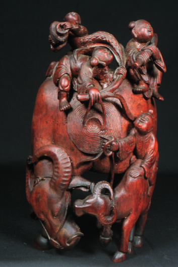 This is a bamboo carving of two water buffalos with riders. Three of the shown figures are Daoist immortals who are riding the larger water buffalo. The fourth figure is astride the second water buffalo. The "Eight Immortals" are legendary beings said to have obtained immortality through their study of the natural world. They can be found in a variety of Chinese art and represent different life conditions (age, aristocracy, masculinity, etc.). Bamboo is a difficult wood to carve and represents longevity given that it flourishes throughout winter.